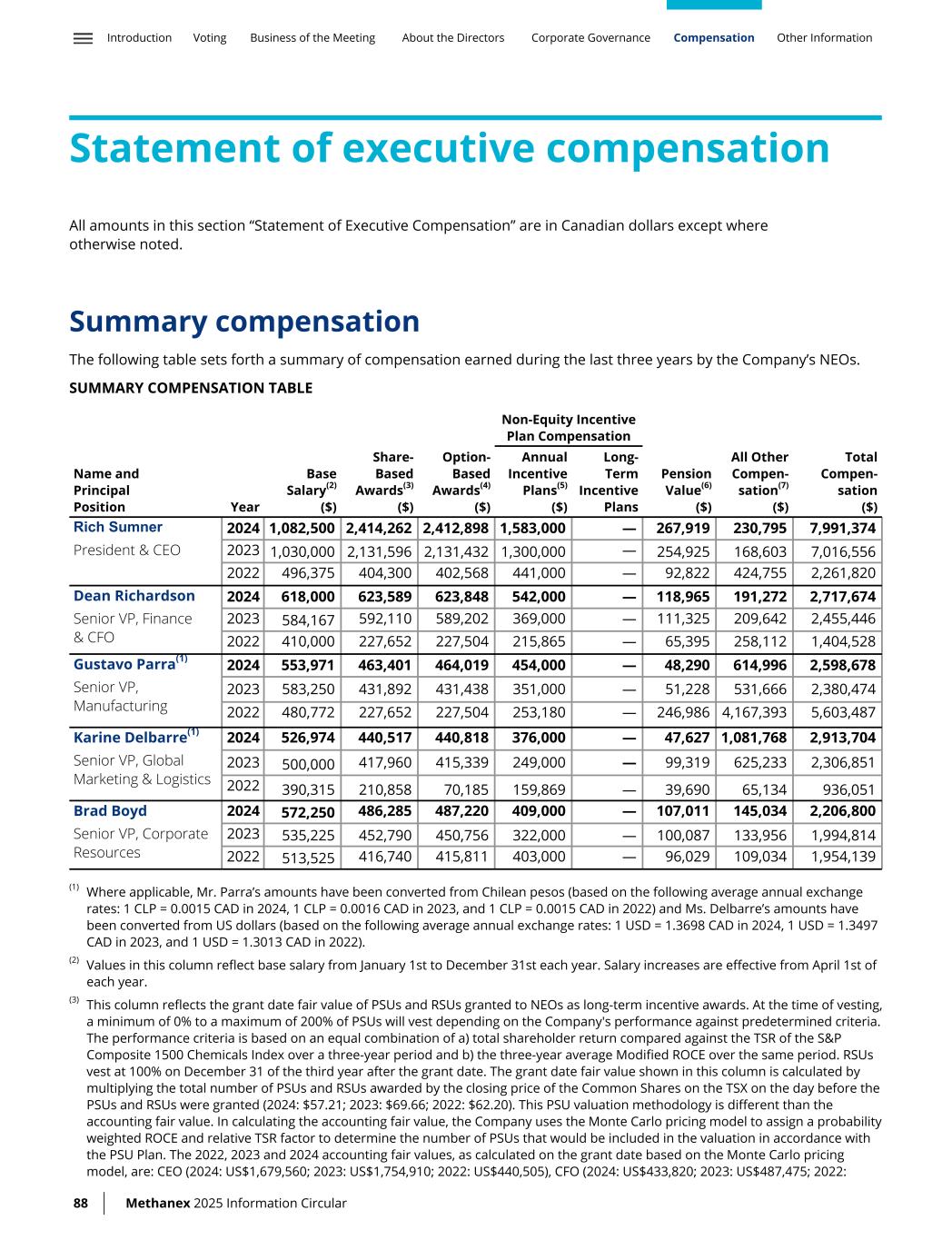 Statement of executive compensation All amounts in this section “Statement of Executive Compensation” are in Canadian dollars except where otherwise noted. Summary compensation The following table sets forth a summary of compensation earned during the last three years by the Company’s NEOs. SUMMARY COMPENSATION TABLE Non-Equity Incentive Plan Compensation Name and Principal Position Year Base Salary(2) ($) Share- Based Awards(3) ($) Option- Based Awards(4) ($) Annual Incentive Plans(5) ($) Long- Term Incentive Plans Pension Value(6) ($) All Other Compen- sation(7) ($) Total Compen- sation ($) Rich Sumner 2024 1,082,500 2,414,262 2,412,898 1,583,000 — 267,919 230,795 7,991,374 President & CEO 2023 1,030,000 2,131,596 2,131,432 1,300,000 — 254,925 168,603 7,016,556 2022 496,375 404,300 402,568 441,000 — 92,822 424,755 2,261,820 Dean Richardson 2024 618,000 623,589 623,848 542,000 — 118,965 191,272 2,717,674 Senior VP, Finance & CFO 2023 584,167 592,110 589,202 369,000 — 111,325 209,642 2,455,446 2022 410,000 227,652 227,504 215,865 — 65,395 258,112 1,404,528 Gustavo Parra(1) 2024 553,971 463,401 464,019 454,000 — 48,290 614,996 2,598,678 Senior VP, Manufacturing 2023 583,250 431,892 431,438 351,000 — 51,228 531,666 2,380,474 2022 480,772 227,652 227,504 253,180 — 246,986 4,167,393 5,603,487 Karine Delbarre(1) 2024 526,974 440,517 440,818 376,000 — 47,627 1,081,768 2,913,704 Senior VP, Global Marketing & Logistics 2023 500,000 417,960 415,339 249,000 — 99,319 625,233 2,306,851 2022 390,315 210,858 70,185 159,869 — 39,690 65,134 936,051 Brad Boyd 2024 572,250 486,285 487,220 409,000 — 107,011 145,034 2,206,800 Senior VP, Corporate Resources 2023 535,225 452,790 450,756 322,000 — 100,087 133,956 1,994,814 2022 513,525 416,740 415,811 403,000 — 96,029 109,034 1,954,139 (1) Where applicable, Mr. Parra’s amounts have been converted from Chilean pesos (based on the following average annual exchange rates: 1 CLP = 0.0015 CAD in 2024, 1 CLP = 0.0016 CAD in 2023, and 1 CLP = 0.0015 CAD in 2022) and Ms. Delbarre’s amounts have been converted from US dollars (based on the following average annual exchange rates: 1 USD = 1.3698 CAD in 2024, 1 USD = 1.3497 CAD in 2023, and 1 USD = 1.3013 CAD in 2022). (2) Values in this column reflect base salary from January 1st to December 31st each year. Salary increases are effective from April 1st of each year. (3) This column reflects the grant date fair value of PSUs and RSUs granted to NEOs as long-term incentive awards. At the time of vesting, a minimum of 0% to a maximum of 200% of PSUs will vest depending on the Company's performance against predetermined criteria. The performance criteria is based on an equal combination of a) total shareholder return compared against the TSR of the S&P Composite 1500 Chemicals Index over a three-year period and b) the three-year average Modified ROCE over the same period. RSUs vest at 100% on December 31 of the third year after the grant date. The grant date fair value shown in this column is calculated by multiplying the total number of PSUs and RSUs awarded by the closing price of the Common Shares on the TSX on the day before the PSUs and RSUs were granted (2024: $57.21; 2023: $69.66; 2022: $62.20). This PSU valuation methodology is different than the accounting fair value. In calculating the accounting fair value, the Company uses the Monte Carlo pricing model to assign a probability weighted ROCE and relative TSR factor to determine the number of PSUs that would be included in the valuation in accordance with the PSU Plan. The 2022, 2023 and 2024 accounting fair values, as calculated on the grant date based on the Monte Carlo pricing model, are: CEO (2024: US$1,679,560; 2023: US$1,754,910; 2022: US$440,505), CFO (2024: US$433,820; 2023: US$487,475; 2022: Introduction Voting Business of the Meeting About the Directors Corporate Governance Compensation Other Information 88 Methanex 2025 Information Circular