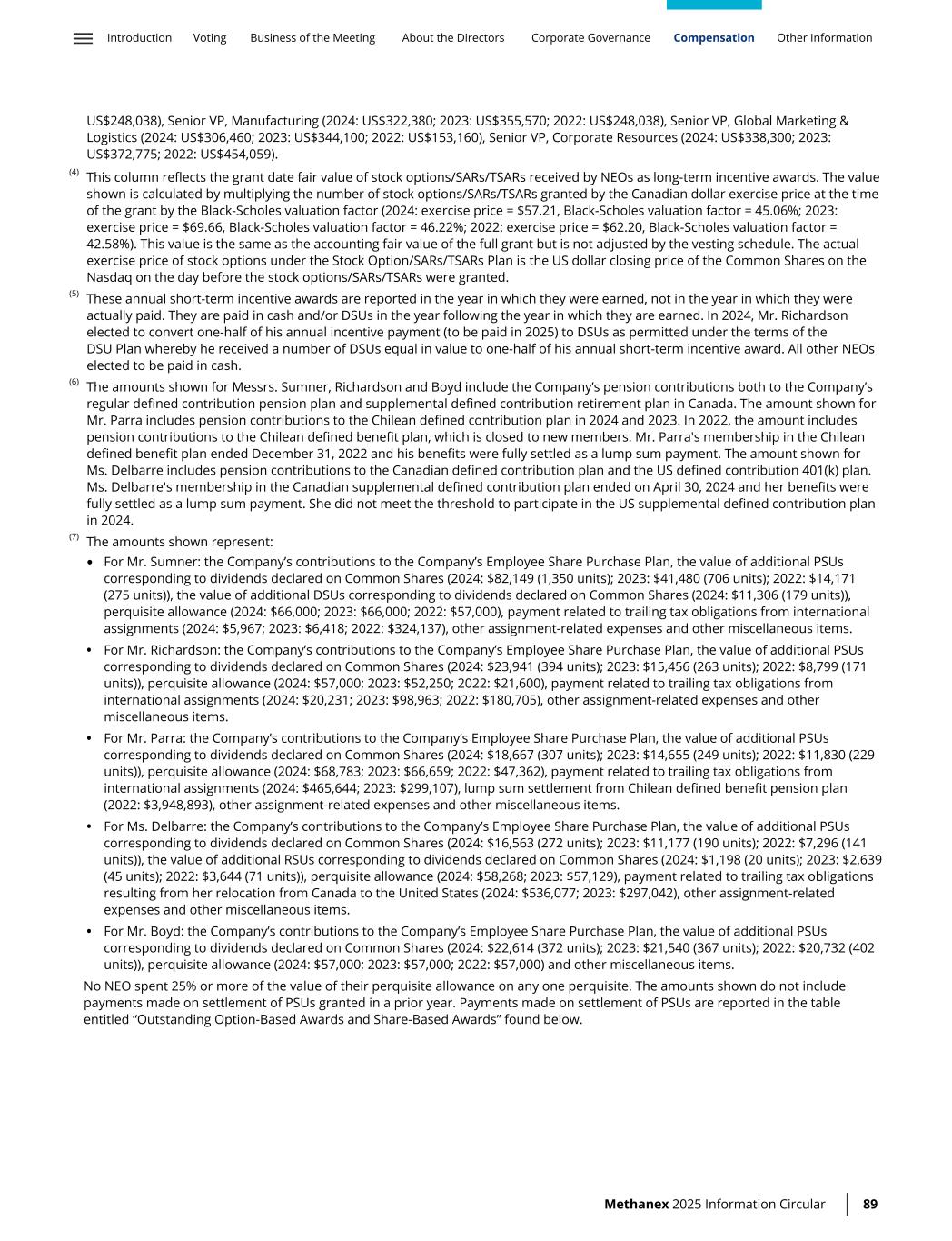 US$248,038), Senior VP, Manufacturing (2024: US$322,380; 2023: US$355,570; 2022: US$248,038), Senior VP, Global Marketing & Logistics (2024: US$306,460; 2023: US$344,100; 2022: US$153,160), Senior VP, Corporate Resources (2024: US$338,300; 2023: US$372,775; 2022: US$454,059). (4) This column reflects the grant date fair value of stock options/SARs/TSARs received by NEOs as long-term incentive awards. The value shown is calculated by multiplying the number of stock options/SARs/TSARs granted by the Canadian dollar exercise price at the time of the grant by the Black-Scholes valuation factor (2024: exercise price = $57.21, Black-Scholes valuation factor = 45.06%; 2023: exercise price = $69.66, Black-Scholes valuation factor = 46.22%; 2022: exercise price = $62.20, Black-Scholes valuation factor = 42.58%). This value is the same as the accounting fair value of the full grant but is not adjusted by the vesting schedule. The actual exercise price of stock options under the Stock Option/SARs/TSARs Plan is the US dollar closing price of the Common Shares on the Nasdaq on the day before the stock options/SARs/TSARs were granted. (5) These annual short-term incentive awards are reported in the year in which they were earned, not in the year in which they were actually paid. They are paid in cash and/or DSUs in the year following the year in which they are earned. In 2024, Mr. Richardson elected to convert one-half of his annual incentive payment (to be paid in 2025) to DSUs as permitted under the terms of the DSU Plan whereby he received a number of DSUs equal in value to one-half of his annual short-term incentive award. All other NEOs elected to be paid in cash. (6) The amounts shown for Messrs. Sumner, Richardson and Boyd include the Company’s pension contributions both to the Company’s regular defined contribution pension plan and supplemental defined contribution retirement plan in Canada. The amount shown for Mr. Parra includes pension contributions to the Chilean defined contribution plan in 2024 and 2023. In 2022, the amount includes pension contributions to the Chilean defined benefit plan, which is closed to new members. Mr. Parra's membership in the Chilean defined benefit plan ended December 31, 2022 and his benefits were fully settled as a lump sum payment. The amount shown for Ms. Delbarre includes pension contributions to the Canadian defined contribution plan and the US defined contribution 401(k) plan. Ms. Delbarre's membership in the Canadian supplemental defined contribution plan ended on April 30, 2024 and her benefits were fully settled as a lump sum payment. She did not meet the threshold to participate in the US supplemental defined contribution plan in 2024. (7) The amounts shown represent: • For Mr. Sumner: the Company’s contributions to the Company’s Employee Share Purchase Plan, the value of additional PSUs corresponding to dividends declared on Common Shares (2024: $82,149 (1,350 units); 2023: $41,480 (706 units); 2022: $14,171 (275 units)), the value of additional DSUs corresponding to dividends declared on Common Shares (2024: $11,306 (179 units)), perquisite allowance (2024: $66,000; 2023: $66,000; 2022: $57,000), payment related to trailing tax obligations from international assignments (2024: $5,967; 2023: $6,418; 2022: $324,137), other assignment-related expenses and other miscellaneous items. • For Mr. Richardson: the Company’s contributions to the Company’s Employee Share Purchase Plan, the value of additional PSUs corresponding to dividends declared on Common Shares (2024: $23,941 (394 units); 2023: $15,456 (263 units); 2022: $8,799 (171 units)), perquisite allowance (2024: $57,000; 2023: $52,250; 2022: $21,600), payment related to trailing tax obligations from international assignments (2024: $20,231; 2023: $98,963; 2022: $180,705), other assignment-related expenses and other miscellaneous items. • For Mr. Parra: the Company’s contributions to the Company’s Employee Share Purchase Plan, the value of additional PSUs corresponding to dividends declared on Common Shares (2024: $18,667 (307 units); 2023: $14,655 (249 units); 2022: $11,830 (229 units)), perquisite allowance (2024: $68,783; 2023: $66,659; 2022: $47,362), payment related to trailing tax obligations from international assignments (2024: $465,644; 2023: $299,107), lump sum settlement from Chilean defined benefit pension plan (2022: $3,948,893), other assignment-related expenses and other miscellaneous items. • For Ms. Delbarre: the Company’s contributions to the Company’s Employee Share Purchase Plan, the value of additional PSUs corresponding to dividends declared on Common Shares (2024: $16,563 (272 units); 2023: $11,177 (190 units); 2022: $7,296 (141 units)), the value of additional RSUs corresponding to dividends declared on Common Shares (2024: $1,198 (20 units); 2023: $2,639 (45 units); 2022: $3,644 (71 units)), perquisite allowance (2024: $58,268; 2023: $57,129), payment related to trailing tax obligations resulting from her relocation from Canada to the United States (2024: $536,077; 2023: $297,042), other assignment-related expenses and other miscellaneous items. • For Mr. Boyd: the Company’s contributions to the Company’s Employee Share Purchase Plan, the value of additional PSUs corresponding to dividends declared on Common Shares (2024: $22,614 (372 units); 2023: $21,540 (367 units); 2022: $20,732 (402 units)), perquisite allowance (2024: $57,000; 2023: $57,000; 2022: $57,000) and other miscellaneous items. No NEO spent 25% or more of the value of their perquisite allowance on any one perquisite. The amounts shown do not include payments made on settlement of PSUs granted in a prior year. Payments made on settlement of PSUs are reported in the table entitled “Outstanding Option-Based Awards and Share-Based Awards” found below. Introduction Voting Business of the Meeting About the Directors Corporate Governance Compensation Other Information Methanex 20