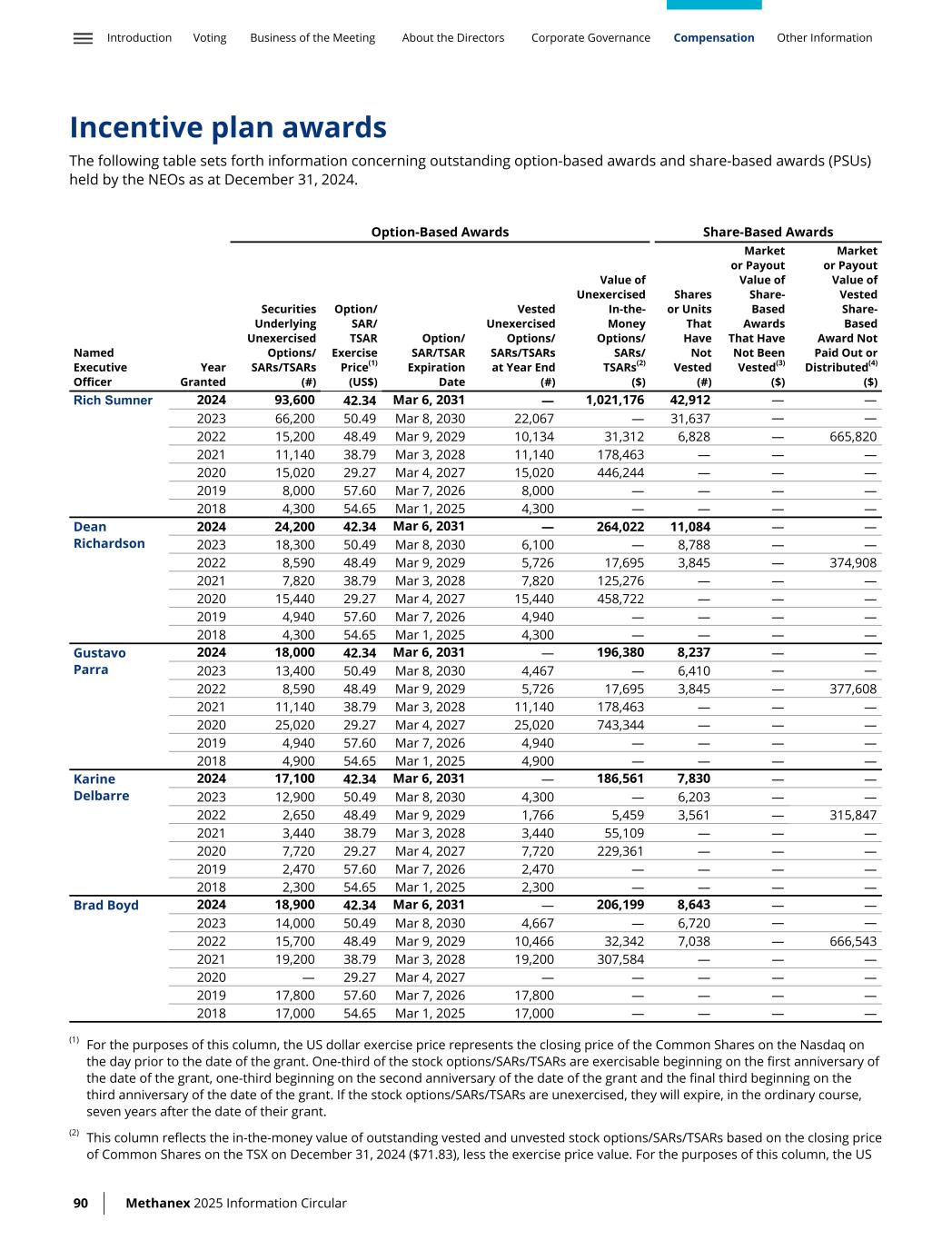 Incentive plan awards The following table sets forth information concerning outstanding option-based awards and share-based awards (PSUs) held by the NEOs as at December 31, 2024. Option-Based Awards Share-Based Awards Named Executive Officer Year Granted Securities Underlying Unexercised Options/ SARs/TSARs (#) Option/ SAR/ TSAR Exercise Price(1) (US$) Option/ SAR/TSAR Expiration Date Vested Unexercised Options/ SARs/TSARs at Year End (#) Value of Unexercised In-the- Money Options/ SARs/ TSARs(2) ($) Shares or Units That Have Not Vested (#) Market or Payout Value of Share- Based Awards That Have Not Been Vested(3) ($) Market or Payout Value of Vested Share- Based Award Not Paid Out or Distributed(4) ($) Rich Sumner 2024 93,600 42.34 Mar 6, 2031 — 1,021,176 42,912 — — 2023 66,200 50.49 Mar 8, 2030 22,067 — 31,637 — — 2022 15,200 48.49 Mar 9, 2029 10,134 31,312 6,828 — 665,820 2021 11,140 38.79 Mar 3, 2028 11,140 178,463 — — — 2020 15,020 29.27 Mar 4, 2027 15,020 446,244 — — — 2019 8,000 57.60 Mar 7, 2026 8,000 — — — — 2018 4,300 54.65 Mar 1, 2025 4,300 — — — — Dean Richardson 2024 24,200 42.34 Mar 6, 2031 — 264,022 11,084 — — 2023 18,300 50.49 Mar 8, 2030 6,100 — 8,788 — — 2022 8,590 48.49 Mar 9, 2029 5,726 17,695 3,845 — 374,908 2021 7,820 38.79 Mar 3, 2028 7,820 125,276 — — — 2020 15,440 29.27 Mar 4, 2027 15,440 458,722 — — — 2019 4,940 57.60 Mar 7, 2026 4,940 — — — — 2018 4,300 54.65 Mar 1, 2025 4,300 — — — — Gustavo Parra 2024 18,000 42.34 Mar 6, 2031 — 196,380 8,237 — — 2023 13,400 50.49 Mar 8, 2030 4,467 — 6,410 — — 2022 8,590 48.49 Mar 9, 2029 5,726 17,695 3,845 — 377,608 2021 11,140 38.79 Mar 3, 2028 11,140 178,463 — — — 2020 25,020 29.27 Mar 4, 2027 25,020 743,344 — — — 2019 4,940 57.60 Mar 7, 2026 4,940 — — — — 2018 4,900 54.65 Mar 1, 2025 4,900 — — — — Karine Delbarre 2024 17,100 42.34 Mar 6, 2031 — 186,561 7,830 — — 2023 12,900 50.49 Mar 8, 2030 4,300 — 6,203 — — 2022 2,650 48.49 Mar 9, 2029 1,766 5,459 3,561 — 315,847 2021 3,440 38.79 Mar 3, 2028 3,440 55,109 — — — 2020 7,720 29.27 Mar 4, 2027 7,720 229,361 — — — 2019 2,470 57.60 Mar 7, 2026 2,470 — — — — 2018 2,300 54.65 Mar 1, 2025 2,300 — — — — Brad Boyd 2024 18,900 42.34 Mar 6, 2031 — 206,199 8,643 — — 2023 14,000 50.49 Mar 8, 2030 4,667 — 6,720 — — 2022 15,700 48.49 Mar 9, 2029 10,466 32,342 7,038 — 666,543 2021 19,200 38.79 Mar 3, 2028 19,200 307,584 — — — 2020 — 29.27 Mar 4, 2027 — — — — — 2019 17,800 57.60 Mar 7, 2026 17,800 — — — — 2018 17,000 54.65 Mar 1, 2025 17,000 — — — — (1) For the purposes of this column, the US dollar exercise price represents the closing price of the Common Shares on the Nasdaq on the day prior to the date of the grant. One-third of the stock options/SARs/TSARs are exercisable beginning on the first anniversary of the date of the grant, one-third beginning on the second anniversary of the date of the grant and the final third beginning on the third anniversary of the date of the grant. If the stock options/SARs/TSARs are unexercised, they will expire, in the ordinary course, seven years after the date of their grant. (2) This column reflects the in-the-money value of outstanding vested and unvested stock options/SARs/TSARs based on the closing price of Common Shares on the TSX on December 31, 2024 ($71.83), less the exercise price value. For the purposes of this column, the US Introduction Voting Business of the Meeting About the Directors Corporate Governance Compensation Other Information 90 Methanex 2025 Information Circular