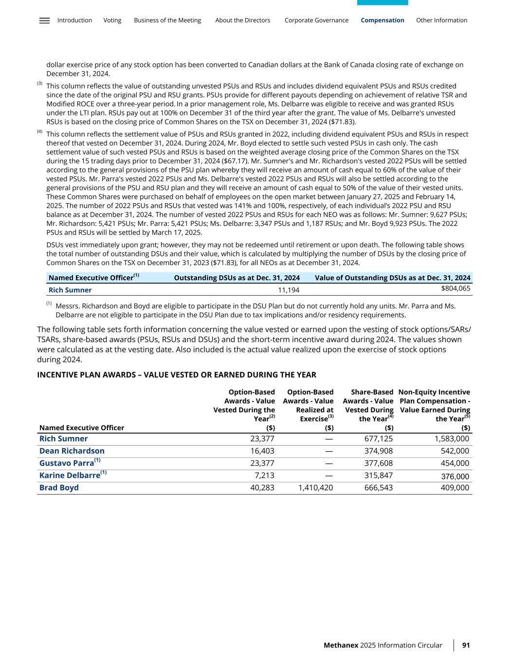 dollar exercise price of any stock option has been converted to Canadian dollars at the Bank of Canada closing rate of exchange on December 31, 2024. (3) This column reflects the value of outstanding unvested PSUs and RSUs and includes dividend equivalent PSUs and RSUs credited since the date of the original PSU and RSU grants. PSUs provide for different payouts depending on achievement of relative TSR and Modified ROCE over a three-year period. In a prior management role, Ms. Delbarre was eligible to receive and was granted RSUs under the LTI plan. RSUs pay out at 100% on December 31 of the third year after the grant. The value of Ms. Delbarre's unvested RSUs is based on the closing price of Common Shares on the TSX on December 31, 2024 ($71.83). (4) This column reflects the settlement value of PSUs and RSUs granted in 2022, including dividend equivalent PSUs and RSUs in respect thereof that vested on December 31, 2024. During 2024, Mr. Boyd elected to settle such vested PSUs in cash only. The cash settlement value of such vested PSUs and RSUs is based on the weighted average closing price of the Common Shares on the TSX during the 15 trading days prior to December 31, 2024 ($67.17). Mr. Sumner's and Mr. Richardson's vested 2022 PSUs will be settled according to the general provisions of the PSU plan whereby they will receive an amount of cash equal to 60% of the value of their vested PSUs. Mr. Parra's vested 2022 PSUs and Ms. Delbarre's vested 2022 PSUs and RSUs will also be settled according to the general provisions of the PSU and RSU plan and they will receive an amount of cash equal to 50% of the value of their vested units. These Common Shares were purchased on behalf of employees on the open market between January 27, 2025 and February 14, 2025. The number of 2022 PSUs and RSUs that vested was 141% and 100%, respectively, of each individual’s 2022 PSU and RSU balance as at December 31, 2024. The number of vested 2022 PSUs and RSUs for each NEO was as follows: Mr. Sumner: 9,627 PSUs; Mr. Richardson: 5,421 PSUs; Mr. Parra: 5,421 PSUs; Ms. Delbarre: 3,347 PSUs and 1,187 RSUs; and Mr. Boyd 9,923 PSUs. The 2022 PSUs and RSUs will be settled by March 17, 2025. DSUs vest immediately upon grant; however, they may not be redeemed until retirement or upon death. The following table shows the total number of outstanding DSUs and their value, which is calculated by multiplying the number of DSUs by the closing price of Common Shares on the TSX on December 31, 2023 ($71.83), for all NEOs as at December 31, 2024. Named Executive Officer(1) Outstanding DSUs as at Dec. 31, 2024 Value of Outstanding DSUs as at Dec. 31, 2024 Rich Sumner 11,194 $804,065 (1) Messrs. Richardson and Boyd are eligible to participate in the DSU Plan but do not currently hold any units. Mr. Parra and Ms. Delbarre are not eligible to participate in the DSU Plan due to tax implications and/or residency requirements. The following table sets forth information concerning the value vested or earned upon the vesting of stock options/SARs/ TSARs, share-based awards (PSUs, RSUs and DSUs) and the short-term incentive award during 2024. The values shown were calculated as at the vesting date. Also included is the actual value realized upon the exercise of stock options during 2024. INCENTIVE PLAN AWARDS – VALUE VESTED OR EARNED DURING THE YEAR Named Executive Officer Option-Based Awards - Value Vested During the Year(2) ($) Option-Based Awards - Value Realized at Exercise(3) ($) Share-Based Awards - Value Vested During the Year(4) ($) Non-Equity Incentive Plan Compensation - Value Earned During the Year(5) ($) Rich Sumner 23,377 — 677,125 1,583,000 Dean Richardson 16,403 — 374,908 542,000 Gustavo Parra(1) 23,377 — 377,608 454,000 Karine Delbarre(1) 7,213 — 315,847 376,000 Brad Boyd 40,283 1,410,420 666,543 409,000 Introduction Voting Business of the Meeting About the Directors Corporate Governance Compensation Other Information Methanex 2025 Information Circular 91