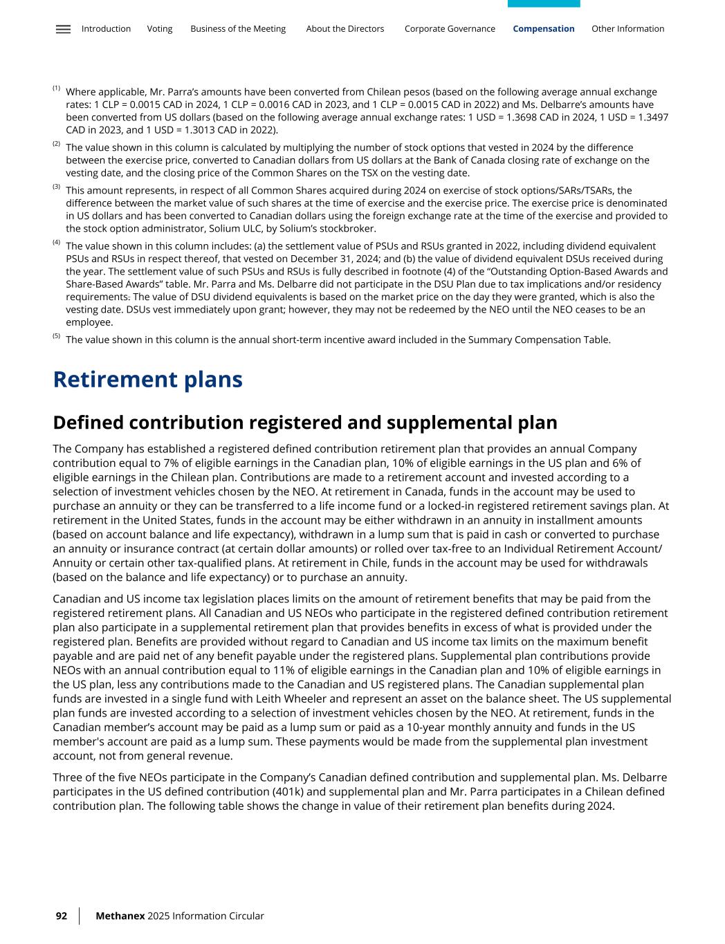 (1) Where applicable, Mr. Parra’s amounts have been converted from Chilean pesos (based on the following average annual exchange rates: 1 CLP = 0.0015 CAD in 2024, 1 CLP = 0.0016 CAD in 2023, and 1 CLP = 0.0015 CAD in 2022) and Ms. Delbarre’s amounts have been converted from US dollars (based on the following average annual exchange rates: 1 USD = 1.3698 CAD in 2024, 1 USD = 1.3497 CAD in 2023, and 1 USD = 1.3013 CAD in 2022). (2) The value shown in this column is calculated by multiplying the number of stock options that vested in 2024 by the difference between the exercise price, converted to Canadian dollars from US dollars at the Bank of Canada closing rate of exchange on the vesting date, and the closing price of the Common Shares on the TSX on the vesting date. (3) This amount represents, in respect of all Common Shares acquired during 2024 on exercise of stock options/SARs/TSARs, the difference between the market value of such shares at the time of exercise and the exercise price. The exercise price is denominated in US dollars and has been converted to Canadian dollars using the foreign exchange rate at the time of the exercise and provided to the stock option administrator, Solium ULC, by Solium’s stockbroker. (4) The value shown in this column includes: (a) the settlement value of PSUs and RSUs granted in 2022, including dividend equivalent PSUs and RSUs in respect thereof, that vested on December 31, 2024; and (b) the value of dividend equivalent DSUs received during the year. The settlement value of such PSUs and RSUs is fully described in footnote (4) of the “Outstanding Option-Based Awards and Share-Based Awards” table. Mr. Parra and Ms. Delbarre did not participate in the DSU Plan due to tax implications and/or residency requirements. The value of DSU dividend equivalents is based on the market price on the day they were granted, which is also the vesting date. DSUs vest immediately upon grant; however, they may not be redeemed by the NEO until the NEO ceases to be an employee. (5) The value shown in this column is the annual short-term incentive award included in the Summary Compensation Table. Retirement plans Defined contribution registered and supplemental plan The Company has established a registered defined contribution retirement plan that provides an annual Company contribution equal to 7% of eligible earnings in the Canadian plan, 10% of eligible earnings in the US plan and 6% of eligible earnings in the Chilean plan. Contributions are made to a retirement account and invested according to a selection of investment vehicles chosen by the NEO. At retirement in Canada, funds in the account may be used to purchase an annuity or they can be transferred to a life income fund or a locked-in registered retirement savings plan. At retirement in the United States, funds in the account may be either withdrawn in an annuity in installment amounts (based on account balance and life expectancy), withdrawn in a lump sum that is paid in cash or converted to purchase an annuity or insurance contract (at certain dollar amounts) or rolled over tax-free to an Individual Retirement Account/ Annuity or certain other tax-qualified plans. At retirement in Chile, funds in the account may be used for withdrawals (based on the balance and life expectancy) or to purchase an annuity. Canadian and US income tax legislation places limits on the amount of retirement benefits that may be paid from the registered retirement plans. All Canadian and US NEOs who participate in the registered defined contribution retirement plan also participate in a supplemental retirement plan that provides benefits in excess of what is provided under the registered plan. Benefits are provided without regard to Canadian and US income tax limits on the maximum benefit payable and are paid net of any benefit payable under the registered plans. Supplemental plan contributions provide NEOs with an annual contribution equal to 11% of eligible earnings in the Canadian plan and 10% of eligible earnings in the US plan, less any contributions made to the Canadian and US registered plans. The Canadian supplemental plan funds are invested in a single fund with Leith Wheeler and represent an asset on the balance sheet. The US supplemental plan funds are invested according to a selection of investment vehicles chosen by the NEO. At retirement, funds in the Canadian member’s account may be paid as a lump sum or paid as a 10-year monthly annuity and funds in the US member's account are paid as a lump sum. These payments would be made from the supplemental plan investment account, not from general revenue. Three of the five NEOs participate in the Company’s Canadian defined contribution and supplemental plan. Ms. Delbarre participates in the US defined contribution (401k) and supplemental plan and Mr. Parra participates in a Chilean defined contribution plan. The following table shows the change in value of their retirement plan benefits during 2024. Introduction Voting Business of the Meeting About the Directors Corporate Governance Compensation Other Information 92 Methanex 2025 Information Circular