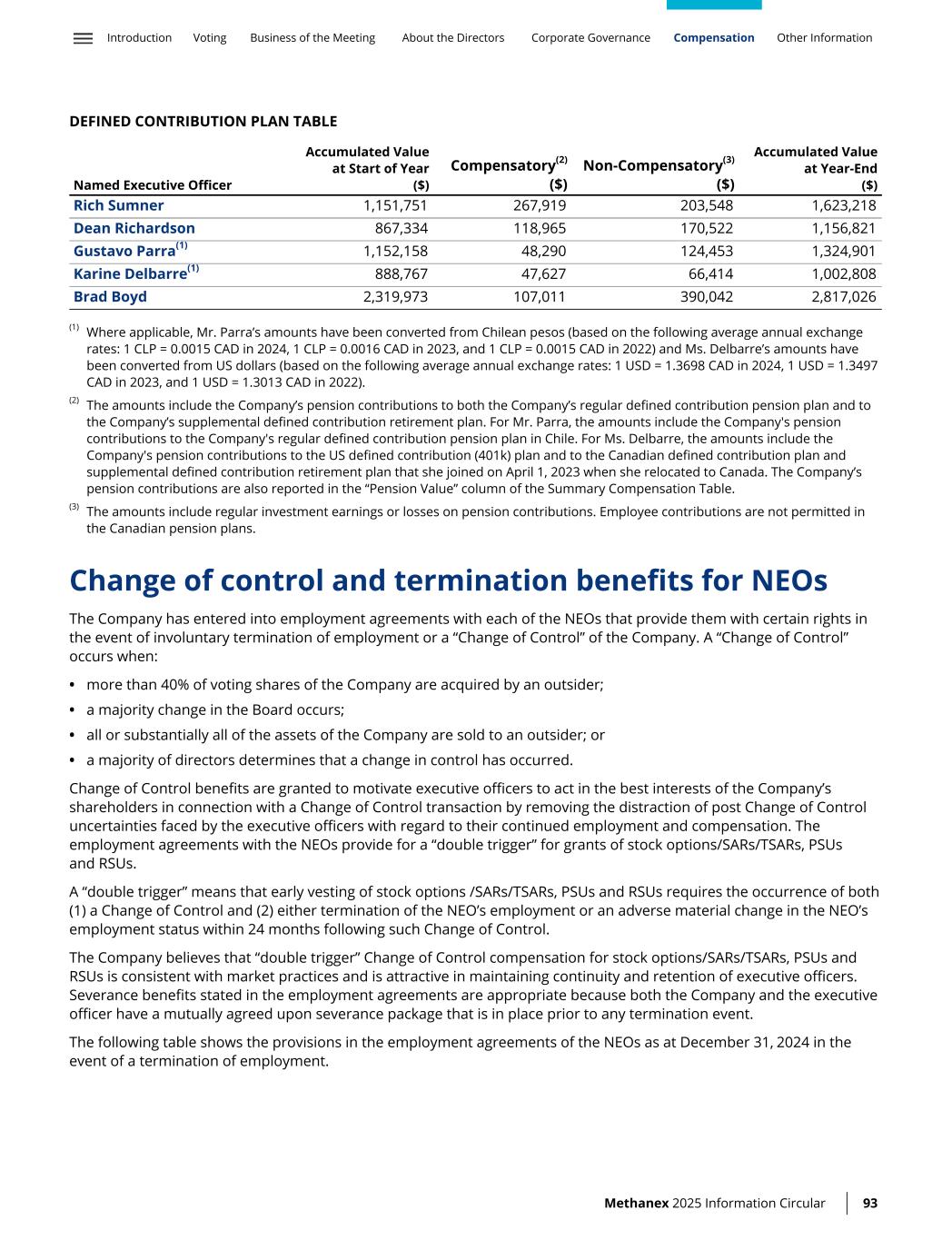 DEFINED CONTRIBUTION PLAN TABLE Named Executive Officer Accumulated Value at Start of Year ($) Compensatory(2) ($) Non-Compensatory(3) ($) Accumulated Value at Year-End ($) Rich Sumner 1,151,751 267,919 203,548 1,623,218 Dean Richardson 867,334 118,965 170,522 1,156,821 Gustavo Parra(1) 1,152,158 48,290 124,453 1,324,901 Karine Delbarre(1) 888,767 47,627 66,414 1,002,808 Brad Boyd 2,319,973 107,011 390,042 2,817,026 (1) Where applicable, Mr. Parra’s amounts have been converted from Chilean pesos (based on the following average annual exchange rates: 1 CLP = 0.0015 CAD in 2024, 1 CLP = 0.0016 CAD in 2023, and 1 CLP = 0.0015 CAD in 2022) and Ms. Delbarre’s amounts have been converted from US dollars (based on the following average annual exchange rates: 1 USD = 1.3698 CAD in 2024, 1 USD = 1.3497 CAD in 2023, and 1 USD = 1.3013 CAD in 2022). (2) The amounts include the Company’s pension contributions to both the Company’s regular defined contribution pension plan and to the Company’s supplemental defined contribution retirement plan. For Mr. Parra, the amounts include the Company's pension contributions to the Company's regular defined contribution pension plan in Chile. For Ms. Delbarre, the amounts include the Company's pension contributions to the US defined contribution (401k) plan and to the Canadian defined contribution plan and supplemental defined contribution retirement plan that she joined on April 1, 2023 when she relocated to Canada. The Company’s pension contributions are also reported in the “Pension Value” column of the Summary Compensation Table. (3) The amounts include regular investment earnings or losses on pension contributions. Employee contributions are not permitted in the Canadian pension plans. Change of control and termination benefits for NEOs The Company has entered into employment agreements with each of the NEOs that provide them with certain rights in the event of involuntary termination of employment or a “Change of Control” of the Company. A “Change of Control” occurs when: • more than 40% of voting shares of the Company are acquired by an outsider; • a majority change in the Board occurs; • all or substantially all of the assets of the Company are sold to an outsider; or • a majority of directors determines that a change in control has occurred. Change of Control benefits are granted to motivate executive officers to act in the best interests of the Company’s shareholders in connection with a Change of Control transaction by removing the distraction of post Change of Control uncertainties faced by the executive officers with regard to their continued employment and compensation. The employment agreements with the NEOs provide for a “double trigger” for grants of stock options/SARs/TSARs, PSUs and RSUs. A “double trigger” means that early vesting of stock options /SARs/TSARs, PSUs and RSUs requires the occurrence of both (1) a Change of Control and (2) either termination of the NEO’s employment or an adverse material change in the NEO’s employment status within 24 months following such Change of Control. The Company believes that “double trigger” Change of Control compensation for stock options/SARs/TSARs, PSUs and RSUs is consistent with market practices and is attractive in maintaining continuity and retention of executive officers. Severance benefits stated in the employment agreements are appropriate because both the Company and the executive officer have a mutually agreed upon severance package that is in place prior to any termination event. The following table shows the provisions in the employment agreements of the NEOs as at December 31, 2024 in the event of a termination of employment. Introduction Voting Business of the Meeting About the Directors Corporate Governance Compensation Other Information Methanex 2025 Information Circular 93