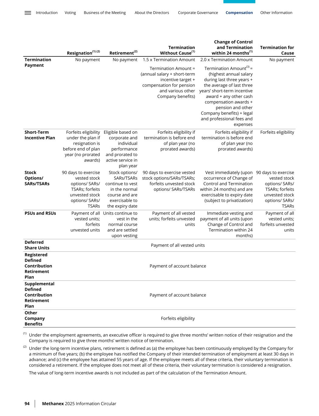 Resignation(1) (2) Retirement(2) Termination Without Cause(1) Change of Control and Termination within 24 months(1) Termination for Cause Termination Payment No payment No payment 1.5 x Termination Amount Termination Amount = (annual salary + short-term incentive target + compensation for pension and various other Company benefits) 2.0 x Termination Amount Termination Amount(3) = (highest annual salary during last three years + the average of last three years’ short-term incentive award + any other cash compensation awards + pension and other Company benefits) + legal and professional fees and expenses No payment Short-Term Incentive Plan Forfeits eligibility under the plan if resignation is before end of plan year (no prorated awards) Eligible based on corporate and individual performance and prorated to active service in plan year Forfeits eligibility if termination is before end of plan year (no prorated awards) Forfeits eligibility if termination is before end of plan year (no prorated awards) Forfeits eligibility Stock Options/ SARs/TSARs 90 days to exercise vested stock options/ SARs/ TSARs; forfeits unvested stock options/ SARs/ TSARs Stock options/ SARs/TSARs continue to vest in the normal course and are exercisable to the expiry date 90 days to exercise vested stock options/SARs/TSARs; forfeits unvested stock options/ SARs/TSARs Vest immediately (upon occurrence of Change of Control and Termination within 24 months) and are exercisable to expiry date (subject to privatization) 90 days to exercise vested stock options/ SARs/ TSARs; forfeits unvested stock options/ SARs/ TSARs PSUs and RSUs Payment of all vested units; forfeits unvested units Units continue to vest in the normal course and are settled upon vesting Payment of all vested units; forfeits unvested units Immediate vesting and payment of all units (upon Change of Control and Termination within 24 months) Payment of all vested units; forfeits unvested units Deferred Share Units Payment of all vested units Registered Defined Contribution Retirement Plan Payment of account balance Supplemental Defined Contribution Retirement Plan Payment of account balance Other Company Benefits Forfeits eligibility (1) Under the employment agreements, an executive officer is required to give three months’ written notice of their resignation and the Company is required to give three months’ written notice of termination. (2) Under the long-term incentive plans, retirement is defined as (a) the employee has been continuously employed by the Company for a minimum of five years; (b) the employee has notified the Company of their intended termination of employment at least 30 days in advance; and (c) the employee has attained 55 years of age. If the employee meets all of these criteria, their voluntary termination is considered a retirement. If the employee does not meet all of these criteria, their voluntary termination is considered a resignation. The value of long-term incentive awards is not included as part of the calculation of the Termination Amount. Introduction Voting Business of the Meeting About the Directors Corporate Governance Compensation Other Information 94 Methanex 2025 Information Circular