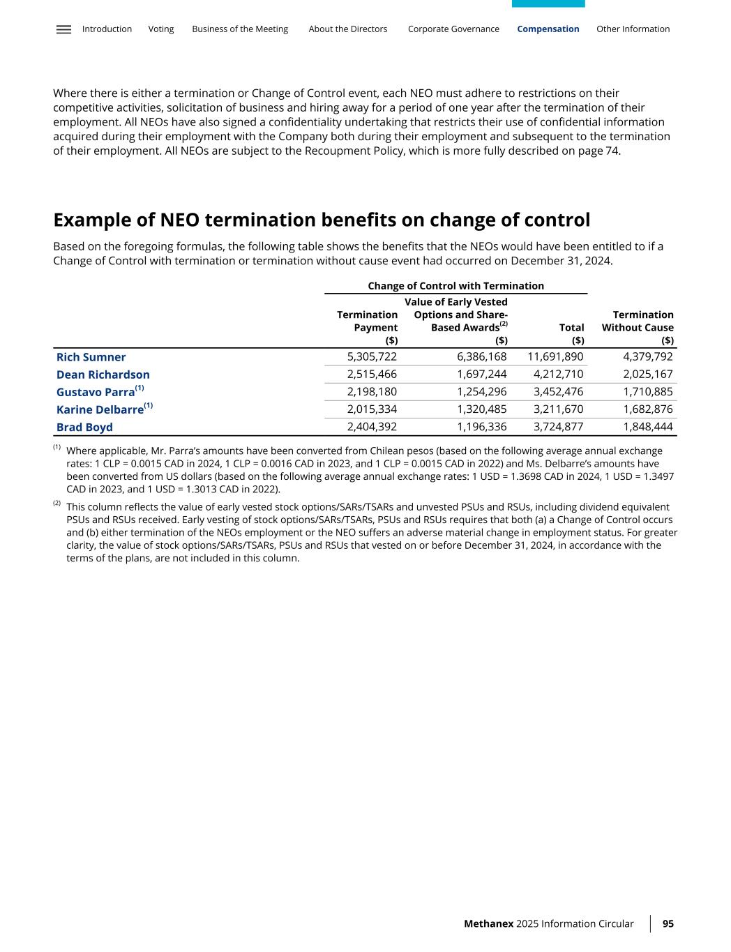 Where there is either a termination or Change of Control event, each NEO must adhere to restrictions on their competitive activities, solicitation of business and hiring away for a period of one year after the termination of their employment. All NEOs have also signed a confidentiality undertaking that restricts their use of confidential information acquired during their employment with the Company both during their employment and subsequent to the termination of their employment. All NEOs are subject to the Recoupment Policy, which is more fully described on page 74. Example of NEO termination benefits on change of control Based on the foregoing formulas, the following table shows the benefits that the NEOs would have been entitled to if a Change of Control with termination or termination without cause event had occurred on December 31, 2024. Change of Control with Termination Termination Without Cause ($) Termination Payment ($) Value of Early Vested Options and Share- Based Awards(2) ($) Total ($) Rich Sumner 5,305,722 6,386,168 11,691,890 4,379,792 Dean Richardson 2,515,466 1,697,244 4,212,710 2,025,167 Gustavo Parra(1) 2,198,180 1,254,296 3,452,476 1,710,885 Karine Delbarre(1) 2,015,334 1,320,485 3,211,670 1,682,876 Brad Boyd 2,404,392 1,196,336 3,724,877 1,848,444 (1) Where applicable, Mr. Parra’s amounts have been converted from Chilean pesos (based on the following average annual exchange rates: 1 CLP = 0.0015 CAD in 2024, 1 CLP = 0.0016 CAD in 2023, and 1 CLP = 0.0015 CAD in 2022) and Ms. Delbarre’s amounts have been converted from US dollars (based on the following average annual exchange rates: 1 USD = 1.3698 CAD in 2024, 1 USD = 1.3497 CAD in 2023, and 1 USD = 1.3013 CAD in 2022). (2) This column reflects the value of early vested stock options/SARs/TSARs and unvested PSUs and RSUs, including dividend equivalent PSUs and RSUs received. Early vesting of stock options/SARs/TSARs, PSUs and RSUs requires that both (a) a Change of Control occurs and (b) either termination of the NEOs employment or the NEO suffers an adverse material change in employment status. For greater clarity, the value of stock options/SARs/TSARs, PSUs and RSUs that vested on or before December 31, 2024, in accordance with the terms of the plans, are not included in this column. Introduction Voting Business of the Meeting About the Directors Corporate Governance Compensation Other Information Methanex 2025 Information Circular 95