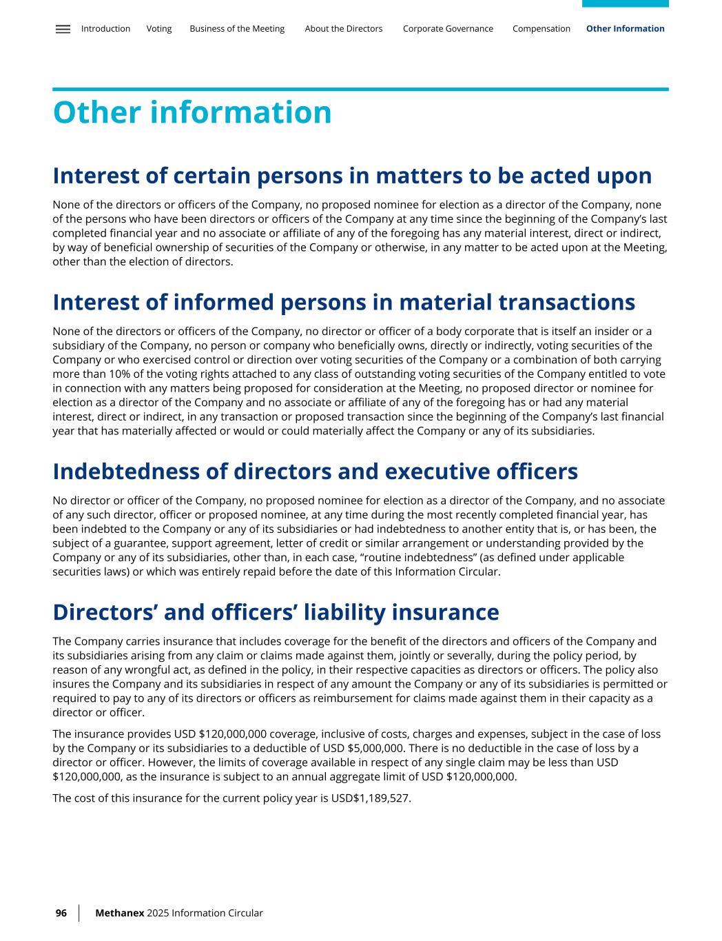 Other information Interest of certain persons in matters to be acted upon None of the directors or officers of the Company, no proposed nominee for election as a director of the Company, none of the persons who have been directors or officers of the Company at any time since the beginning of the Company’s last completed financial year and no associate or affiliate of any of the foregoing has any material interest, direct or indirect, by way of beneficial ownership of securities of the Company or otherwise, in any matter to be acted upon at the Meeting, other than the election of directors. Interest of informed persons in material transactions None of the directors or officers of the Company, no director or officer of a body corporate that is itself an insider or a subsidiary of the Company, no person or company who beneficially owns, directly or indirectly, voting securities of the Company or who exercised control or direction over voting securities of the Company or a combination of both carrying more than 10% of the voting rights attached to any class of outstanding voting securities of the Company entitled to vote in connection with any matters being proposed for consideration at the Meeting, no proposed director or nominee for election as a director of the Company and no associate or affiliate of any of the foregoing has or had any material interest, direct or indirect, in any transaction or proposed transaction since the beginning of the Company’s last financial year that has materially affected or would or could materially affect the Company or any of its subsidiaries. Indebtedness of directors and executive officers No director or officer of the Company, no proposed nominee for election as a director of the Company, and no associate of any such director, officer or proposed nominee, at any time during the most recently completed financial year, has been indebted to the Company or any of its subsidiaries or had indebtedness to another entity that is, or has been, the subject of a guarantee, support agreement, letter of credit or similar arrangement or understanding provided by the Company or any of its subsidiaries, other than, in each case, “routine indebtedness” (as defined under applicable securities laws) or which was entirely repaid before the date of this Information Circular. Directors’ and officers’ liability insurance The Company carries insurance that includes coverage for the benefit of the directors and officers of the Company and its subsidiaries arising from any claim or claims made against them, jointly or severally, during the policy period, by reason of any wrongful act, as defined in the policy, in their respective capacities as directors or officers. The policy also insures the Company and its subsidiaries in respect of any amount the Company or any of its subsidiaries is permitted or required to pay to any of its directors or officers as reimbursement for claims made against them in their capacity as a director or officer. The insurance provides USD $120,000,000 coverage, inclusive of costs, charges and expenses, subject in the case of loss by the Company or its subsidiaries to a deductible of USD $5,000,000. There is no deductible in the case of loss by a director or officer. However, the limits of coverage available in respect of any single claim may be less than USD $120,000,000, as the insurance is subject to an annual aggregate limit of USD $120,000,000. The cost of this insurance for the current policy year is USD$1,189,527. Introduction Voting Business of the Meeting About the Directors Corporate Governance Compensation Other Information 96 Methanex 2025 Information Circular