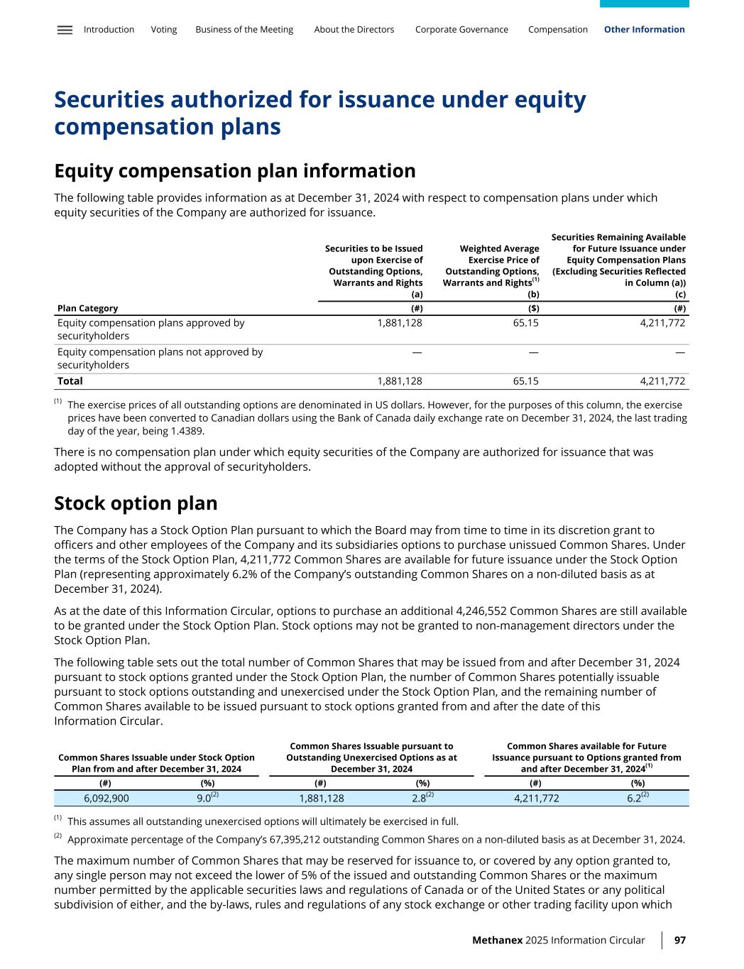 Securities authorized for issuance under equity compensation plans Equity compensation plan information The following table provides information as at December 31, 2024 with respect to compensation plans under which equity securities of the Company are authorized for issuance. Securities to be Issued upon Exercise of Outstanding Options, Warrants and Rights (a) Weighted Average Exercise Price of Outstanding Options, Warrants and Rights(1) (b) Securities Remaining Available for Future Issuance under Equity Compensation Plans (Excluding Securities Reflected in Column (a)) (c) Plan Category (#) ($) (#) Equity compensation plans approved by securityholders 1,881,128 65.15 4,211,772 Equity compensation plans not approved by securityholders — — — Total 1,881,128 65.15 4,211,772 (1) The exercise prices of all outstanding options are denominated in US dollars. However, for the purposes of this column, the exercise prices have been converted to Canadian dollars using the Bank of Canada daily exchange rate on December 31, 2024, the last trading day of the year, being 1.4389. There is no compensation plan under which equity securities of the Company are authorized for issuance that was adopted without the approval of securityholders. Stock option plan The Company has a Stock Option Plan pursuant to which the Board may from time to time in its discretion grant to officers and other employees of the Company and its subsidiaries options to purchase unissued Common Shares. Under the terms of the Stock Option Plan, 4,211,772 Common Shares are available for future issuance under the Stock Option Plan (representing approximately 6.2% of the Company’s outstanding Common Shares on a non-diluted basis as at December 31, 2024). As at the date of this Information Circular, options to purchase an additional 4,246,552 Common Shares are still available to be granted under the Stock Option Plan. Stock options may not be granted to non-management directors under the Stock Option Plan. The following table sets out the total number of Common Shares that may be issued from and after December 31, 2024 pursuant to stock options granted under the Stock Option Plan, the number of Common Shares potentially issuable pursuant to stock options outstanding and unexercised under the Stock Option Plan, and the remaining number of Common Shares available to be issued pursuant to stock options granted from and after the date of this Information Circular. Common Shares Issuable under Stock Option Plan from and after December 31, 2024 Common Shares Issuable pursuant to Outstanding Unexercised Options as at December 31, 2024 Common Shares available for Future Issuance pursuant to Options granted from and after December 31, 2024(1) (#) (%) (#) (%) (#) (%) 6,092,900 9.0(2) 1,881,128 2.8(2) 4,211,772 6.2(2) (1) This assumes all outstanding unexercised options will ultimately be exercised in full. (2) Approximate percentage of the Company’s 67,395,212 outstanding Common Shares on a non-diluted basis as at December 31, 2024. The maximum number of Common Shares that may be reserved for issuance to, or covered by any option granted to, any single person may not exceed the lower of 5% of the issued and outstanding Common Shares or the maximum number permitted by the applicable securities laws and regulations of Canada or of the United States or any political subdivision of either, and the by-laws, rules and regulations of any stock exchange or other trading facility upon which Introduction Voting Business of the Meeting About the Directors Corporate Governance Compensation Other Information Methanex 2025 Information Circular 97