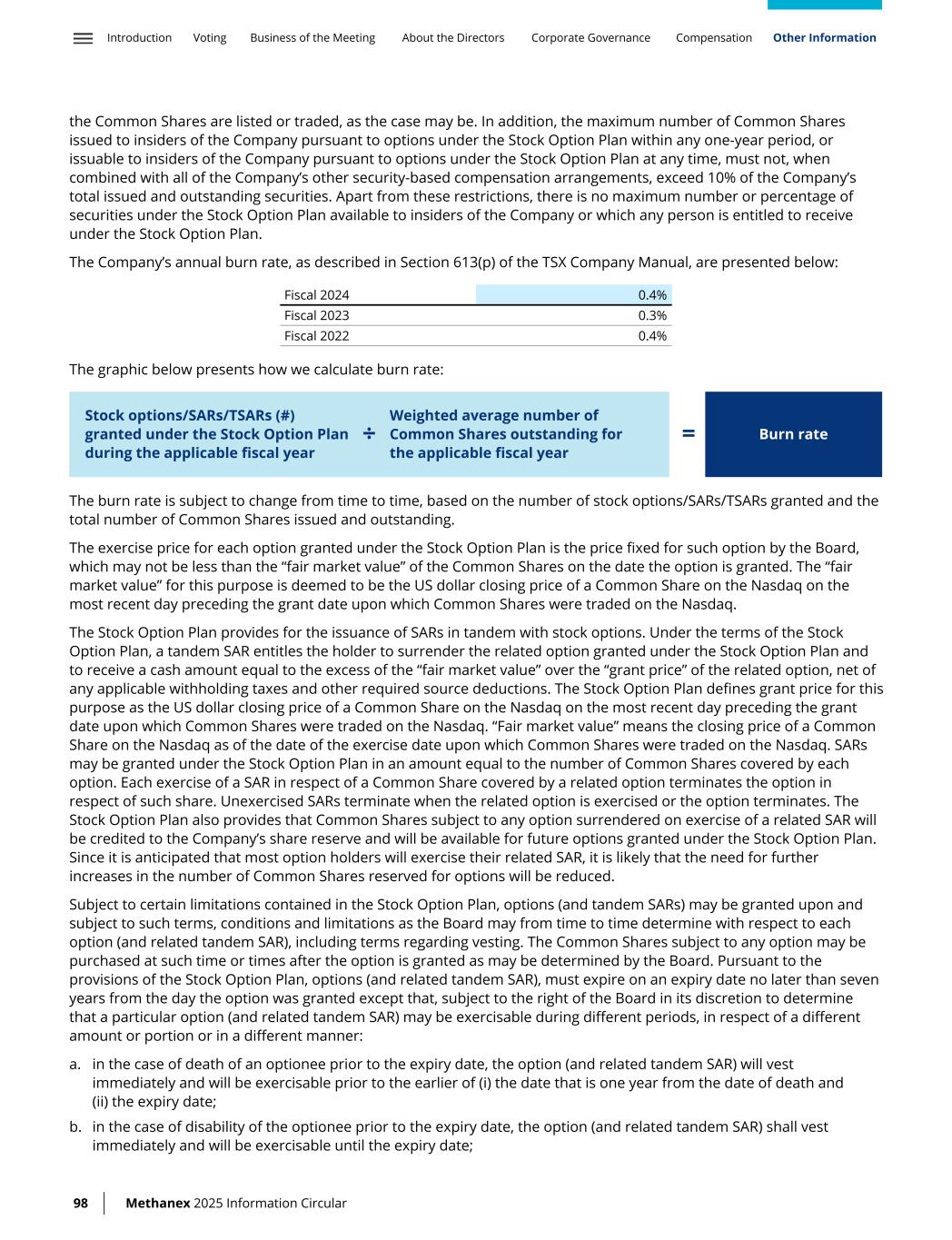 the Common Shares are listed or traded, as the case may be. In addition, the maximum number of Common Shares issued to insiders of the Company pursuant to options under the Stock Option Plan within any one-year period, or issuable to insiders of the Company pursuant to options under the Stock Option Plan at any time, must not, when combined with all of the Company’s other security-based compensation arrangements, exceed 10% of the Company’s total issued and outstanding securities. Apart from these restrictions, there is no maximum number or percentage of securities under the Stock Option Plan available to insiders of the Company or which any person is entitled to receive under the Stock Option Plan. The Company’s annual burn rate, as described in Section 613(p) of the TSX Company Manual, are presented below: Fiscal 2024 0.4% Fiscal 2023 0.3% Fiscal 2022 0.4% The graphic below presents how we calculate burn rate: Stock options/SARs/TSARs (#) granted under the Stock Option Plan during the applicable fiscal year ÷ Weighted average number of Common Shares outstanding for the applicable fiscal year = Burn rate The burn rate is subject to change from time to time, based on the number of stock options/SARs/TSARs granted and the total number of Common Shares issued and outstanding. The exercise price for each option granted under the Stock Option Plan is the price fixed for such option by the Board, which may not be less than the “fair market value” of the Common Shares on the date the option is granted. The “fair market value” for this purpose is deemed to be the US dollar closing price of a Common Share on the Nasdaq on the most recent day preceding the grant date upon which Common Shares were traded on the Nasdaq. The Stock Option Plan provides for the issuance of SARs in tandem with stock options. Under the terms of the Stock Option Plan, a tandem SAR entitles the holder to surrender the related option granted under the Stock Option Plan and to receive a cash amount equal to the excess of the “fair market value” over the “grant price” of the related option, net of any applicable withholding taxes and other required source deductions. The Stock Option Plan defines grant price for this purpose as the US dollar closing price of a Common Share on the Nasdaq on the most recent day preceding the grant date upon which Common Shares were traded on the Nasdaq. “Fair market value” means the closing price of a Common Share on the Nasdaq as of the date of the exercise date upon which Common Shares were traded on the Nasdaq. SARs may be granted under the Stock Option Plan in an amount equal to the number of Common Shares covered by each option. Each exercise of a SAR in respect of a Common Share covered by a related option terminates the option in respect of such share. Unexercised SARs terminate when the related option is exercised or the option terminates. The Stock Option Plan also provides that Common Shares subject to any option surrendered on exercise of a related SAR will be credited to the Company’s share reserve and will be available for future options granted under the Stock Option Plan. Since it is anticipated that most option holders will exercise their related SAR, it is likely that the need for further increases in the number of Common Shares reserved for options will be reduced. Subject to certain limitations contained in the Stock Option Plan, options (and tandem SARs) may be granted upon and subject to such terms, conditions and limitations as the Board may from time to time determine with respect to each option (and related tandem SAR), including terms regarding vesting. The Common Shares subject to any option may be purchased at such time or times after the option is granted as may be determined by the Board. Pursuant to the provisions of the Stock Option Plan, options (and related tandem SAR), must expire on an expiry date no later than seven years from the day the option was granted except that, subject to the right of the Board in its discretion to determine that a particular option (and related tandem SAR) may be exercisable during different periods, in respect of a different amount or portion or in a different manner: a. in the case of death of an optionee prior to the expiry date, the option (and related tandem SAR) will vest immediately and will be exercisable prior to the earlier of (i) the date that is one year from the date of death and (ii) the expiry date; b. in the case of disability of the optionee prior to the expiry date, the option (and related tandem SAR) shall vest immediately and will be exercisable until the expiry date; Introduction Voting Business of the Meeting About the Directors Corporate Governance Compensation Other Information 98 Methanex 2025 Information Circular