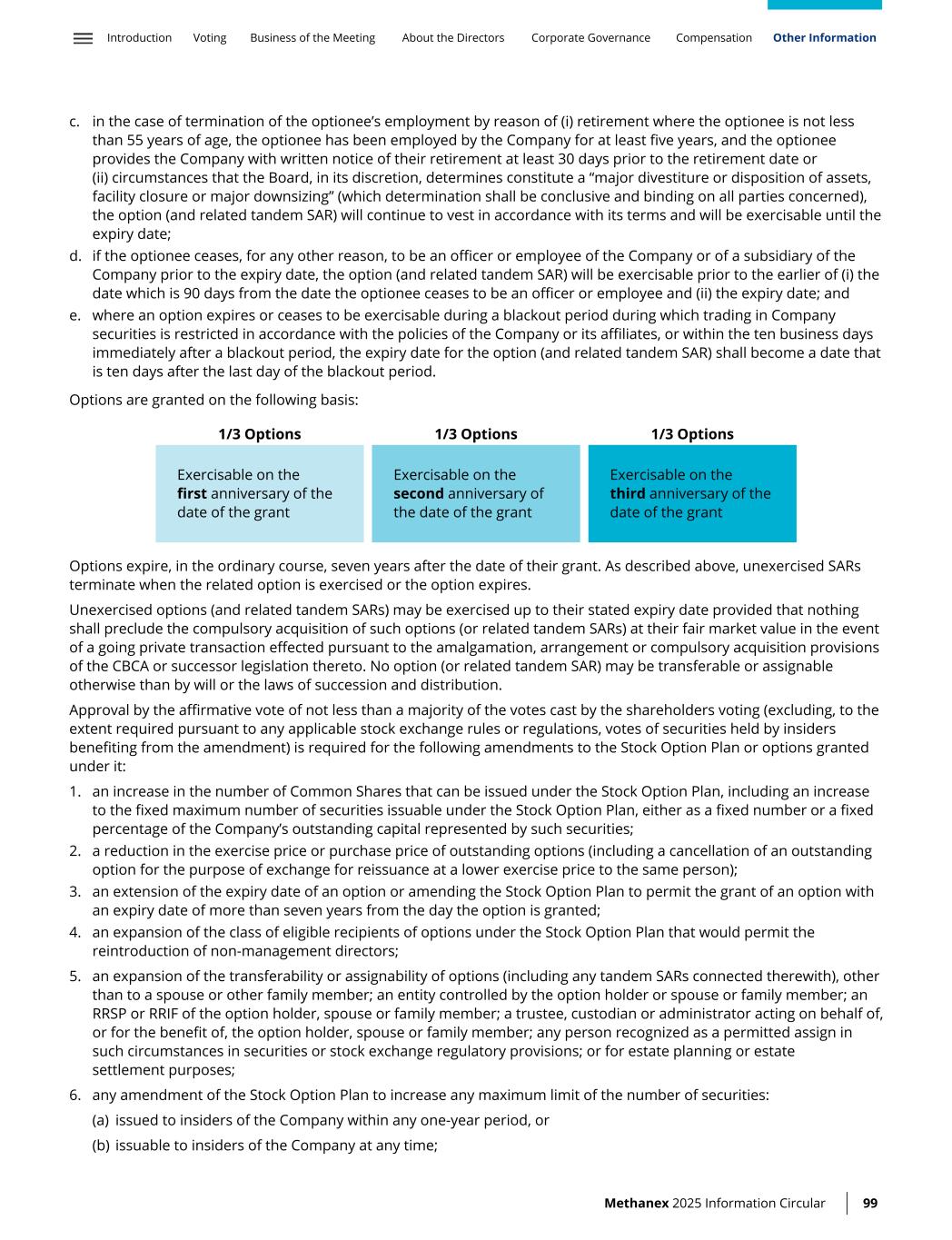 c. in the case of termination of the optionee’s employment by reason of (i) retirement where the optionee is not less than 55 years of age, the optionee has been employed by the Company for at least five years, and the optionee provides the Company with written notice of their retirement at least 30 days prior to the retirement date or (ii) circumstances that the Board, in its discretion, determines constitute a “major divestiture or disposition of assets, facility closure or major downsizing” (which determination shall be conclusive and binding on all parties concerned), the option (and related tandem SAR) will continue to vest in accordance with its terms and will be exercisable until the expiry date; d. if the optionee ceases, for any other reason, to be an officer or employee of the Company or of a subsidiary of the Company prior to the expiry date, the option (and related tandem SAR) will be exercisable prior to the earlier of (i) the date which is 90 days from the date the optionee ceases to be an officer or employee and (ii) the expiry date; and e. where an option expires or ceases to be exercisable during a blackout period during which trading in Company securities is restricted in accordance with the policies of the Company or its affiliates, or within the ten business days immediately after a blackout period, the expiry date for the option (and related tandem SAR) shall become a date that is ten days after the last day of the blackout period. Options are granted on the following basis: 1/3 Options 1/3 Options 1/3 Options Exercisable on the first anniversary of the date of the grant Exercisable on the second anniversary of the date of the grant Exercisable on the third anniversary of the date of the grant Options expire, in the ordinary course, seven years after the date of their grant. As described above, unexercised SARs terminate when the related option is exercised or the option expires. Unexercised options (and related tandem SARs) may be exercised up to their stated expiry date provided that nothing shall preclude the compulsory acquisition of such options (or related tandem SARs) at their fair market value in the event of a going private transaction effected pursuant to the amalgamation, arrangement or compulsory acquisition provisions of the CBCA or successor legislation thereto. No option (or related tandem SAR) may be transferable or assignable otherwise than by will or the laws of succession and distribution. Approval by the affirmative vote of not less than a majority of the votes cast by the shareholders voting (excluding, to the extent required pursuant to any applicable stock exchange rules or regulations, votes of securities held by insiders benefiting from the amendment) is required for the following amendments to the Stock Option Plan or options granted under it: 1. an increase in the number of Common Shares that can be issued under the Stock Option Plan, including an increase to the fixed maximum number of securities issuable under the Stock Option Plan, either as a fixed number or a fixed percentage of the Company’s outstanding capital represented by such securities; 2. a reduction in the exercise price or purchase price of outstanding options (including a cancellation of an outstanding option for the purpose of exchange for reissuance at a lower exercise price to the same person); 3. an extension of the expiry date of an option or amending the Stock Option Plan to permit the grant of an option with an expiry date of more than seven years from the day the option is granted; 4. an expansion of the class of eligible recipients of options under the Stock Option Plan that would permit the reintroduction of non-management directors; 5. an expansion of the transferability or assignability of options (including any tandem SARs connected therewith), other than to a spouse or other family member; an entity controlled by the option holder or spouse or family member; an RRSP or RRIF of the option holder, spouse or family member; a trustee, custodian or administrator acting on behalf of, or for the benefit of, the option holder, spouse or family member; any person recognized as a permitted assign in such circumstances in securities or stock exchange regulatory provisions; or for estate planning or estate settlement purposes; 6. any amendment of the Stock Option Plan to increase any maximum limit of the number of securities: (a) issued to insiders of the Company within any one-year period, or (b) issuable to insiders of the Company at any time; Introduction Voting Business of the Meeting About the Directors Corporate Governance Compensation Other Information Methanex 2025 Information Circular 99