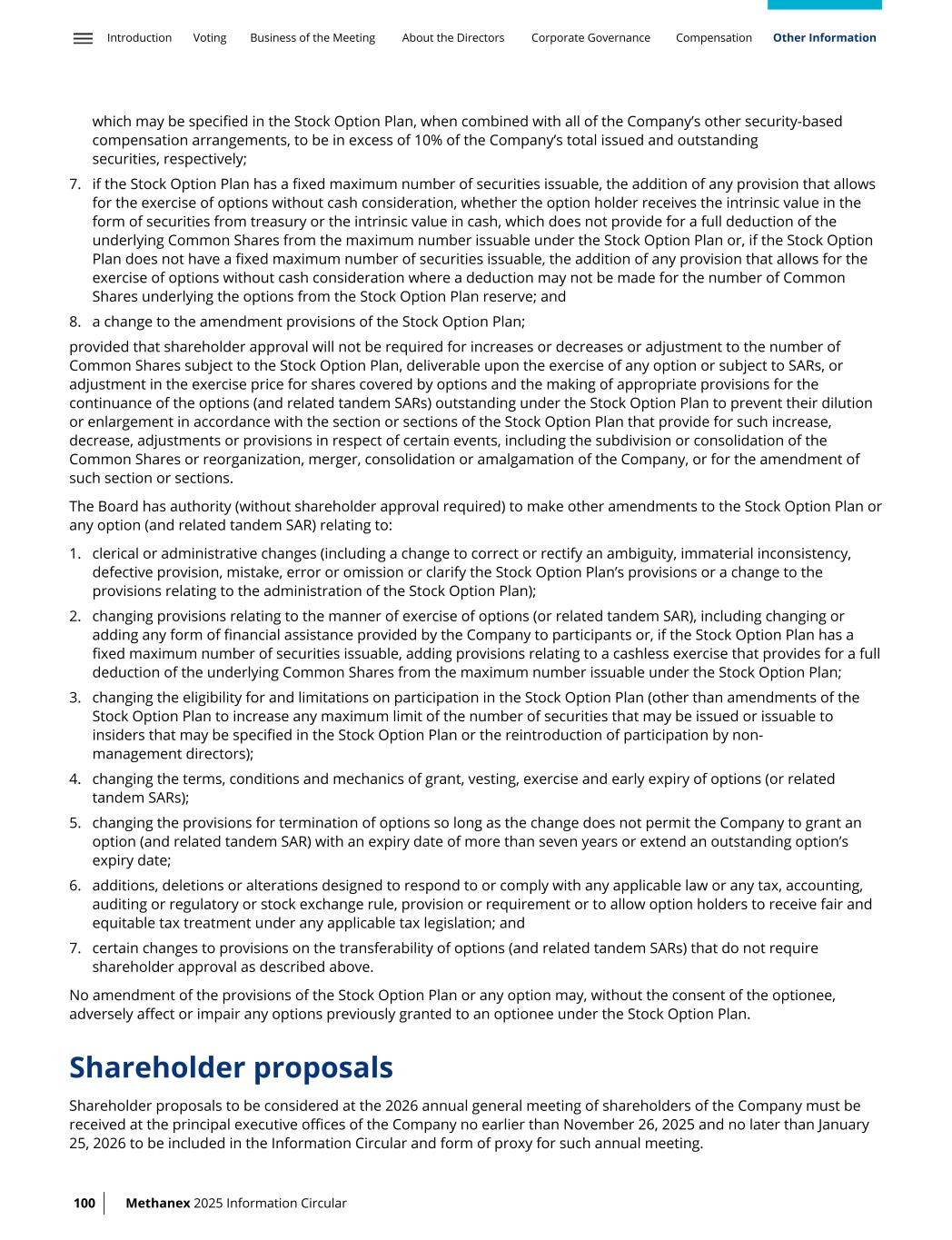 which may be specified in the Stock Option Plan, when combined with all of the Company’s other security-based compensation arrangements, to be in excess of 10% of the Company’s total issued and outstanding securities, respectively; 7. if the Stock Option Plan has a fixed maximum number of securities issuable, the addition of any provision that allows for the exercise of options without cash consideration, whether the option holder receives the intrinsic value in the form of securities from treasury or the intrinsic value in cash, which does not provide for a full deduction of the underlying Common Shares from the maximum number issuable under the Stock Option Plan or, if the Stock Option Plan does not have a fixed maximum number of securities issuable, the addition of any provision that allows for the exercise of options without cash consideration where a deduction may not be made for the number of Common Shares underlying the options from the Stock Option Plan reserve; and 8. a change to the amendment provisions of the Stock Option Plan; provided that shareholder approval will not be required for increases or decreases or adjustment to the number of Common Shares subject to the Stock Option Plan, deliverable upon the exercise of any option or subject to SARs, or adjustment in the exercise price for shares covered by options and the making of appropriate provisions for the continuance of the options (and related tandem SARs) outstanding under the Stock Option Plan to prevent their dilution or enlargement in accordance with the section or sections of the Stock Option Plan that provide for such increase, decrease, adjustments or provisions in respect of certain events, including the subdivision or consolidation of the Common Shares or reorganization, merger, consolidation or amalgamation of the Company, or for the amendment of such section or sections. The Board has authority (without shareholder approval required) to make other amendments to the Stock Option Plan or any option (and related tandem SAR) relating to: 1. clerical or administrative changes (including a change to correct or rectify an ambiguity, immaterial inconsistency, defective provision, mistake, error or omission or clarify the Stock Option Plan’s provisions or a change to the provisions relating to the administration of the Stock Option Plan); 2. changing provisions relating to the manner of exercise of options (or related tandem SAR), including changing or adding any form of financial assistance provided by the Company to participants or, if the Stock Option Plan has a fixed maximum number of securities issuable, adding provisions relating to a cashless exercise that provides for a full deduction of the underlying Common Shares from the maximum number issuable under the Stock Option Plan; 3. changing the eligibility for and limitations on participation in the Stock Option Plan (other than amendments of the Stock Option Plan to increase any maximum limit of the number of securities that may be issued or issuable to insiders that may be specified in the Stock Option Plan or the reintroduction of participation by non- management directors); 4. changing the terms, conditions and mechanics of grant, vesting, exercise and early expiry of options (or related tandem SARs); 5. changing the provisions for termination of options so long as the change does not permit the Company to grant an option (and related tandem SAR) with an expiry date of more than seven years or extend an outstanding option’s expiry date; 6. additions, deletions or alterations designed to respond to or comply with any applicable law or any tax, accounting, auditing or regulatory or stock exchange rule, provision or requirement or to allow option holders to receive fair and equitable tax treatment under any applicable tax legislation; and 7. certain changes to provisions on the transferability of options (and related tandem SARs) that do not require shareholder approval as described above. No amendment of the provisions of the Stock Option Plan or any option may, without the consent of the optionee, adversely affect or impair any options previously granted to an optionee under the Stock Option Plan. Shareholder proposals Shareholder proposals to be considered at the 2026 annual general meeting of shareholders of the Company must be received at the principal executive offices of the Company no earlier than November 26, 2025 and no later than January 25, 2026 to be included in the Information Circular and form of proxy for such annual meeting. Introduction Voting Business of the Meeting About the Directors Corporate Governance Compensation Other Information 100 Methanex 2025 Information Circular