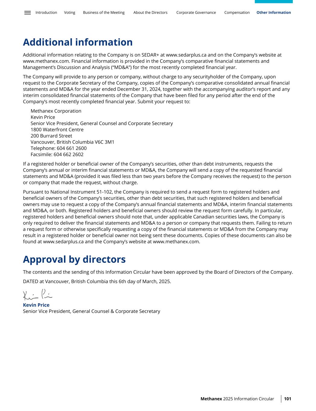 Additional information Additional information relating to the Company is on SEDAR+ at www.sedarplus.ca and on the Company’s website at www.methanex.com. Financial information is provided in the Company’s comparative financial statements and Management’s Discussion and Analysis (“MD&A”) for the most recently completed financial year. The Company will provide to any person or company, without charge to any securityholder of the Company, upon request to the Corporate Secretary of the Company, copies of the Company’s comparative consolidated annual financial statements and MD&A for the year ended December 31, 2024, together with the accompanying auditor’s report and any interim consolidated financial statements of the Company that have been filed for any period after the end of the Company’s most recently completed financial year. Submit your request to: Methanex Corporation Kevin Price Senior Vice President, General Counsel and Corporate Secretary 1800 Waterfront Centre 200 Burrard Street Vancouver, British Columbia V6C 3M1 Telephone: 604 661 2600 Facsimile: 604 662 2602 If a registered holder or beneficial owner of the Company’s securities, other than debt instruments, requests the Company’s annual or interim financial statements or MD&A, the Company will send a copy of the requested financial statements and MD&A (provided it was filed less than two years before the Company receives the request) to the person or company that made the request, without charge. Pursuant to National Instrument 51-102, the Company is required to send a request form to registered holders and beneficial owners of the Company’s securities, other than debt securities, that such registered holders and beneficial owners may use to request a copy of the Company’s annual financial statements and MD&A, interim financial statements and MD&A, or both. Registered holders and beneficial owners should review the request form carefully. In particular, registered holders and beneficial owners should note that, under applicable Canadian securities laws, the Company is only required to deliver the financial statements and MD&A to a person or company that requests them. Failing to return a request form or otherwise specifically requesting a copy of the financial statements or MD&A from the Company may result in a registered holder or beneficial owner not being sent these documents. Copies of these documents can also be found at www.sedarplus.ca and the Company’s website at www.methanex.com. Approval by directors The contents and the sending of this Information Circular have been approved by the Board of Directors of the Company. DATED at Vancouver, British Columbia this 6th day of March, 2025. Kevin Price Senior Vice President, General Counsel & Corporate Secretary Introduction Voting Business of the Meeting About the Directors Corporate Governance Compensation Other Information Methanex 2025 Information Circular 101