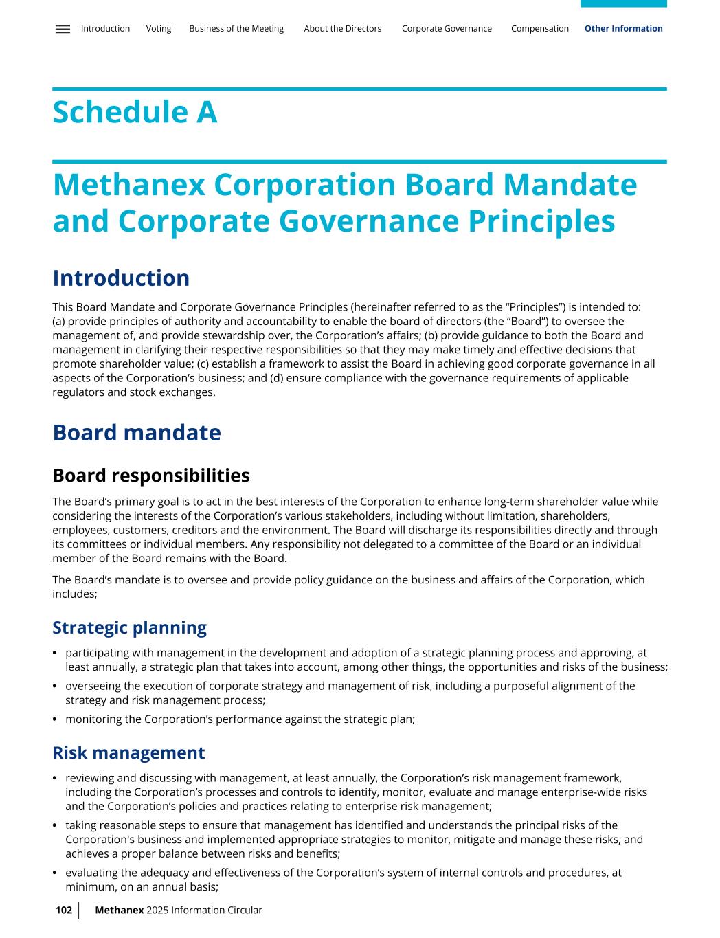 Schedule A Methanex Corporation Board Mandate and Corporate Governance Principles Introduction This Board Mandate and Corporate Governance Principles (hereinafter referred to as the “Principles”) is intended to: (a) provide principles of authority and accountability to enable the board of directors (the “Board”) to oversee the management of, and provide stewardship over, the Corporation’s affairs; (b) provide guidance to both the Board and management in clarifying their respective responsibilities so that they may make timely and effective decisions that promote shareholder value; (c) establish a framework to assist the Board in achieving good corporate governance in all aspects of the Corporation’s business; and (d) ensure compliance with the governance requirements of applicable regulators and stock exchanges. Board mandate Board responsibilities The Board’s primary goal is to act in the best interests of the Corporation to enhance long-term shareholder value while considering the interests of the Corporation’s various stakeholders, including without limitation, shareholders, employees, customers, creditors and the environment. The Board will discharge its responsibilities directly and through its committees or individual members. Any responsibility not delegated to a committee of the Board or an individual member of the Board remains with the Board. The Board’s mandate is to oversee and provide policy guidance on the business and affairs of the Corporation, which includes; Strategic planning • participating with management in the development and adoption of a strategic planning process and approving, at least annually, a strategic plan that takes into account, among other things, the opportunities and risks of the business; • overseeing the execution of corporate strategy and management of risk, including a purposeful alignment of the strategy and risk management process; • monitoring the Corporation’s performance against the strategic plan; Risk management • reviewing and discussing with management, at least annually, the Corporation’s risk management framework, including the Corporation’s processes and controls to identify, monitor, evaluate and manage enterprise-wide risks and the Corporation’s policies and practices relating to enterprise risk management; • taking reasonable steps to ensure that management has identified and understands the principal risks of the Corporation's business and implemented appropriate strategies to monitor, mitigate and manage these risks, and achieves a proper balance between risks and benefits; • evaluating the adequacy and effectiveness of the Corporation’s system of internal controls and procedures, at minimum, on an annual basis; Introduction Voting Business of the Meeting About the Directors Corporate Governance Compensation Other Information 102 Methanex 2025 Information Circular