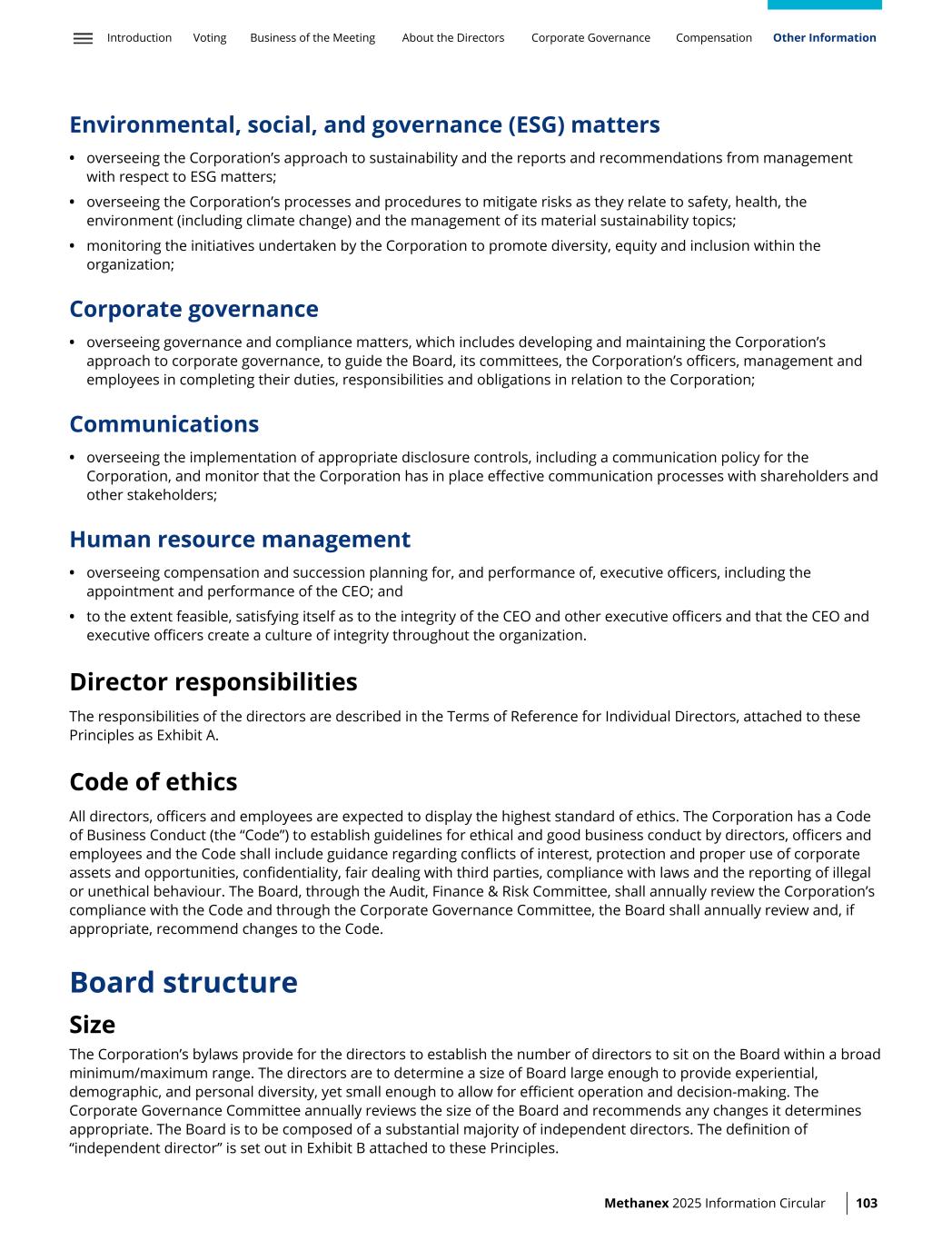 Environmental, social, and governance (ESG) matters • overseeing the Corporation’s approach to sustainability and the reports and recommendations from management with respect to ESG matters; • overseeing the Corporation’s processes and procedures to mitigate risks as they relate to safety, health, the environment (including climate change) and the management of its material sustainability topics; • monitoring the initiatives undertaken by the Corporation to promote diversity, equity and inclusion within the organization; Corporate governance • overseeing governance and compliance matters, which includes developing and maintaining the Corporation’s approach to corporate governance, to guide the Board, its committees, the Corporation’s officers, management and employees in completing their duties, responsibilities and obligations in relation to the Corporation; Communications • overseeing the implementation of appropriate disclosure controls, including a communication policy for the Corporation, and monitor that the Corporation has in place effective communication processes with shareholders and other stakeholders; Human resource management • overseeing compensation and succession planning for, and performance of, executive officers, including the appointment and performance of the CEO; and • to the extent feasible, satisfying itself as to the integrity of the CEO and other executive officers and that the CEO and executive officers create a culture of integrity throughout the organization. Director responsibilities The responsibilities of the directors are described in the Terms of Reference for Individual Directors, attached to these Principles as Exhibit A. Code of ethics All directors, officers and employees are expected to display the highest standard of ethics. The Corporation has a Code of Business Conduct (the “Code”) to establish guidelines for ethical and good business conduct by directors, officers and employees and the Code shall include guidance regarding conflicts of interest, protection and proper use of corporate assets and opportunities, confidentiality, fair dealing with third parties, compliance with laws and the reporting of illegal or unethical behaviour. The Board, through the Audit, Finance & Risk Committee, shall annually review the Corporation’s compliance with the Code and through the Corporate Governance Committee, the Board shall annually review and, if appropriate, recommend changes to the Code. Board structure Size The Corporation’s bylaws provide for the directors to establish the number of directors to sit on the Board within a broad minimum/maximum range. The directors are to determine a size of Board large enough to provide experiential, demographic, and personal diversity, yet small enough to allow for efficient operation and decision-making. The Corporate Governance Committee annually reviews the size of the Board and recommends any changes it determines appropriate. The Board is to be composed of a substantial majority of independent directors. The definition of “independent director” is set out in Exhibit B attached to these Principles. Introduction Voting Business of the Meeting About the Directors Corporate Governance Compensation Other Information Methanex 2025 Information Circular 103