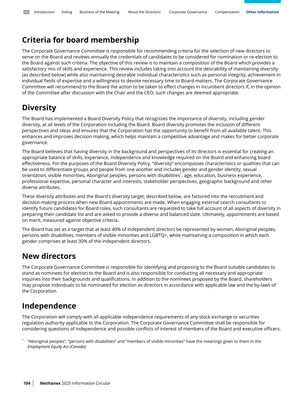 Criteria for board membership The Corporate Governance Committee is responsible for recommending criteria for the selection of new directors to serve on the Board and reviews annually the credentials of candidates to be considered for nomination or re-election to the Board against such criteria. The objective of this review is to maintain a composition of the Board which provides a satisfactory mix of skills and experience. This review includes taking into account the desirability of maintaining diversity (as described below) while also maintaining desirable individual characteristics such as personal integrity, achievement in individual fields of expertise and a willingness to devote necessary time to Board matters. The Corporate Governance Committee will recommend to the Board the action to be taken to effect changes in incumbent directors if, in the opinion of the Committee after discussion with the Chair and the CEO, such changes are deemed appropriate. Diversity The Board has implemented a Board Diversity Policy that recognizes the importance of diversity, including gender diversity, at all levels of the Corporation including the Board. Board diversity promotes the inclusion of different perspectives and ideas and ensures that the Corporation has the opportunity to benefit from all available talent. This enhances and improves decision making, which helps maintain a competitive advantage and makes for better corporate governance. The Board believes that having diversity in the background and perspectives of its directors is essential for creating an appropriate balance of skills, experience, independence and knowledge required on the Board and enhancing board effectiveness. For the purposes of the Board Diversity Policy, “diversity” encompasses characteristics or qualities that can be used to differentiate groups and people from one another and includes gender and gender identity, sexual orientation, visible minorities, Aboriginal peoples, persons with disabilities1, age, education, business experience, professional expertise, personal character and interests, stakeholder perspectives, geographic background and other diverse attributes. These diversity attributes and the Board’s diversity target, described below, are factored into the recruitment and decision-making process when new Board appointments are made. When engaging external search consultants to identify future candidates for Board roles, such consultants are requested to take full account of all aspects of diversity in preparing their candidate list and are asked to provide a diverse and balanced slate. Ultimately, appointments are based on merit, measured against objective criteria. The Board has set as a target that at least 40% of independent directors be represented by women, Aboriginal peoples, persons with disabilities, members of visible minorities and LGBTQ+, while maintaining a composition in which each gender comprises at least 30% of the independent directors. New directors The Corporate Governance Committee is responsible for identifying and proposing to the Board suitable candidates to stand as nominees for election to the Board and is also responsible for conducting all necessary and appropriate inquiries into their backgrounds and qualifications. In addition to the nominees proposed by the Board, shareholders may propose individuals to be nominated for election as directors in accordance with applicable law and the by-laws of the Corporation. Independence The Corporation will comply with all applicable independence requirements of any stock exchange or securities regulation authority applicable to the Corporation. The Corporate Governance Committee shall be responsible for considering questions of independence and possible conflicts of interest of members of the Board and executive officers. 1 “Aboriginal peoples”, “persons with disabilities” and “members of visible minorities” have the meanings given to them in the Employment Equity Act (Canada) Introduction Voting Business of the Meeting About the Directors Corporate Governance Compensation Other Information 104 Methanex 2025 Information Circular
