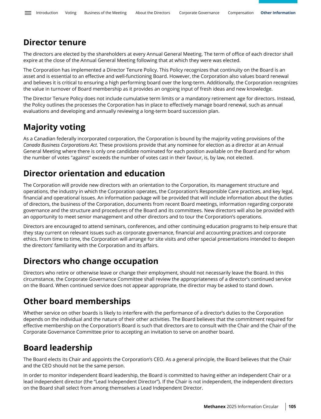 Director tenure The directors are elected by the shareholders at every Annual General Meeting. The term of office of each director shall expire at the close of the Annual General Meeting following that at which they were was elected. The Corporation has implemented a Director Tenure Policy. This Policy recognizes that continuity on the Board is an asset and is essential to an effective and well-functioning Board. However, the Corporation also values board renewal and believes it is critical to ensuring a high performing board over the long-term. Additionally, the Corporation recognizes the value in turnover of Board membership as it provides an ongoing input of fresh ideas and new knowledge. The Director Tenure Policy does not include cumulative term limits or a mandatory retirement age for directors. Instead, the Policy outlines the processes the Corporation has in place to effectively manage board renewal, such as annual evaluations and developing and annually reviewing a long-term board succession plan. Majority voting As a Canadian federally incorporated corporation, the Corporation is bound by the majority voting provisions of the Canada Business Corporations Act. These provisions provide that any nominee for election as a director at an Annual General Meeting where there is only one candidate nominated for each position available on the Board and for whom the number of votes "against" exceeds the number of votes cast in their favour, is, by law, not elected. Director orientation and education The Corporation will provide new directors with an orientation to the Corporation, its management structure and operations, the industry in which the Corporation operates, the Corporation’s Responsible Care practices, and key legal, financial and operational issues. An information package will be provided that will include information about the duties of directors, the business of the Corporation, documents from recent Board meetings, information regarding corporate governance and the structure and procedures of the Board and its committees. New directors will also be provided with an opportunity to meet senior management and other directors and to tour the Corporation’s operations. Directors are encouraged to attend seminars, conferences, and other continuing education programs to help ensure that they stay current on relevant issues such as corporate governance, financial and accounting practices and corporate ethics. From time to time, the Corporation will arrange for site visits and other special presentations intended to deepen the directors’ familiarity with the Corporation and its affairs. Directors who change occupation Directors who retire or otherwise leave or change their employment, should not necessarily leave the Board. In this circumstance, the Corporate Governance Committee shall review the appropriateness of a director’s continued service on the Board. When continued service does not appear appropriate, the director may be asked to stand down. Other board memberships Whether service on other boards is likely to interfere with the performance of a director’s duties to the Corporation depends on the individual and the nature of their other activities. The Board believes that the commitment required for effective membership on the Corporation’s Board is such that directors are to consult with the Chair and the Chair of the Corporate Governance Committee prior to accepting an invitation to serve on another board. Board leadership The Board elects its Chair and appoints the Corporation’s CEO. As a general principle, the Board believes that the Chair and the CEO should not be the same person. In order to monitor independent Board leadership, the Board is committed to having either an independent Chair or a lead independent director (the “Lead Independent Director”). If the Chair is not independent, the independent directors on the Board shall select from among themselves a Lead Independent Director. Introduction Voting Business of the Meeting About the Directors Corporate Governance Compensation Other Information Methanex 2025 Information Circular 105
