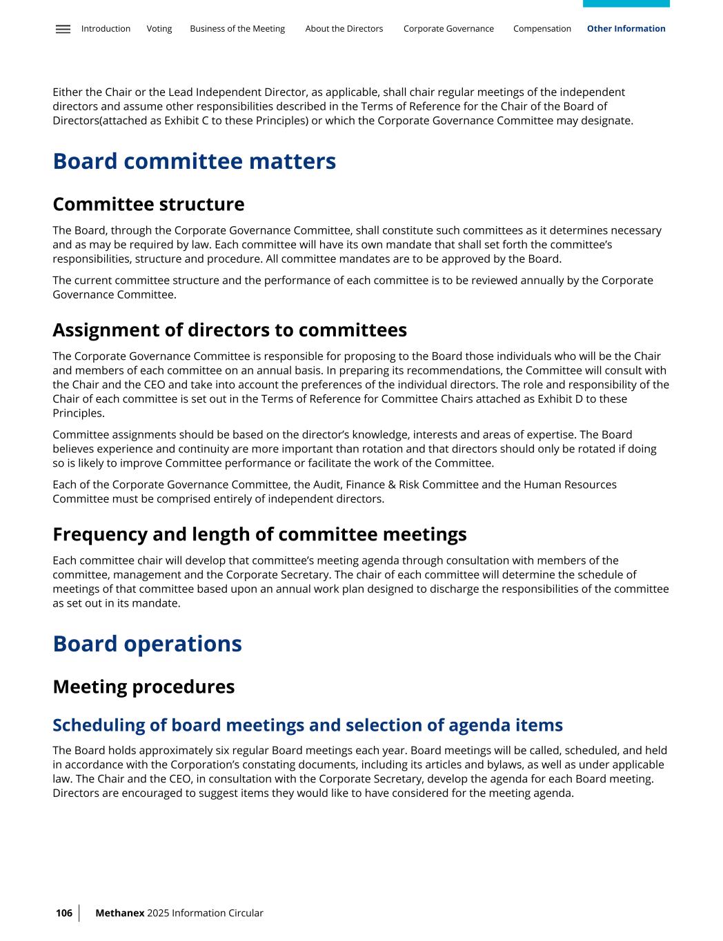 Either the Chair or the Lead Independent Director, as applicable, shall chair regular meetings of the independent directors and assume other responsibilities described in the Terms of Reference for the Chair of the Board of Directors(attached as Exhibit C to these Principles) or which the Corporate Governance Committee may designate. Board committee matters Committee structure The Board, through the Corporate Governance Committee, shall constitute such committees as it determines necessary and as may be required by law. Each committee will have its own mandate that shall set forth the committee’s responsibilities, structure and procedure. All committee mandates are to be approved by the Board. The current committee structure and the performance of each committee is to be reviewed annually by the Corporate Governance Committee. Assignment of directors to committees The Corporate Governance Committee is responsible for proposing to the Board those individuals who will be the Chair and members of each committee on an annual basis. In preparing its recommendations, the Committee will consult with the Chair and the CEO and take into account the preferences of the individual directors. The role and responsibility of the Chair of each committee is set out in the Terms of Reference for Committee Chairs attached as Exhibit D to these Principles. Committee assignments should be based on the director’s knowledge, interests and areas of expertise. The Board believes experience and continuity are more important than rotation and that directors should only be rotated if doing so is likely to improve Committee performance or facilitate the work of the Committee. Each of the Corporate Governance Committee, the Audit, Finance & Risk Committee and the Human Resources Committee must be comprised entirely of independent directors. Frequency and length of committee meetings Each committee chair will develop that committee’s meeting agenda through consultation with members of the committee, management and the Corporate Secretary. The chair of each committee will determine the schedule of meetings of that committee based upon an annual work plan designed to discharge the responsibilities of the committee as set out in its mandate. Board operations Meeting procedures Scheduling of board meetings and selection of agenda items The Board holds approximately six regular Board meetings each year. Board meetings will be called, scheduled, and held in accordance with the Corporation’s constating documents, including its articles and bylaws, as well as under applicable law. The Chair and the CEO, in consultation with the Corporate Secretary, develop the agenda for each Board meeting. Directors are encouraged to suggest items they would like to have considered for the meeting agenda. Introduction Voting Business of the Meeting About the Directors Corporate Governance Compensation Other Information 106 Methanex 2025 Information Circular