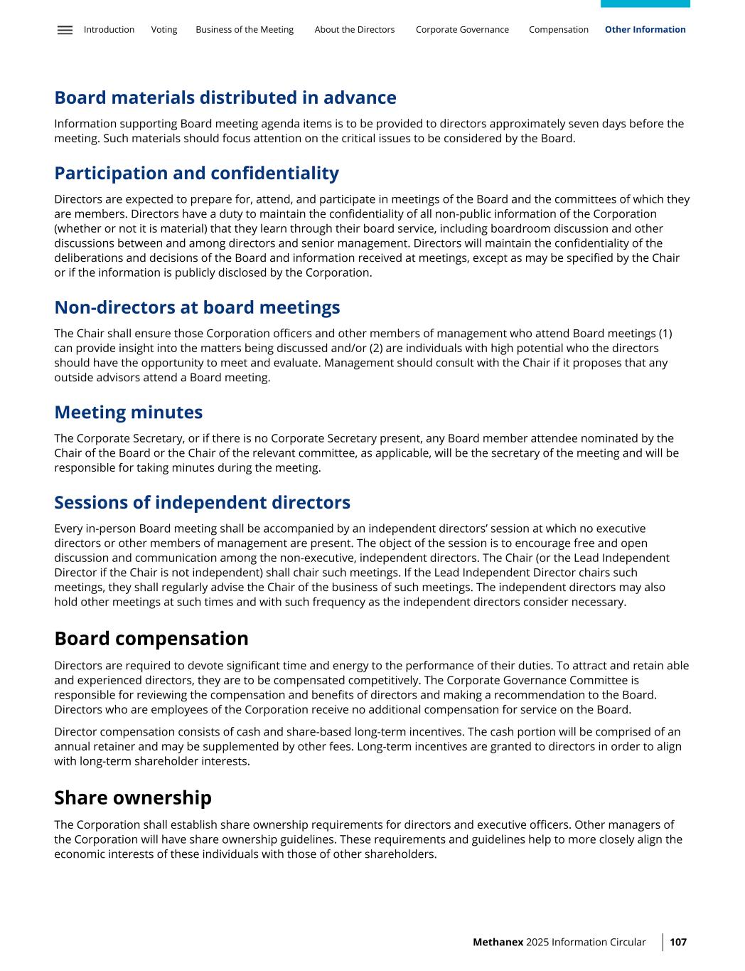 Board materials distributed in advance Information supporting Board meeting agenda items is to be provided to directors approximately seven days before the meeting. Such materials should focus attention on the critical issues to be considered by the Board. Participation and confidentiality Directors are expected to prepare for, attend, and participate in meetings of the Board and the committees of which they are members. Directors have a duty to maintain the confidentiality of all non-public information of the Corporation (whether or not it is material) that they learn through their board service, including boardroom discussion and other discussions between and among directors and senior management. Directors will maintain the confidentiality of the deliberations and decisions of the Board and information received at meetings, except as may be specified by the Chair or if the information is publicly disclosed by the Corporation. Non-directors at board meetings The Chair shall ensure those Corporation officers and other members of management who attend Board meetings (1) can provide insight into the matters being discussed and/or (2) are individuals with high potential who the directors should have the opportunity to meet and evaluate. Management should consult with the Chair if it proposes that any outside advisors attend a Board meeting. Meeting minutes The Corporate Secretary, or if there is no Corporate Secretary present, any Board member attendee nominated by the Chair of the Board or the Chair of the relevant committee, as applicable, will be the secretary of the meeting and will be responsible for taking minutes during the meeting. Sessions of independent directors Every in-person Board meeting shall be accompanied by an independent directors’ session at which no executive directors or other members of management are present. The object of the session is to encourage free and open discussion and communication among the non-executive, independent directors. The Chair (or the Lead Independent Director if the Chair is not independent) shall chair such meetings. If the Lead Independent Director chairs such meetings, they shall regularly advise the Chair of the business of such meetings. The independent directors may also hold other meetings at such times and with such frequency as the independent directors consider necessary. Board compensation Directors are required to devote significant time and energy to the performance of their duties. To attract and retain able and experienced directors, they are to be compensated competitively. The Corporate Governance Committee is responsible for reviewing the compensation and benefits of directors and making a recommendation to the Board. Directors who are employees of the Corporation receive no additional compensation for service on the Board. Director compensation consists of cash and share-based long-term incentives. The cash portion will be comprised of an annual retainer and may be supplemented by other fees. Long-term incentives are granted to directors in order to align with long-term shareholder interests. Share ownership The Corporation shall establish share ownership requirements for directors and executive officers. Other managers of the Corporation will have share ownership guidelines. These requirements and guidelines help to more closely align the economic interests of these individuals with those of other shareholders. Introduction Voting Business of the Meeting About the Directors Corporate Governance Compensation Other Information Methanex 2025 Information Circular 107