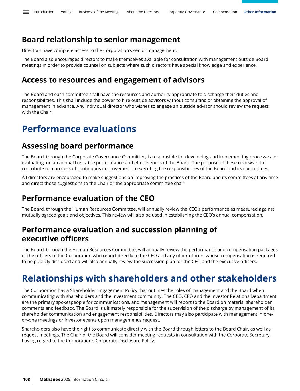Board relationship to senior management Directors have complete access to the Corporation’s senior management. The Board also encourages directors to make themselves available for consultation with management outside Board meetings in order to provide counsel on subjects where such directors have special knowledge and experience. Access to resources and engagement of advisors The Board and each committee shall have the resources and authority appropriate to discharge their duties and responsibilities. This shall include the power to hire outside advisors without consulting or obtaining the approval of management in advance. Any individual director who wishes to engage an outside advisor should review the request with the Chair. Performance evaluations Assessing board performance The Board, through the Corporate Governance Committee, is responsible for developing and implementing processes for evaluating, on an annual basis, the performance and effectiveness of the Board. The purpose of these reviews is to contribute to a process of continuous improvement in executing the responsibilities of the Board and its committees. All directors are encouraged to make suggestions on improving the practices of the Board and its committees at any time and direct those suggestions to the Chair or the appropriate committee chair. Performance evaluation of the CEO The Board, through the Human Resources Committee, will annually review the CEO’s performance as measured against mutually agreed goals and objectives. This review will also be used in establishing the CEO’s annual compensation. Performance evaluation and succession planning of executive officers The Board, through the Human Resources Committee, will annually review the performance and compensation packages of the officers of the Corporation who report directly to the CEO and any other officers whose compensation is required to be publicly disclosed and will also annually review the succession plan for the CEO and the executive officers. Relationships with shareholders and other stakeholders The Corporation has a Shareholder Engagement Policy that outlines the roles of management and the Board when communicating with shareholders and the investment community. The CEO, CFO and the Investor Relations Department are the primary spokespeople for communications, and management will report to the Board on material shareholder comments and feedback. The Board is ultimately responsible for the supervision of the discharge by management of its shareholder communication and engagement responsibilities. Directors may also participate with management in one- on-one meetings or investor events upon management’s request. Shareholders also have the right to communicate directly with the Board through letters to the Board Chair, as well as request meetings. The Chair of the Board will consider meeting requests in consultation with the Corporate Secretary, having regard to the Corporation’s Corporate Disclosure Policy. Introduction Voting Business of the Meeting About the Directors Corporate Governance Compensation Other Information 108 Methanex 2025 Information Circular