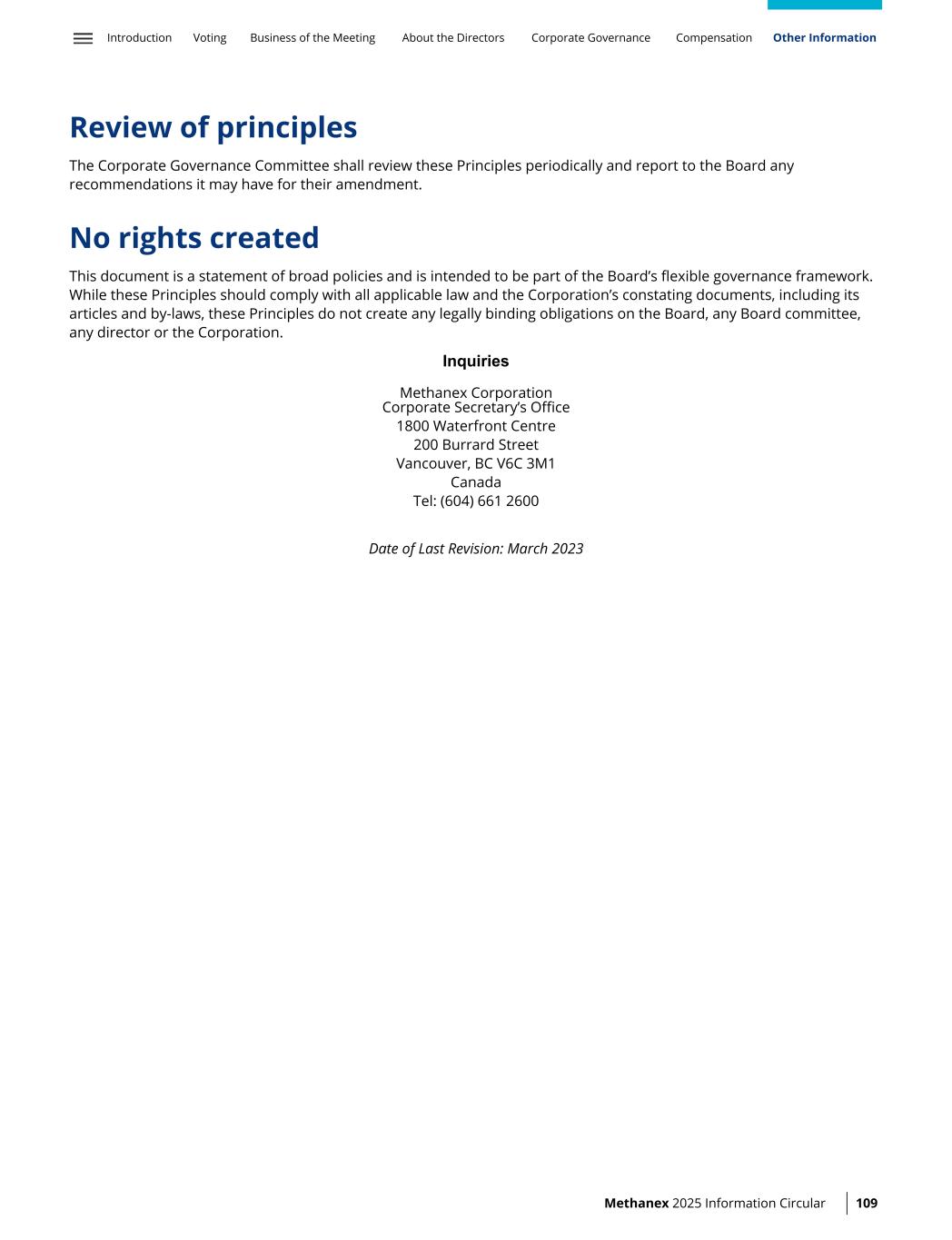 Review of principles The Corporate Governance Committee shall review these Principles periodically and report to the Board any recommendations it may have for their amendment. No rights created This document is a statement of broad policies and is intended to be part of the Board’s flexible governance framework. While these Principles should comply with all applicable law and the Corporation’s constating documents, including its articles and by-laws, these Principles do not create any legally binding obligations on the Board, any Board committee, any director or the Corporation. Inquiries Methanex Corporation Corporate Secretary’s Office 1800 Waterfront Centre 200 Burrard Street Vancouver, BC V6C 3M1 Canada Tel: (604) 661 2600 Date of Last Revision: March 2023 Introduction Voting Business of the Meeting About the Directors Corporate Governance Compensation Other Information Methanex 2025 Information Circular 109