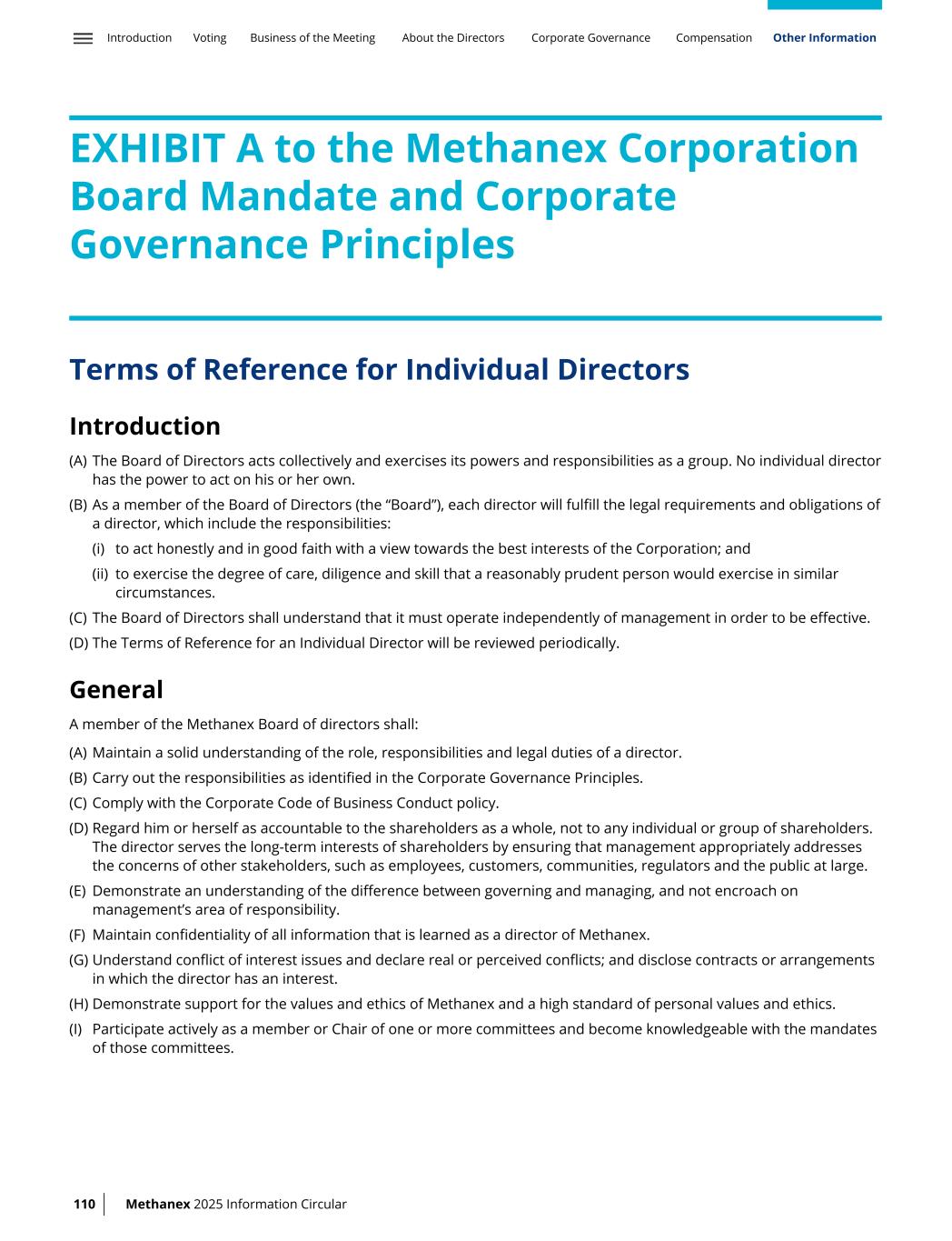 EXHIBIT A to the Methanex Corporation Board Mandate and Corporate Governance Principles Terms of Reference for Individual Directors Introduction (A) The Board of Directors acts collectively and exercises its powers and responsibilities as a group. No individual director has the power to act on his or her own. (B) As a member of the Board of Directors (the “Board”), each director will fulfill the legal requirements and obligations of a director, which include the responsibilities: (i) to act honestly and in good faith with a view towards the best interests of the Corporation; and (ii) to exercise the degree of care, diligence and skill that a reasonably prudent person would exercise in similar circumstances. (C) The Board of Directors shall understand that it must operate independently of management in order to be effective. (D) The Terms of Reference for an Individual Director will be reviewed periodically. General A member of the Methanex Board of directors shall: (A) Maintain a solid understanding of the role, responsibilities and legal duties of a director. (B) Carry out the responsibilities as identified in the Corporate Governance Principles. (C) Comply with the Corporate Code of Business Conduct policy. (D) Regard him or herself as accountable to the shareholders as a whole, not to any individual or group of shareholders. The director serves the long-term interests of shareholders by ensuring that management appropriately addresses the concerns of other stakeholders, such as employees, customers, communities, regulators and the public at large. (E) Demonstrate an understanding of the difference between governing and managing, and not encroach on management’s area of responsibility. (F) Maintain confidentiality of all information that is learned as a director of Methanex. (G) Understand conflict of interest issues and declare real or perceived conflicts; and disclose contracts or arrangements in which the director has an interest. (H) Demonstrate support for the values and ethics of Methanex and a high standard of personal values and ethics. (I) Participate actively as a member or Chair of one or more committees and become knowledgeable with the mandates of those committees. Introduction Voting Business of the Meeting About the Directors Corporate Governance Compensation Other Information 110 Methanex 2025 Information Circular