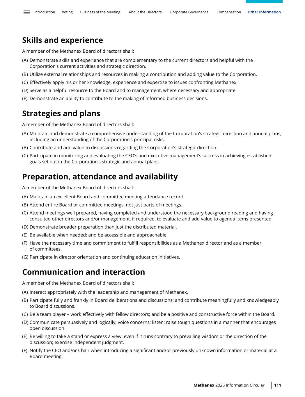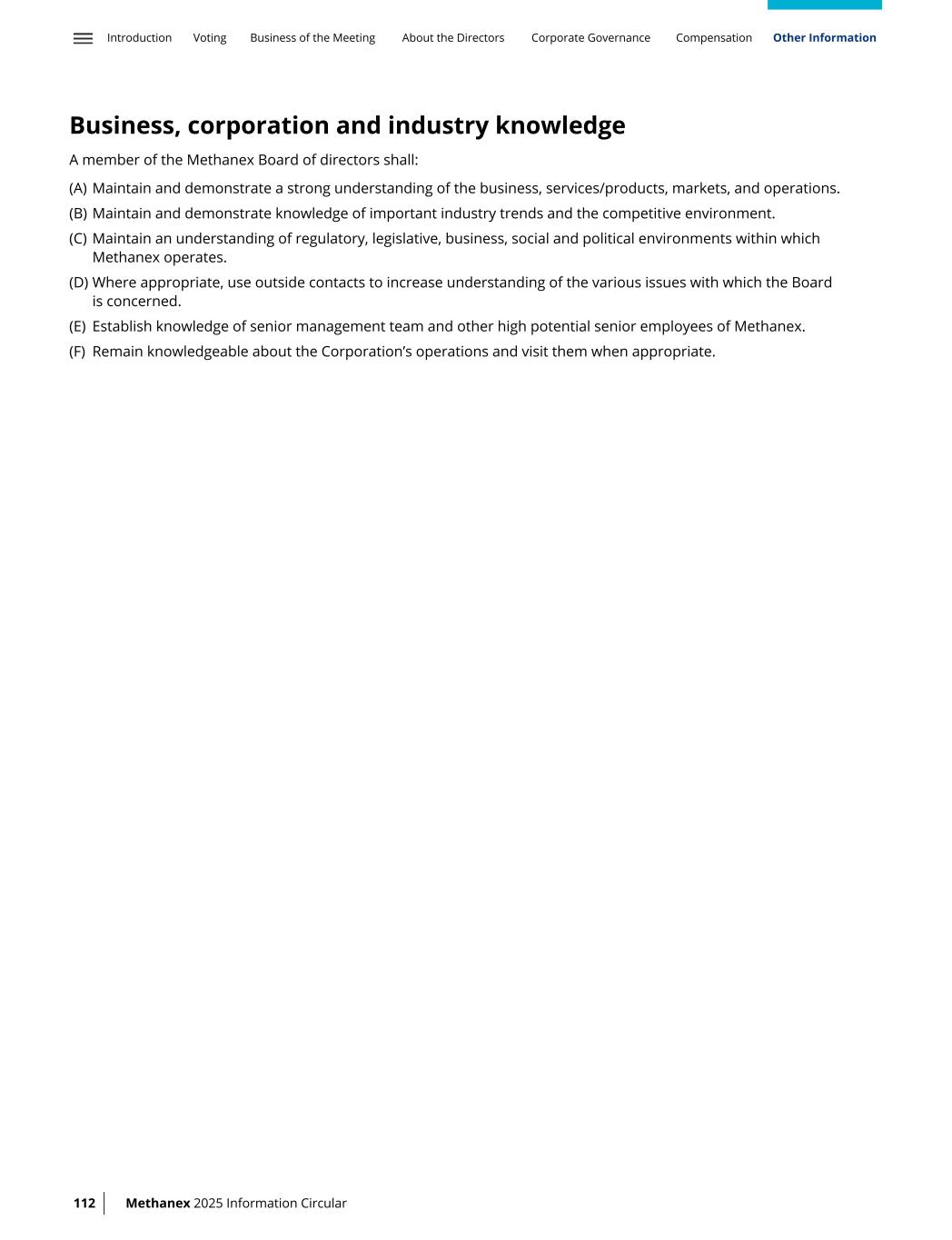 Business, corporation and industry knowledge A member of the Methanex Board of directors shall: (A) Maintain and demonstrate a strong understanding of the business, services/products, markets, and operations. (B) Maintain and demonstrate knowledge of important industry trends and the competitive environment. (C) Maintain an understanding of regulatory, legislative, business, social and political environments within which Methanex operates. (D) Where appropriate, use outside contacts to increase understanding of the various issues with which the Board is concerned. (E) Establish knowledge of senior management team and other high potential senior employees of Methanex. (F) Remain knowledgeable about the Corporation’s operations and visit them when appropriate. Introduction Voting Business of the Meeting About the Directors Corporate Governance Compensation Other Information 112 Methanex 2025 Information Circular
