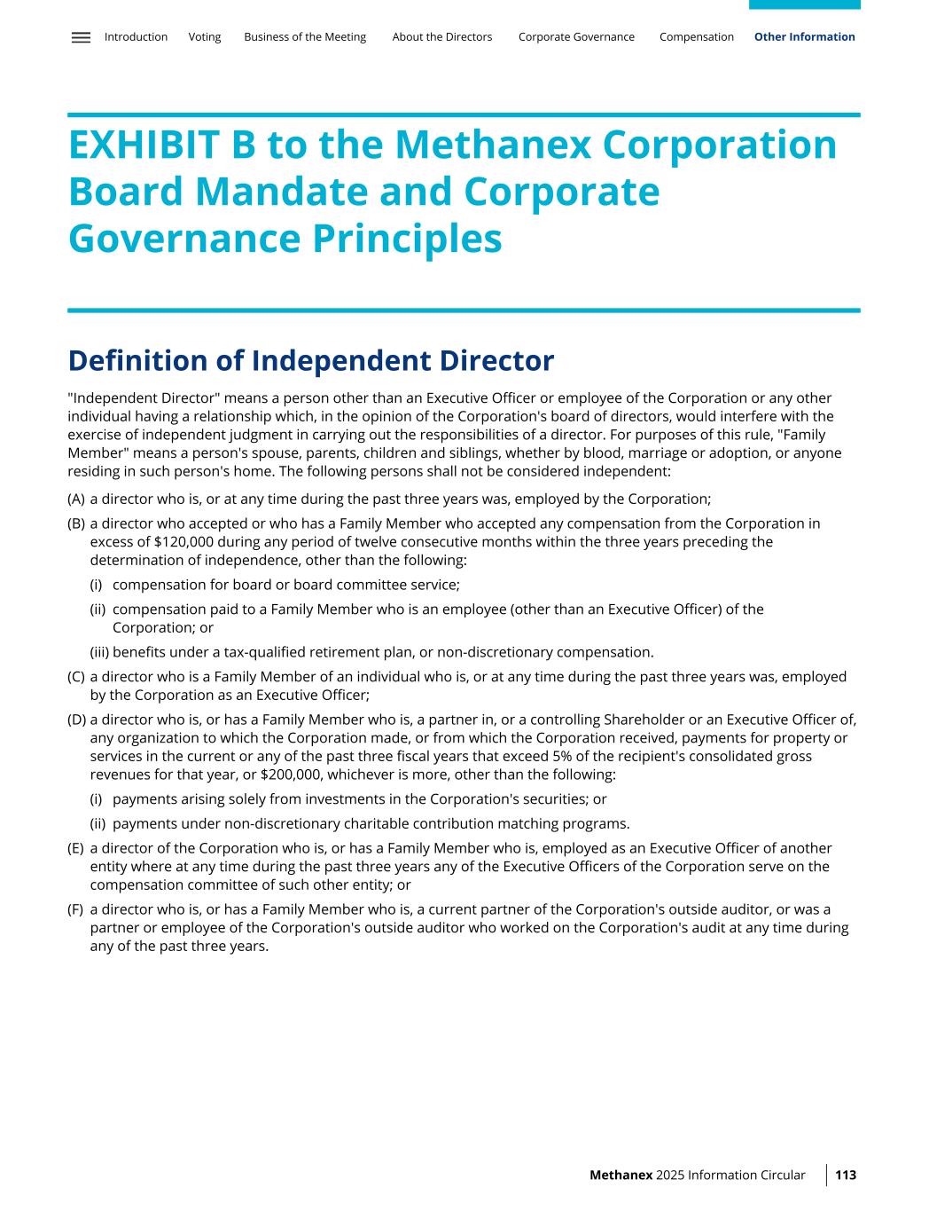 EXHIBIT B to the Methanex Corporation Board Mandate and Corporate Governance Principles Definition of Independent Director "Independent Director" means a person other than an Executive Officer or employee of the Corporation or any other individual having a relationship which, in the opinion of the Corporation's board of directors, would interfere with the exercise of independent judgment in carrying out the responsibilities of a director. For purposes of this rule, "Family Member" means a person's spouse, parents, children and siblings, whether by blood, marriage or adoption, or anyone residing in such person's home. The following persons shall not be considered independent: (A) a director who is, or at any time during the past three years was, employed by the Corporation; (B) a director who accepted or who has a Family Member who accepted any compensation from the Corporation in excess of $120,000 during any period of twelve consecutive months within the three years preceding the determination of independence, other than the following: (i) compensation for board or board committee service; (ii) compensation paid to a Family Member who is an employee (other than an Executive Officer) of the Corporation; or (iii) benefits under a tax-qualified retirement plan, or non-discretionary compensation. (C) a director who is a Family Member of an individual who is, or at any time during the past three years was, employed by the Corporation as an Executive Officer; (D) a director who is, or has a Family Member who is, a partner in, or a controlling Shareholder or an Executive Officer of, any organization to which the Corporation made, or from which the Corporation received, payments for property or services in the current or any of the past three fiscal years that exceed 5% of the recipient's consolidated gross revenues for that year, or $200,000, whichever is more, other than the following: (i) payments arising solely from investments in the Corporation's securities; or (ii) payments under non-discretionary charitable contribution matching programs. (E) a director of the Corporation who is, or has a Family Member who is, employed as an Executive Officer of another entity where at any time during the past three years any of the Executive Officers of the Corporation serve on the compensation committee of such other entity; or (F) a director who is, or has a Family Member who is, a current partner of the Corporation's outside auditor, or was a partner or employee of the Corporation's outside auditor who worked on the Corporation's audit at any time during any of the past three years. Introduction Voting Business of the Meeting About the Directors Corporate Governance Compensation Other Information Methanex 2025 Information Circular 113