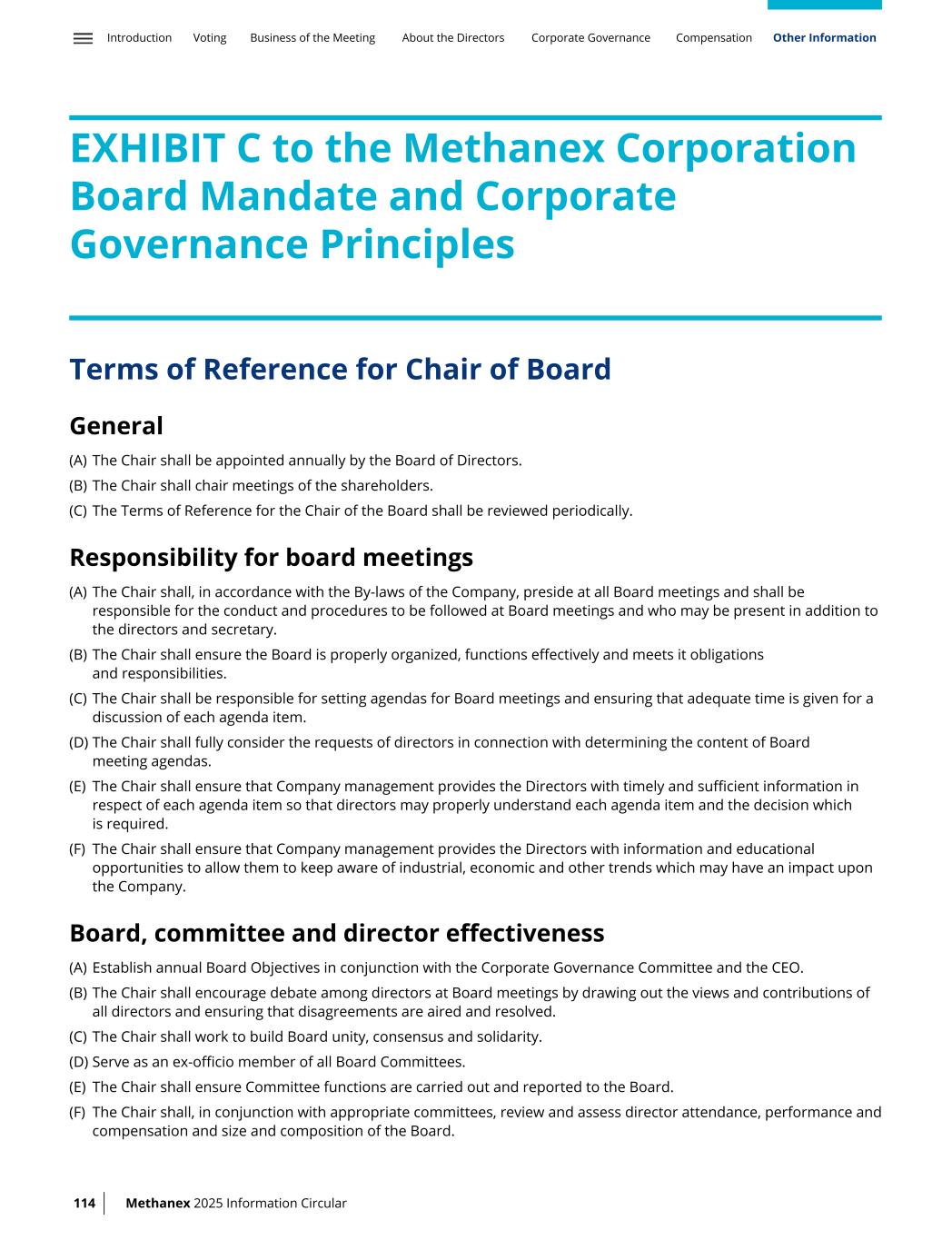 EXHIBIT C to the Methanex Corporation Board Mandate and Corporate Governance Principles Terms of Reference for Chair of Board General (A) The Chair shall be appointed annually by the Board of Directors. (B) The Chair shall chair meetings of the shareholders. (C) The Terms of Reference for the Chair of the Board shall be reviewed periodically. Responsibility for board meetings (A) The Chair shall, in accordance with the By-laws of the Company, preside at all Board meetings and shall be responsible for the conduct and procedures to be followed at Board meetings and who may be present in addition to the directors and secretary. (B) The Chair shall ensure the Board is properly organized, functions effectively and meets it obligations and responsibilities. (C) The Chair shall be responsible for setting agendas for Board meetings and ensuring that adequate time is given for a discussion of each agenda item. (D) The Chair shall fully consider the requests of directors in connection with determining the content of Board meeting agendas. (E) The Chair shall ensure that Company management provides the Directors with timely and sufficient information in respect of each agenda item so that directors may properly understand each agenda item and the decision which is required. (F) The Chair shall ensure that Company management provides the Directors with information and educational opportunities to allow them to keep aware of industrial, economic and other trends which may have an impact upon the Company. Board, committee and director effectiveness (A) Establish annual Board Objectives in conjunction with the Corporate Governance Committee and the CEO. (B) The Chair shall encourage debate among directors at Board meetings by drawing out the views and contributions of all directors and ensuring that disagreements are aired and resolved. (C) The Chair shall work to build Board unity, consensus and solidarity. (D) Serve as an ex-officio member of all Board Committees. (E) The Chair shall ensure Committee functions are carried out and reported to the Board. (F) The Chair shall, in conjunction with appropriate committees, review and assess director attendance, performance and compensation and size and composition of the Board. Introduction Voting Business of the Meeting About the Directors Corporate Governance Compensation Other Information 114 Methanex 2025 Information Circular