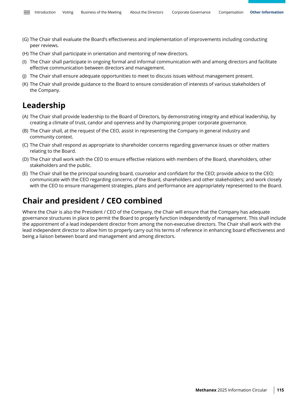 (G) The Chair shall evaluate the Board’s effectiveness and implementation of improvements including conducting peer reviews. (H) The Chair shall participate in orientation and mentoring of new directors. (I) The Chair shall participate in ongoing formal and informal communication with and among directors and facilitate effective communication between directors and management. (J) The Chair shall ensure adequate opportunities to meet to discuss issues without management present. (K) The Chair shall provide guidance to the Board to ensure consideration of interests of various stakeholders of the Company. Leadership (A) The Chair shall provide leadership to the Board of Directors, by demonstrating integrity and ethical leadership, by creating a climate of trust, candor and openness and by championing proper corporate governance. (B) The Chair shall, at the request of the CEO, assist in representing the Company in general industry and community context. (C) The Chair shall respond as appropriate to shareholder concerns regarding governance issues or other matters relating to the Board. (D) The Chair shall work with the CEO to ensure effective relations with members of the Board, shareholders, other stakeholders and the public. (E) The Chair shall be the principal sounding board, counselor and confidant for the CEO; provide advice to the CEO; communicate with the CEO regarding concerns of the Board, shareholders and other stakeholders; and work closely with the CEO to ensure management strategies, plans and performance are appropriately represented to the Board. Chair and president / CEO combined Where the Chair is also the President / CEO of the Company, the Chair will ensure that the Company has adequate governance structures in place to permit the Board to properly function independently of management. This shall include the appointment of a lead independent director from among the non-executive directors. The Chair shall work with the lead independent director to allow him to properly carry out his terms of reference in enhancing board effectiveness and being a liaison between board and management and among directors. Introduction Voting Business of the Meeting About the Directors Corporate Governance Compensation Other Information Methanex 2025 Information Circular 115