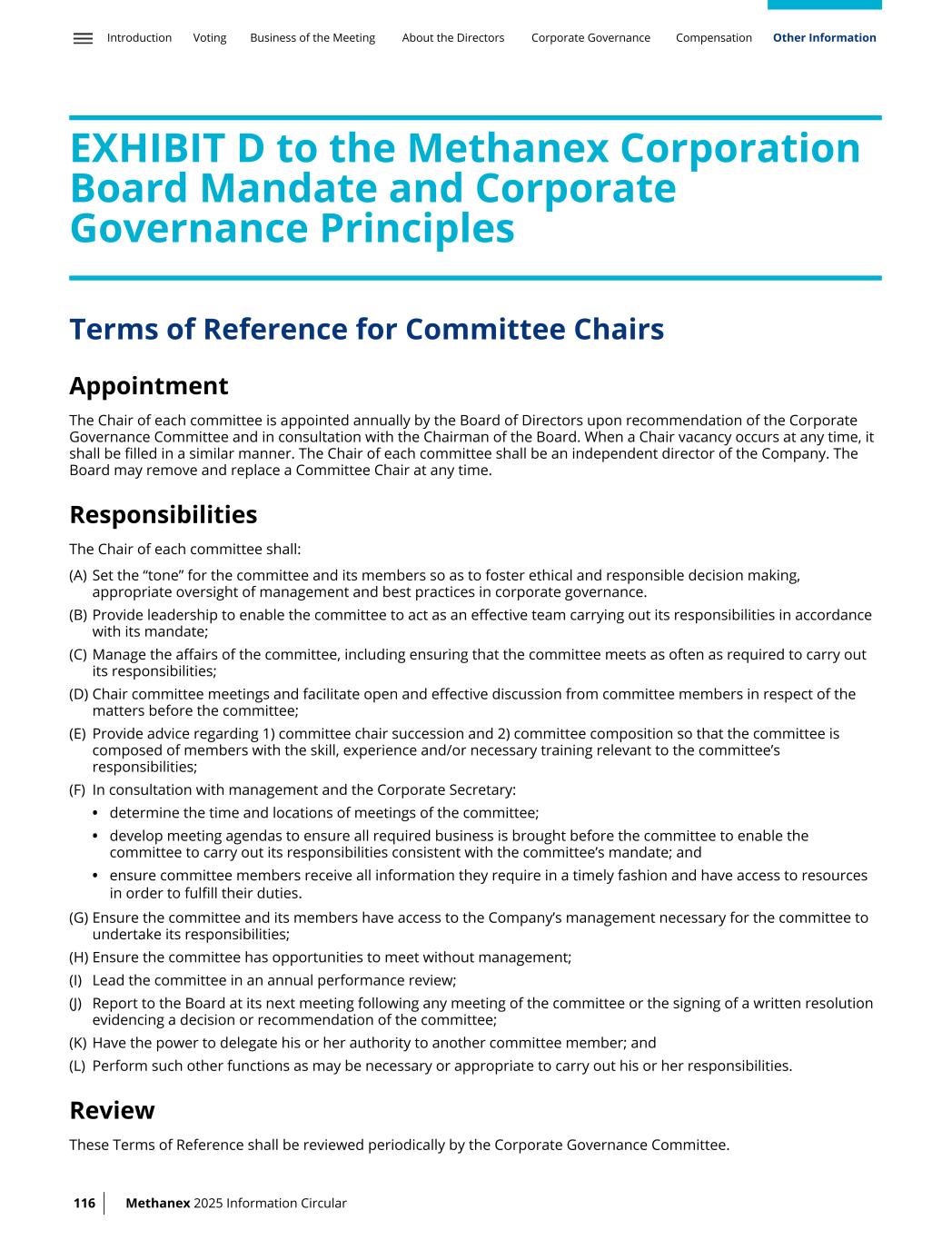 EXHIBIT D to the Methanex Corporation Board Mandate and Corporate Governance Principles Terms of Reference for Committee Chairs Appointment The Chair of each committee is appointed annually by the Board of Directors upon recommendation of the Corporate Governance Committee and in consultation with the Chairman of the Board. When a Chair vacancy occurs at any time, it shall be filled in a similar manner. The Chair of each committee shall be an independent director of the Company. The Board may remove and replace a Committee Chair at any time. Responsibilities The Chair of each committee shall: (A) Set the “tone” for the committee and its members so as to foster ethical and responsible decision making, appropriate oversight of management and best practices in corporate governance. (B) Provide leadership to enable the committee to act as an effective team carrying out its responsibilities in accordance with its mandate; (C) Manage the affairs of the committee, including ensuring that the committee meets as often as required to carry out its responsibilities; (D) Chair committee meetings and facilitate open and effective discussion from committee members in respect of the matters before the committee; (E) Provide advice regarding 1) committee chair succession and 2) committee composition so that the committee is composed of members with the skill, experience and/or necessary training relevant to the committee’s responsibilities; (F) In consultation with management and the Corporate Secretary: • determine the time and locations of meetings of the committee; • develop meeting agendas to ensure all required business is brought before the committee to enable the committee to carry out its responsibilities consistent with the committee’s mandate; and • ensure committee members receive all information they require in a timely fashion and have access to resources in order to fulfill their duties. (G) Ensure the committee and its members have access to the Company’s management necessary for the committee to undertake its responsibilities; (H) Ensure the committee has opportunities to meet without management; (I) Lead the committee in an annual performance review; (J) Report to the Board at its next meeting following any meeting of the committee or the signing of a written resolution evidencing a decision or recommendation of the committee; (K) Have the power to delegate his or her authority to another committee member; and (L) Perform such other functions as may be necessary or appropriate to carry out his or her responsibilities. Review These Terms of Reference shall be reviewed periodically by the Corporate Governance Committee. Introduction Voting Business of the Meeting About the Directors Corporate Governance Compensation Other Information 116 Methanex 2025 Information Circular