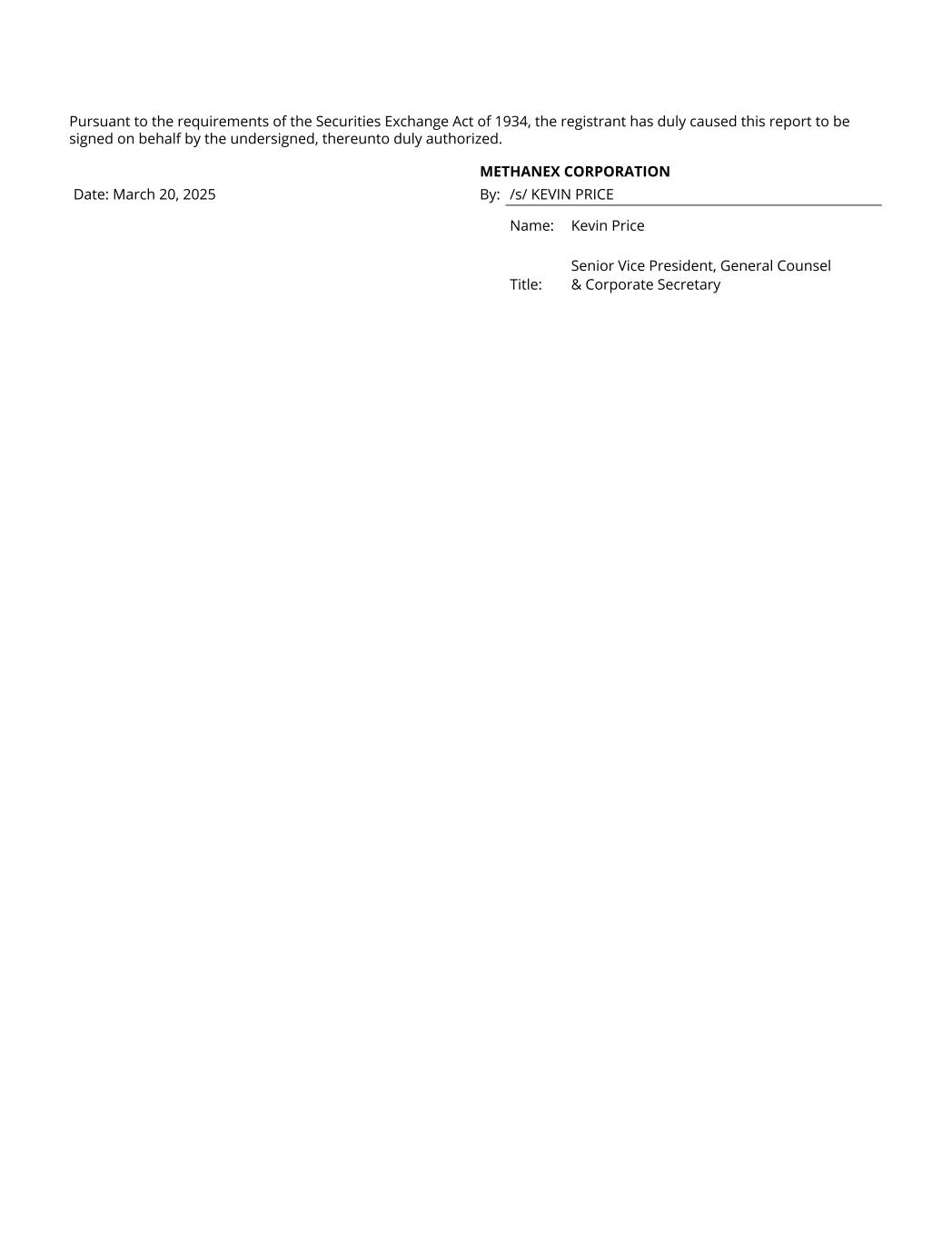 Pursuant to the requirements of the Securities Exchange Act of 1934, the registrant has duly caused this report to be signed on behalf by the undersigned, thereunto duly authorized. METHANEX CORPORATION Date: March 20, 2025 By: /s/ KEVIN PRICE Name: Kevin Price Title: Senior Vice President, General Counsel & Corporate Secretary