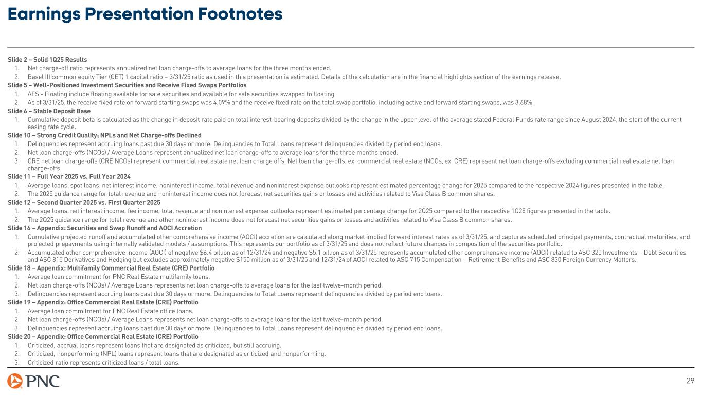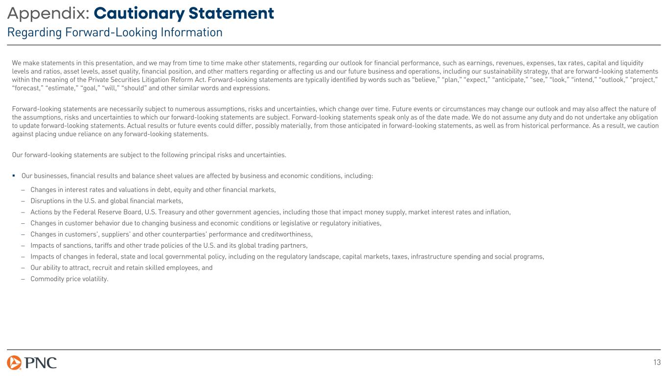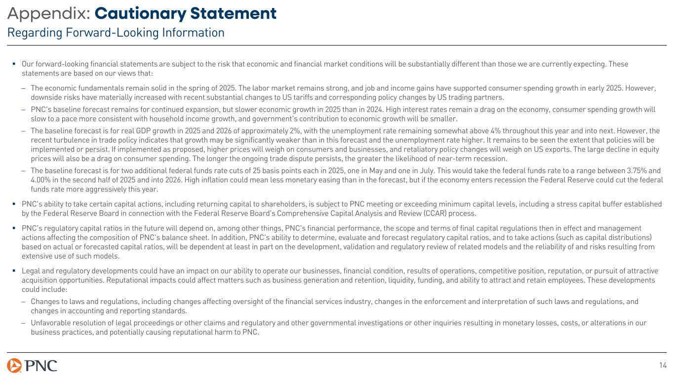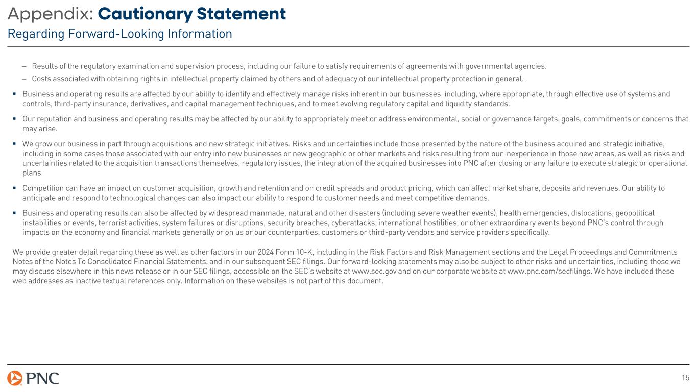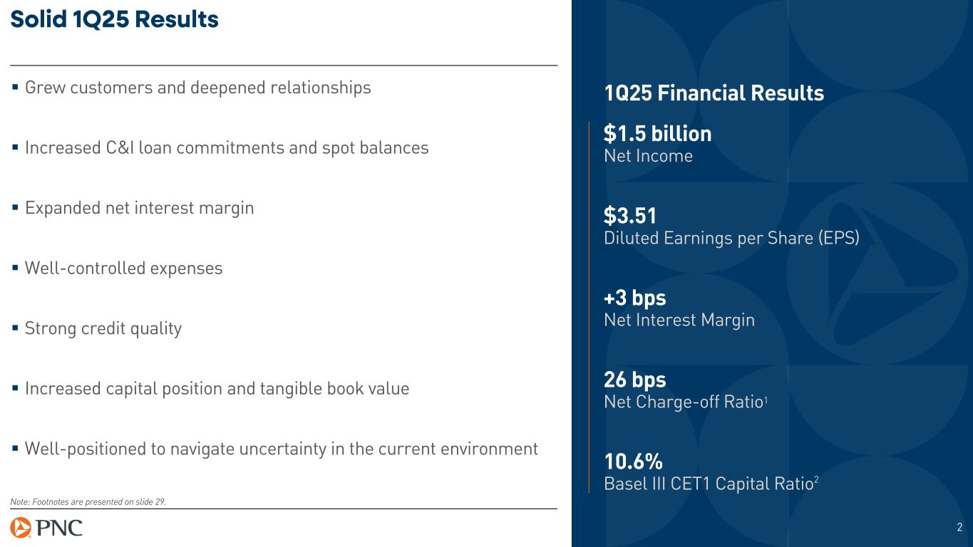 1 Cautionary Statement Regarding Forward-Looking and non-GAAP Financial Information Our earnings conference call presentation is not intended as a full business or financial review and should be viewed in the context of all of the information made available by PNC in its SEC filings and on our corporate website. The presentation contains forward-looking statements regarding our outlook for financial performance, such as earnings, revenues, expenses, tax rates, capital and liquidity levels and ratios, asset levels, asset quality, financial position, and other matters regarding or affecting PNC and its future business and operations, including sustainability strategy. Forward-looking statements are necessarily subject to numerous assumptions, risks and uncertainties, which change over time. The forward-looking statements in this presentation are qualified by the factors affecting forward- looking statements identified in the more detailed Cautionary Statement included in the Appendix. We provide greater detail regarding these as well as other factors in our 2024 Form 10-K and our subsequent SEC filings. Our forward-looking statements may also be subject to risks and uncertainties including those we may discuss in this presentation or in our SEC filings. Future events or circumstances may change our outlook and may also affect the nature of the assumptions, risks and uncertainties to which our forward-looking statements are subject. Forward-looking statements in this presentation speak only as of the date of this presentation. We do not assume any duty and do not undertake any obligation to update those statements. Actual results or future events could differ, possibly materially, from those anticipated in forward-looking statements, as well as from historical performance. As a result, we caution against placing undue reliance on any forward-looking statements. We include non-GAAP financial information in this presentation. Reconciliations for such financial information may be found in our presentation, in these slides, including the Appendix, in other materials on our corporate website, and in our SEC filings. This information supplements our results as reported in accordance with GAAP and should not be viewed in isolation from, or as a substitute for, our GAAP results. We believe that this information and the related reconciliations may be useful to investors, analysts, regulators and others to help understand and evaluate our financial results, and with respect to adjusted metrics, because we believe they better reflect the ongoing financial results and trends of our businesses and increase comparability of period-to-period results. We may also use annualized, pro forma, estimated or third party numbers for illustrative or comparative purposes only. These may not reflect actual results. References to our corporate website are to www.pnc.com under “About Us - Investor Relations.” Our SEC filings are available both on our corporate website and on the SEC’s website at www.sec.gov. We include web addresses here as inactive textual references only. Information on these websites is not part of this presentation.