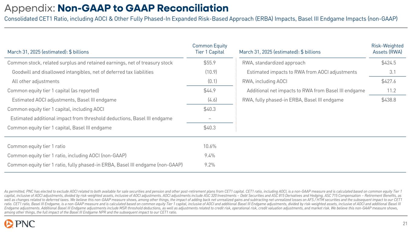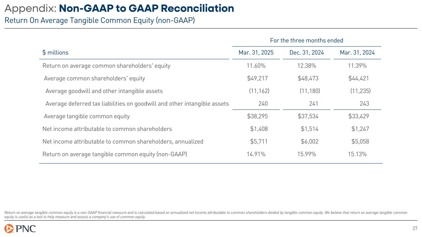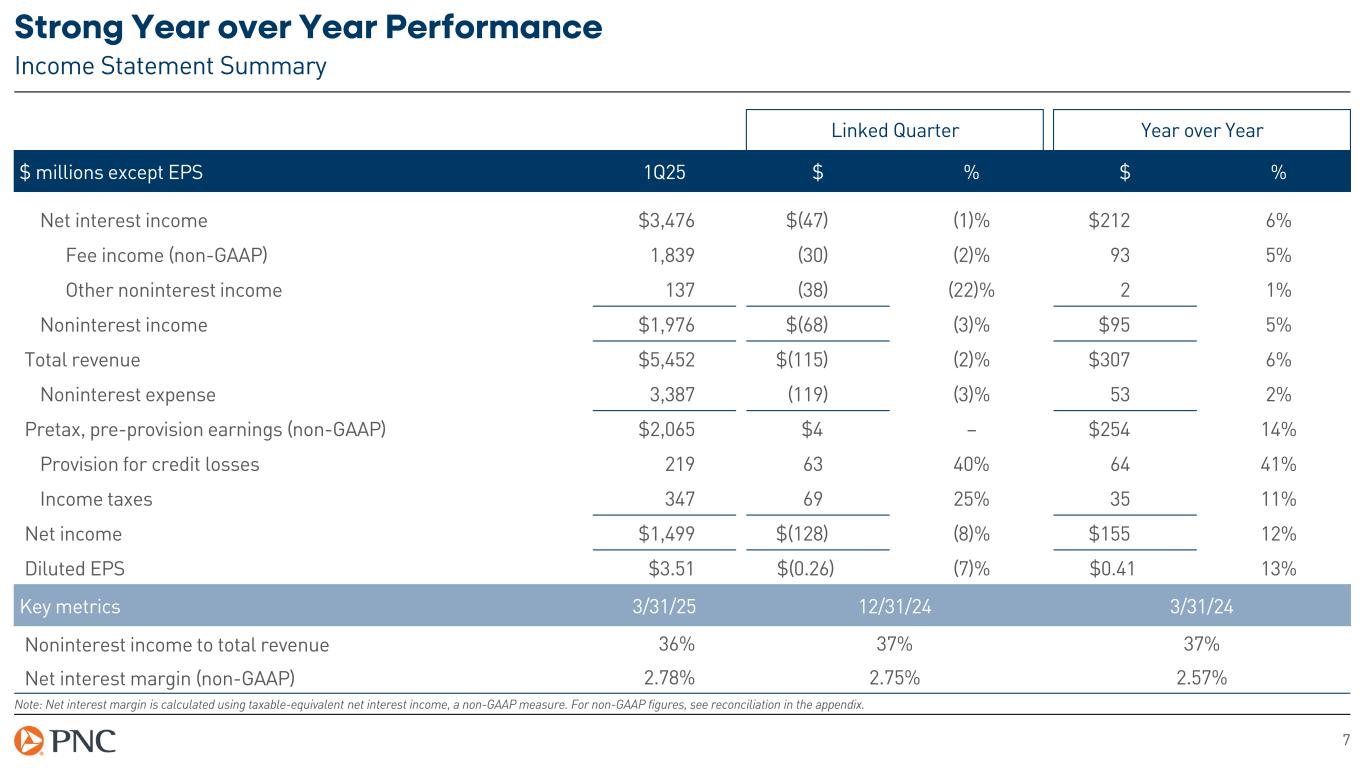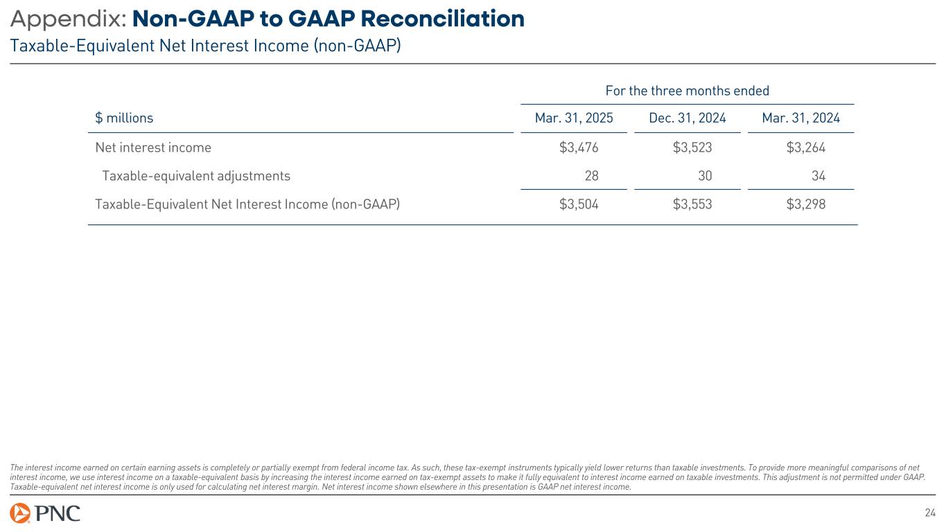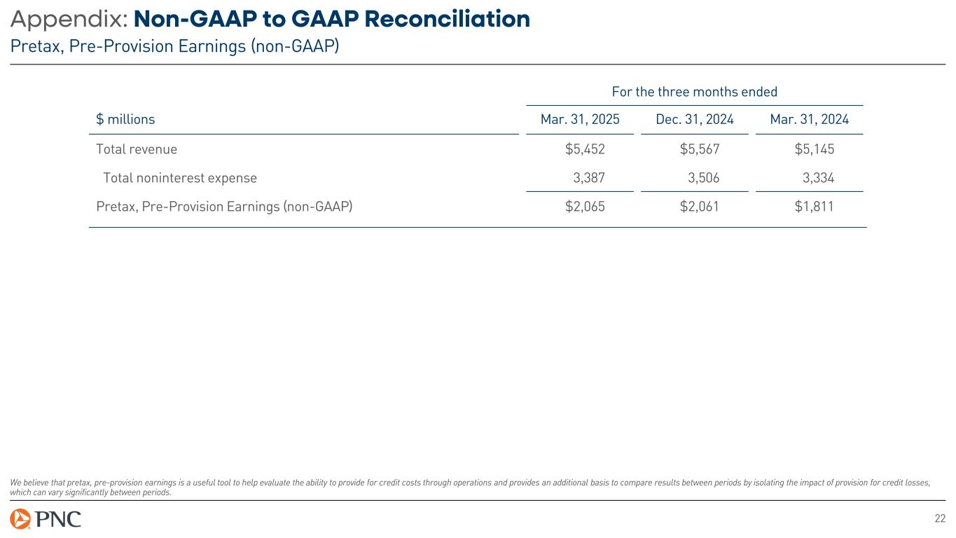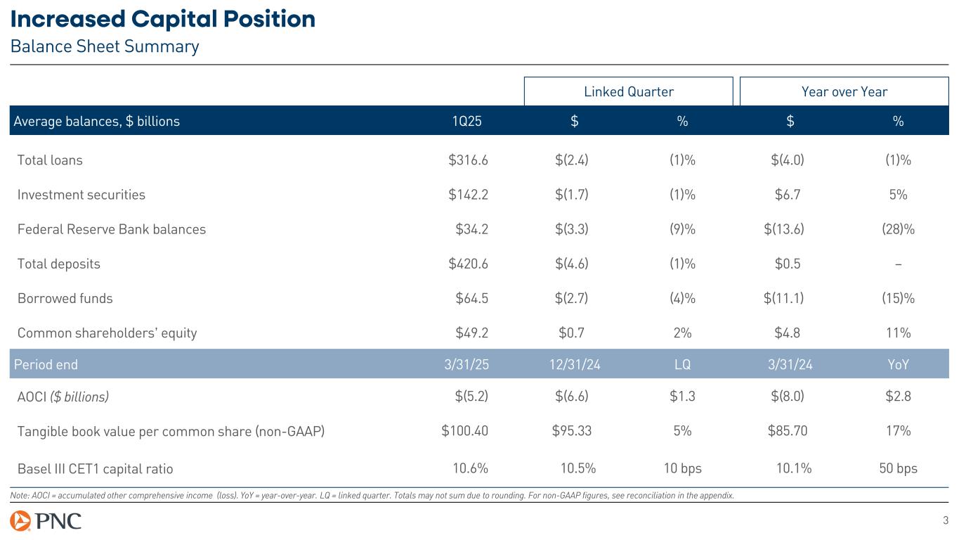 1 Cautionary Statement Regarding Forward-Looking and non-GAAP Financial Information Our earnings conference call presentation is not intended as a full business or financial review and should be viewed in the context of all of the information made available by PNC in its SEC filings and on our corporate website. The presentation contains forward-looking statements regarding our outlook for financial performance, such as earnings, revenues, expenses, tax rates, capital and liquidity levels and ratios, asset levels, asset quality, financial position, and other matters regarding or affecting PNC and its future business and operations, including sustainability strategy. Forward-looking statements are necessarily subject to numerous assumptions, risks and uncertainties, which change over time. The forward-looking statements in this presentation are qualified by the factors affecting forward- looking statements identified in the more detailed Cautionary Statement included in the Appendix. We provide greater detail regarding these as well as other factors in our 2024 Form 10-K and our subsequent SEC filings. Our forward-looking statements may also be subject to risks and uncertainties including those we may discuss in this presentation or in our SEC filings. Future events or circumstances may change our outlook and may also affect the nature of the assumptions, risks and uncertainties to which our forward-looking statements are subject. Forward-looking statements in this presentation speak only as of the date of this presentation. We do not assume any duty and do not undertake any obligation to update those statements. Actual results or future events could differ, possibly materially, from those anticipated in forward-looking statements, as well as from historical performance. As a result, we caution against placing undue reliance on any forward-looking statements. We include non-GAAP financial information in this presentation. Reconciliations for such financial information may be found in our presentation, in these slides, including the Appendix, in other materials on our corporate website, and in our SEC filings. This information supplements our results as reported in accordance with GAAP and should not be viewed in isolation from, or as a substitute for, our GAAP results. We believe that this information and the related reconciliations may be useful to investors, analysts, regulators and others to help understand and evaluate our financial results, and with respect to adjusted metrics, because we believe they better reflect the ongoing financial results and trends of our businesses and increase comparability of period-to-period results. We may also use annualized, pro forma, estimated or third party numbers for illustrative or comparative purposes only. These may not reflect actual results. References to our corporate website are to www.pnc.com under “About Us - Investor Relations.” Our SEC filings are available both on our corporate website and on the SEC’s website at www.sec.gov. We include web addresses here as inactive textual references only. Information on these websites is not part of this presentation.