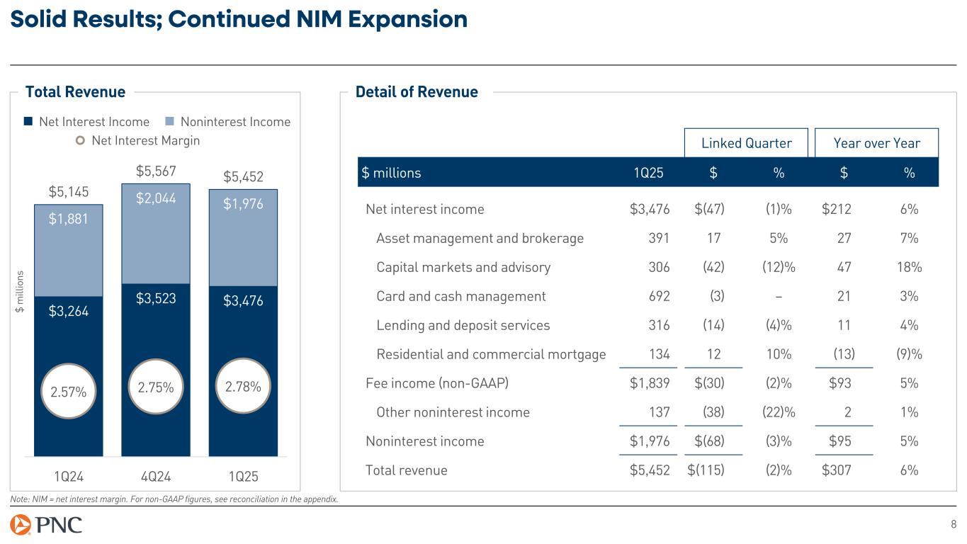 7 Strong Year over Year Performance Income Statement Summary Linked Quarter Year over Year $ millions except EPS 1Q25 $ % $ % Net interest income $3,476 $(47) (1)% $212 6% Fee income (non-GAAP) 1,839 (30) (2)% 93 5% Other noninterest income 137 (38) (22)% 2 1% Noninterest income $1,976 $(68) (3)% $95 5% Total revenue $5,452 $(115) (2)% $307 6% Noninterest expense 3,387 (119) (3)% 53 2% Pretax, pre-provision earnings (non-GAAP) $2,065 $4 – $254 14% Provision for credit losses 219 63 40% 64 41% Income taxes 347 69 25% 35 11% Net income $1,499 $(128) (8)% $155 12% Diluted EPS $3.51 $(0.26) (7)% $0.41 13% Key metrics 3/31/25 12/31/24 3/31/24 Noninterest income to total revenue 36% 37% 37% Net interest margin (non-GAAP) 2.78% 2.75% 2.57% Note: Net interest margin is calculated using taxable-equivalent net interest income, a non-GAAP measure. For non-GAAP figures, see reconciliation in the appendix.