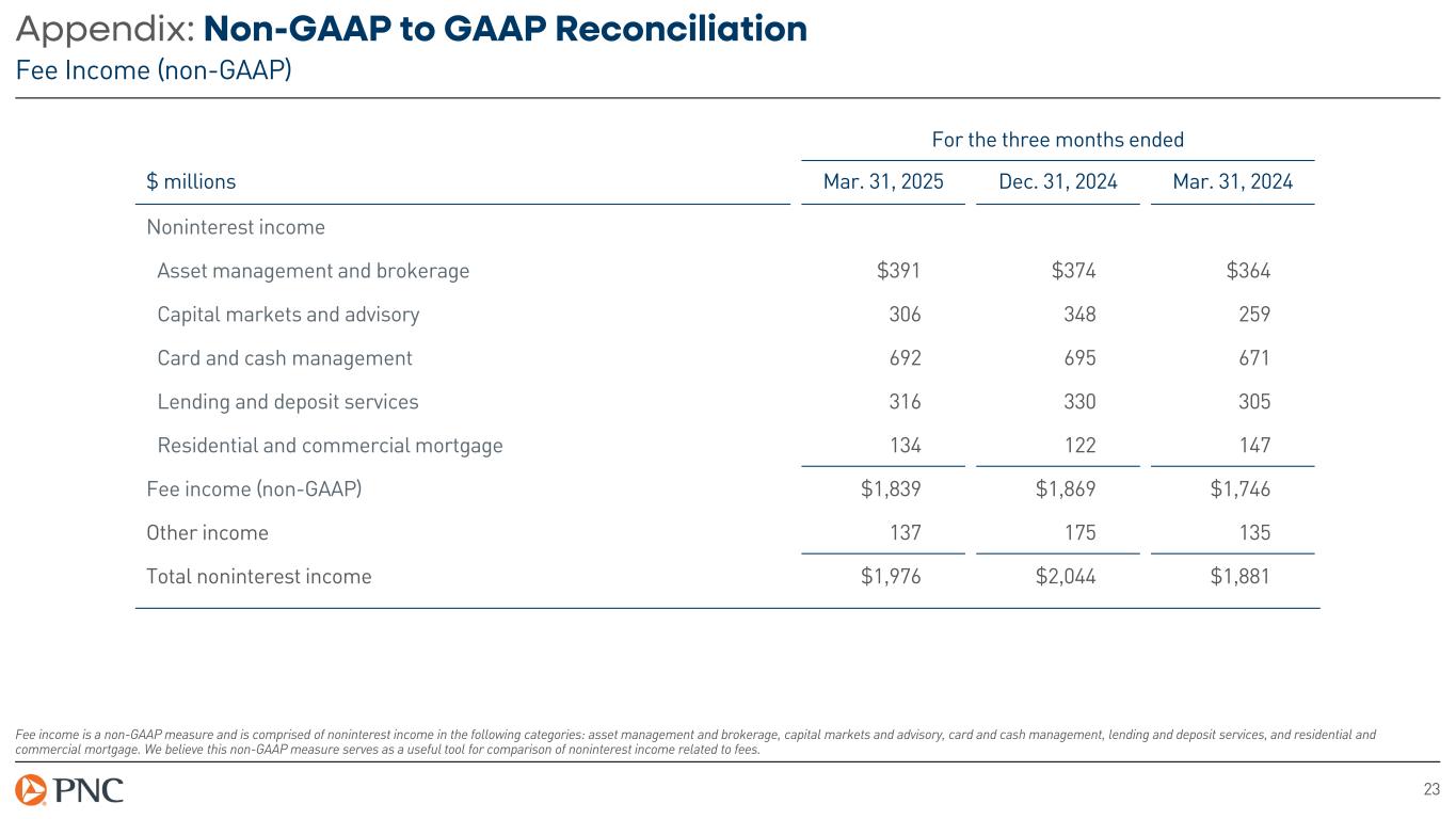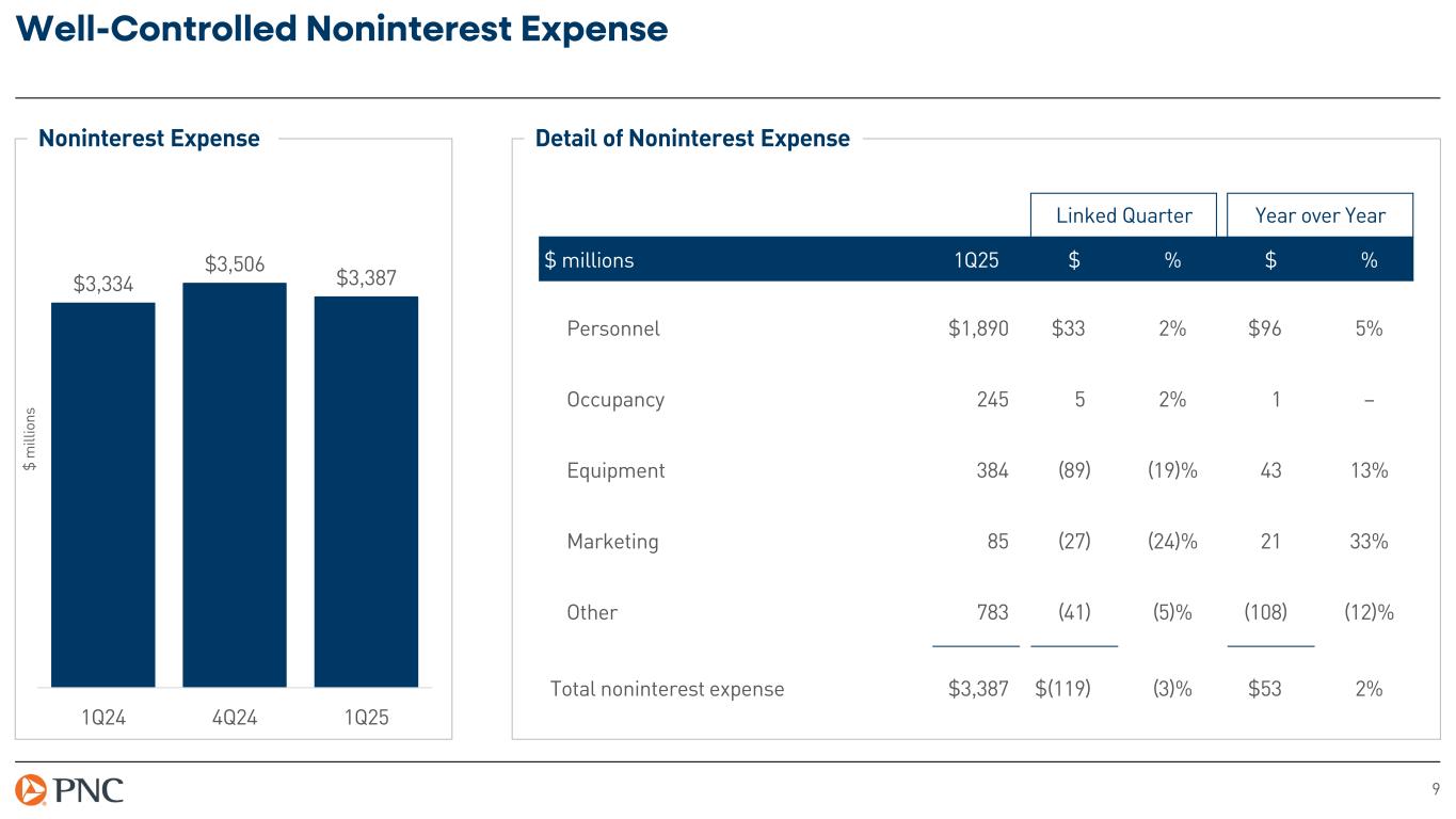 8 Solid Results; Continued NIM Expansion Note: NIM = net interest margin. For non-GAAP figures, see reconciliation in the appendix. Total Revenue $3,264 $3,523 $3,476 $1,881 $2,044 $1,976 $5,145 $5,567 $5,452 2.57% 2.75% 2.78% 1Q24 4Q24 1Q25 Linked Quarter Year over Year $ millions 1Q25 $ % $ % Net interest income $3,476 $(47) (1)% $212 6% Asset management and brokerage 391 17 5% 27 7% Capital markets and advisory 306 (42) (12)% 47 18% Card and cash management 692 (3) – 21 3% Lending and deposit services 316 (14) (4)% 11 4% Residential and commercial mortgage 134 12 10% (13) (9)% Fee income (non-GAAP) $1,839 $(30) (2)% $93 5% Other noninterest income 137 (38) (22)% 2 1% Noninterest income $1,976 $(68) (3)% $95 5% Total revenue $5,452 $(115) (2)% $307 6% Detail of Revenue Net Interest Income Noninterest Income Net Interest Margin $ m ill io ns