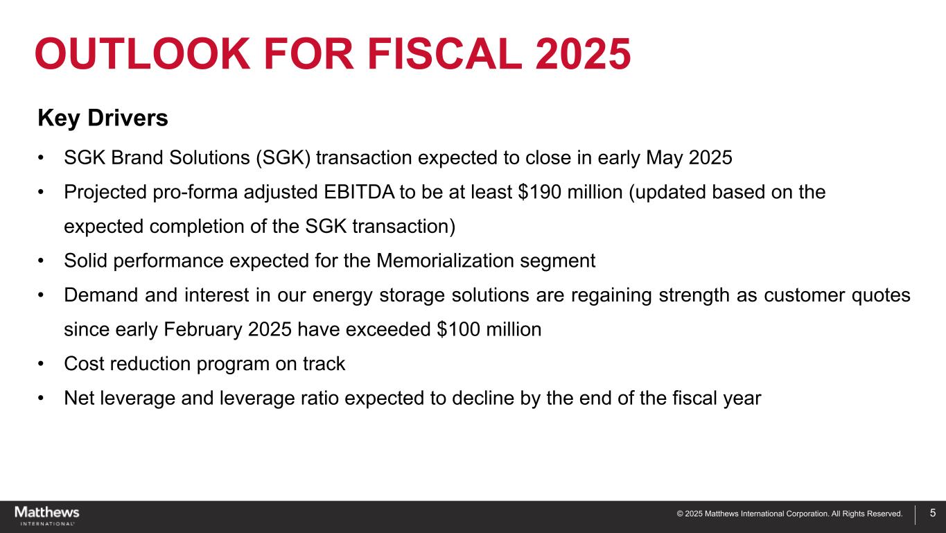「2024年11月、当社は2025年度の調整後EBITDAを少なくとも2億500万ドルと予想しており、これはSGKブランド・ソリューション部門を通期の連結業績に含めることを想定していました。2025年5月初旬のSGKとの取引完了に基づき、2025年度のプロフォーマ連結調整後EBITDA予想は少なくとも1億9,000万ドルに更新されました。この予測は、2025年度の残り5ヶ月間における新会社の40%持分のプロフォーマ予測を前提としています。この更新予想では、SGKとの取引によるプロフォーマ影響のみを修正し、通期では当初の2億500万ドルを維持しています。新会社の統合プロセスおよび独立した報告システムへの移行の結果、40%持分を1四半期遅れで報告する予定であることにご留意ください。その結果、実際に報告される調整後EBITDAは、この期間のプロフォーマ業績とは異なることになります。"