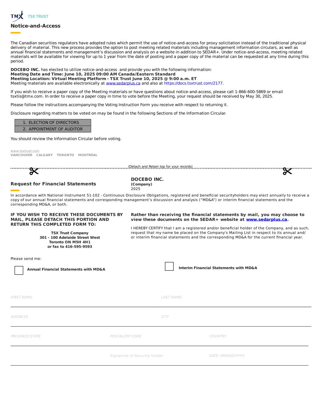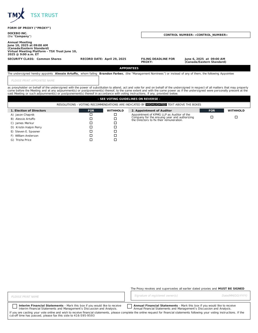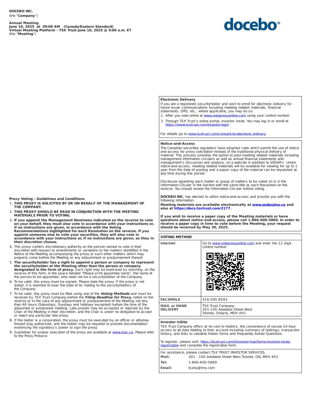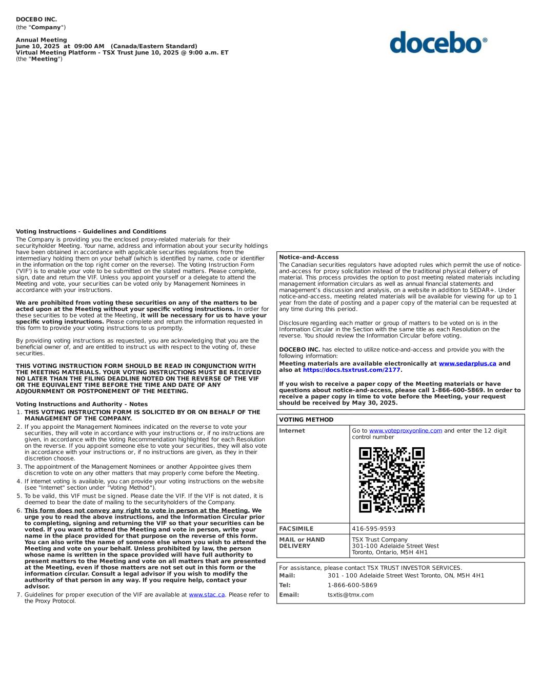 - 4 - Voting as a Registered Shareholder Registered holders of Shares (“Registered Holders”) on the record date may vote online at the Meeting at https://virtual-meetings.tsxtrust.com/en/1731. By clicking “I have a control number”, Registered Holders will be prompted to enter their twelve digit control number (which is located on their proxy form) and asked to enter the password, which is docebo2025 (case sensitive). They have to be connected to the internet at all times to be able to vote – it is the Shareholder’s responsibility to make sure they stay connected for the entire Meeting. Registered Shareholders on the Record Date who voted prior to the Meeting do not need to vote again during the Meeting. Alternatively, Registered Holders may give another person authority to represent them and vote their shares online at the Meeting, as described below under the heading “Appointment of Proxies”. Voting as a Beneficial Shareholder For Shareholders that own their Shares beneficially (“Beneficial Holders”) and whose Shares are registered in the name of an intermediary, which is usually a trust company, securities broker or other financial institution, their intermediary is entitled to vote the Shares held by it and beneficially owned by the Beneficial Holder on the record date. However, such intermediary must first seek the Beneficial Holder’s instructions as to how to vote their Shares. Beneficial Holders may also vote and ask questions directly, online at the Meeting, by duly appointing themselves as proxyholder as described under the heading “Appointment of Proxies”. Beneficial Holders that duly appoint themselves as proxyholder to vote and ask questions online at the Meeting are responsible for obtaining a control number as described under the heading “Appointment of Proxies”. Beneficial Holders must click on “I have a control number” and they will be prompted to enter their twelve digit control number (obtained from TSX Trust) and enter the password docebo2025 (case sensitive). Shareholders have to be connected to the internet at all times to be able to vote – it is the responsibility of the Shareholder to make sure they stay connected for the entire Meeting. Beneficial Holders who have not duly appointed themselves as proxyholder will not be able to vote or ask questions at the Meeting, however such Beneficial Holders may still attend the Meeting as guests through the live audio webcast at https://virtual-meetings.tsxtrust.com/en/1731. Asking Questions at the Meeting Registered Shareholders and Beneficial Holders who have appointed themselves as proxyholder and obtained a control number are eligible to ask questions at any time during the Meeting. While logged in for the Meeting, such Shareholders will be able to submit questions online by clicking on the “submit questions” button. Equipment Requirements / Login Instructions Please refer to Schedule B of this Information Circular for equipment requirements and login instructions for the Meeting. Notice and Access The Company is using Notice and Access for both Registered Holders and Beneficial Holders, which allows the Company to furnish proxy materials online to Shareholders instead of mailing paper copies of such materials. Using Notice and Access, the Company can deliver proxy-related materials by (i) posting the Information Circular (and other proxy related materials) on a website other than SEDAR+ and (ii) sending a notice informing Shareholders that the Information Circular and proxy related materials have been posted and explaining how to access such materials (the “N&A Notice”). On or before May 6, 2025, the Company will send to Shareholders of record as of the Record Date a notice package containing the N&A Notice and the relevant voting document (a form of proxy or voting instruction form, as applicable). The N&A Notice will contain basic information about the Meeting and the matters to be voted on, instructions on how to access the proxy materials, including this Information Circular and the Company’s 2024 audited