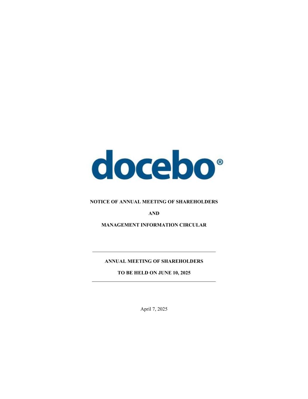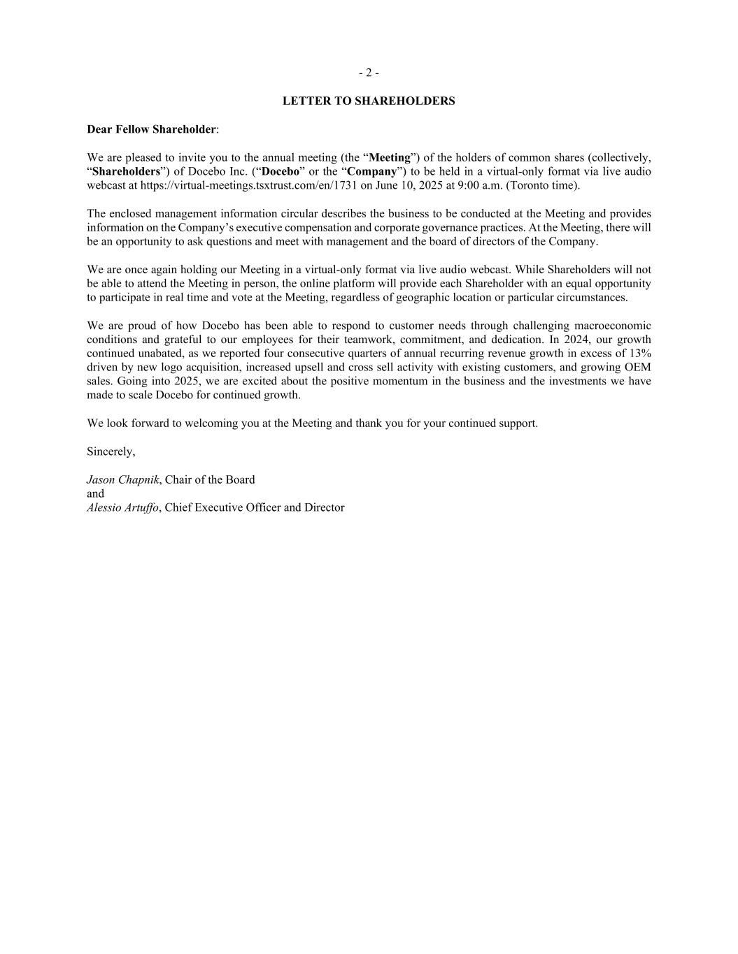 - 2 - LETTER TO SHAREHOLDERS Dear Fellow Shareholder: We are pleased to invite you to the annual meeting (the “Meeting”) of the holders of common shares (collectively, “Shareholders”) of Docebo Inc. (“Docebo” or the “Company”) to be held in a virtual-only format via live audio webcast at https://virtual-meetings.tsxtrust.com/en/1731 on June 10, 2025 at 9:00 a.m. (Toronto time). The enclosed management information circular describes the business to be conducted at the Meeting and provides information on the Company’s executive compensation and corporate governance practices. At the Meeting, there will be an opportunity to ask questions and meet with management and the board of directors of the Company. We are once again holding our Meeting in a virtual-only format via live audio webcast. While Shareholders will not be able to attend the Meeting in person, the online platform will provide each Shareholder with an equal opportunity to participate in real time and vote at the Meeting, regardless of geographic location or particular circumstances. We are proud of how Docebo has been able to respond to customer needs through challenging macroeconomic conditions and grateful to our employees for their teamwork, commitment, and dedication. In 2024, our growth continued unabated, as we reported four consecutive quarters of annual recurring revenue growth in excess of 13% driven by new logo acquisition, increased upsell and cross sell activity with existing customers, and growing OEM sales. Going into 2025, we are excited about the positive momentum in the business and the investments we have made to scale Docebo for continued growth. We look forward to welcoming you at the Meeting and thank you for your continued support. Sincerely, Jason Chapnik, Chair of the Board and Alessio Artuffo, Chief Executive Officer and Director