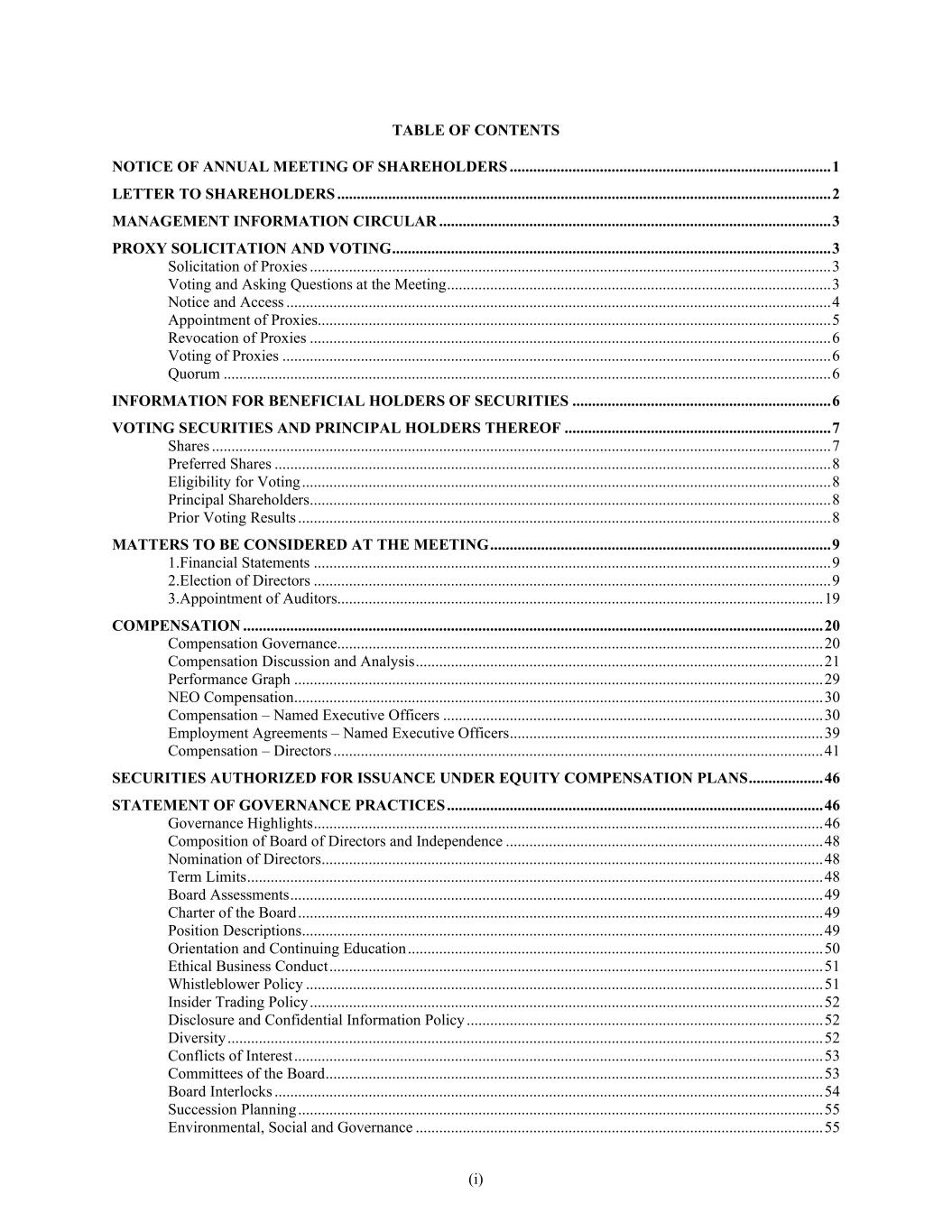 (i) TABLE OF CONTENTS NOTICE OF ANNUAL MEETING OF SHAREHOLDERS .................................................................................. 1 LETTER TO SHAREHOLDERS .............................................................................................................................. 2 MANAGEMENT INFORMATION CIRCULAR .................................................................................................... 3 PROXY SOLICITATION AND VOTING ................................................................................................................ 3 Solicitation of Proxies ..................................................................................................................................... 3 Voting and Asking Questions at the Meeting .................................................................................................. 3 Notice and Access ........................................................................................................................................... 4 Appointment of Proxies................................................................................................................................... 5 Revocation of Proxies ..................................................................................................................................... 6 Voting of Proxies ............................................................................................................................................ 6 Quorum ........................................................................................................................................................... 6 INFORMATION FOR BENEFICIAL HOLDERS OF SECURITIES .................................................................. 6 VOTING SECURITIES AND PRINCIPAL HOLDERS THEREOF .................................................................... 7 Shares .............................................................................................................................................................. 7 Preferred Shares .............................................................................................................................................. 8 Eligibility for Voting ....................................................................................................................................... 8 Principal Shareholders ..................................................................................................................................... 8 Prior Voting Results ........................................................................................................................................ 8 MATTERS TO BE CONSIDERED AT THE MEETING ....................................................................................... 9 1.Financial Statements .................................................................................................................................... 9 2.Election of Directors .................................................................................................................................... 9 3.Appointment of Auditors............................................................................................................................ 19 COMPENSATION .................................................................................................................................................... 20 Compensation Governance ............................................................................................................................ 20 Compensation Discussion and Analysis ........................................................................................................ 21 Performance Graph ....................................................................................................................................... 29 NEO Compensation ....................................................................................................................................... 30 Compensation – Named Executive Officers ................................................................................................. 30 Employment Agreements – Named Executive Officers ................................................................................ 39 Compensation – Directors ............................................................................................................................. 41 SECURITIES AUTHORIZED FOR ISSUANCE UNDER EQUITY COMPENSATION PLANS ................... 46 STATEMENT OF GOVERNANCE PRACTICES ................................................................................................ 46 Governance Highlights .................................................................................................................................. 46 Composition of Board of Directors and Independence ................................................................................. 48 Nomination of Directors ................................................................................................................................ 48 Term Limits ................................................................................................................................................... 48 Board Assessments ........................................................................................................................................ 49 Charter of the Board ...................................................................................................................................... 49 Position Descriptions ..................................................................................................................................... 49 Orientation and Continuing Education .......................................................................................................... 50 Et