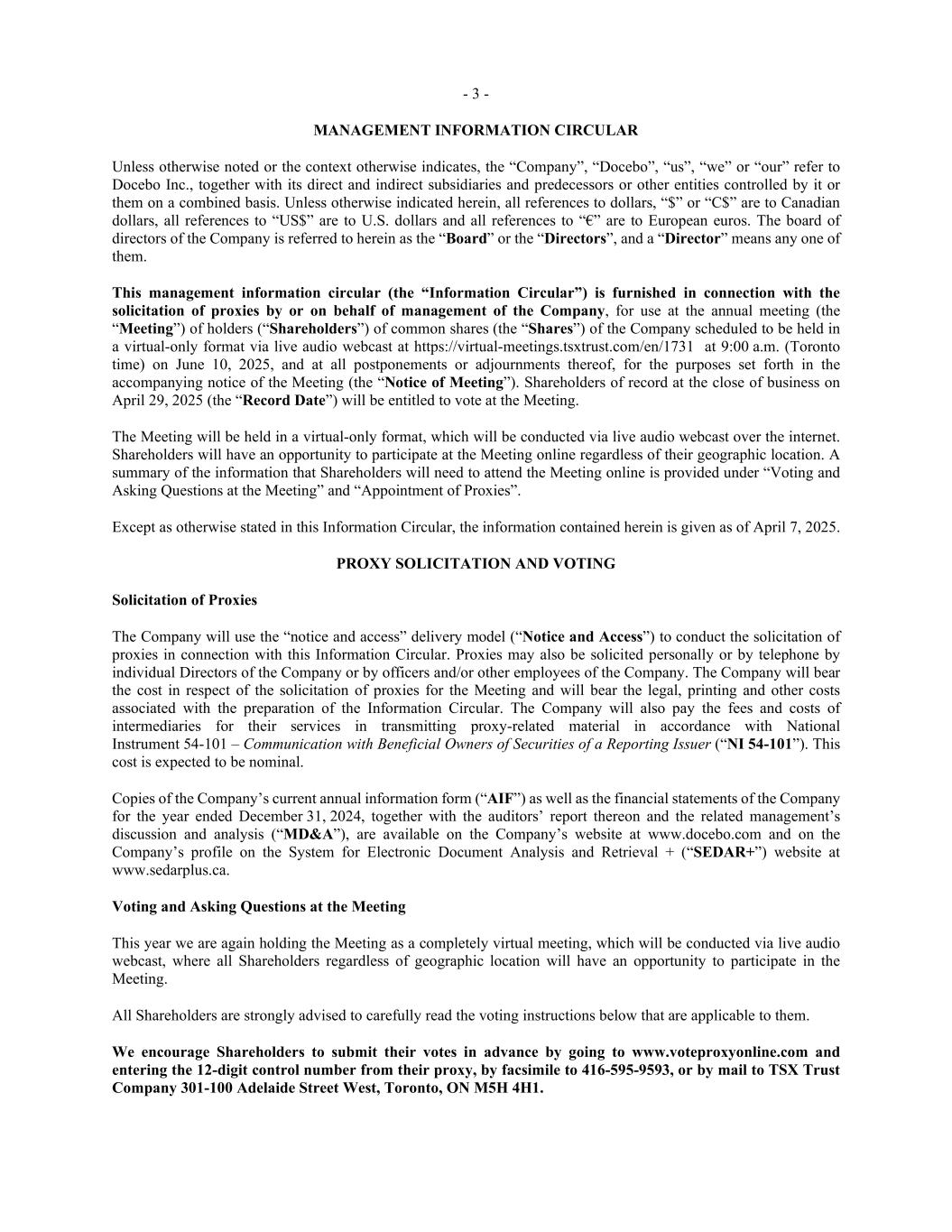 - 3 - MANAGEMENT INFORMATION CIRCULAR Unless otherwise noted or the context otherwise indicates, the “Company”, “Docebo”, “us”, “we” or “our” refer to Docebo Inc., together with its direct and indirect subsidiaries and predecessors or other entities controlled by it or them on a combined basis. Unless otherwise indicated herein, all references to dollars, “$” or “C$” are to Canadian dollars, all references to “US$” are to U.S. dollars and all references to “€” are to European euros. The board of directors of the Company is referred to herein as the “Board” or the “Directors”, and a “Director” means any one of them. This management information circular (the “Information Circular”) is furnished in connection with the solicitation of proxies by or on behalf of management of the Company, for use at the annual meeting (the “Meeting”) of holders (“Shareholders”) of common shares (the “Shares”) of the Company scheduled to be held in a virtual-only format via live audio webcast at https://virtual-meetings.tsxtrust.com/en/1731 at 9:00 a.m. (Toronto time) on June 10, 2025, and at all postponements or adjournments thereof, for the purposes set forth in the accompanying notice of the Meeting (the “Notice of Meeting”). Shareholders of record at the close of business on April 29, 2025 (the “Record Date”) will be entitled to vote at the Meeting. The Meeting will be held in a virtual-only format, which will be conducted via live audio webcast over the internet. Shareholders will have an opportunity to participate at the Meeting online regardless of their geographic location. A summary of the information that Shareholders will need to attend the Meeting online is provided under “Voting and Asking Questions at the Meeting” and “Appointment of Proxies”. Except as otherwise stated in this Information Circular, the information contained herein is given as of April 7, 2025. PROXY SOLICITATION AND VOTING Solicitation of Proxies The Company will use the “notice and access” delivery model (“Notice and Access”) to conduct the solicitation of proxies in connection with this Information Circular. Proxies may also be solicited personally or by telephone by individual Directors of the Company or by officers and/or other employees of the Company. The Company will bear the cost in respect of the solicitation of proxies for the Meeting and will bear the legal, printing and other costs associated with the preparation of the Information Circular. The Company will also pay the fees and costs of intermediaries for their services in transmitting proxy-related material in accordance with National Instrument 54-101 – Communication with Beneficial Owners of Securities of a Reporting Issuer (“NI 54-101”). This cost is expected to be nominal. Copies of the Company’s current annual information form (“AIF”) as well as the financial statements of the Company for the year ended December 31, 2024, together with the auditors’ report thereon and the related management’s discussion and analysis (“MD&A”), are available on the Company’s website at www.docebo.com and on the Company’s profile on the System for Electronic Document Analysis and Retrieval + (“SEDAR+”) website at www.sedarplus.ca. Voting and Asking Questions at the Meeting This year we are again holding the Meeting as a completely virtual meeting, which will be conducted via live audio webcast, where all Shareholders regardless of geographic location will have an opportunity to participate in the Meeting. All Shareholders are strongly advised to carefully read the voting instructions below that are applicable to them. We encourage Shareholders to submit their votes in advance by going to www.voteproxyonline.com and entering the 12-digit control number from their proxy, by facsimile to 416-595-9593, or by mail to TSX Trust Company 301-100 Adelaide Street West, Toronto, ON M5H 4H1.