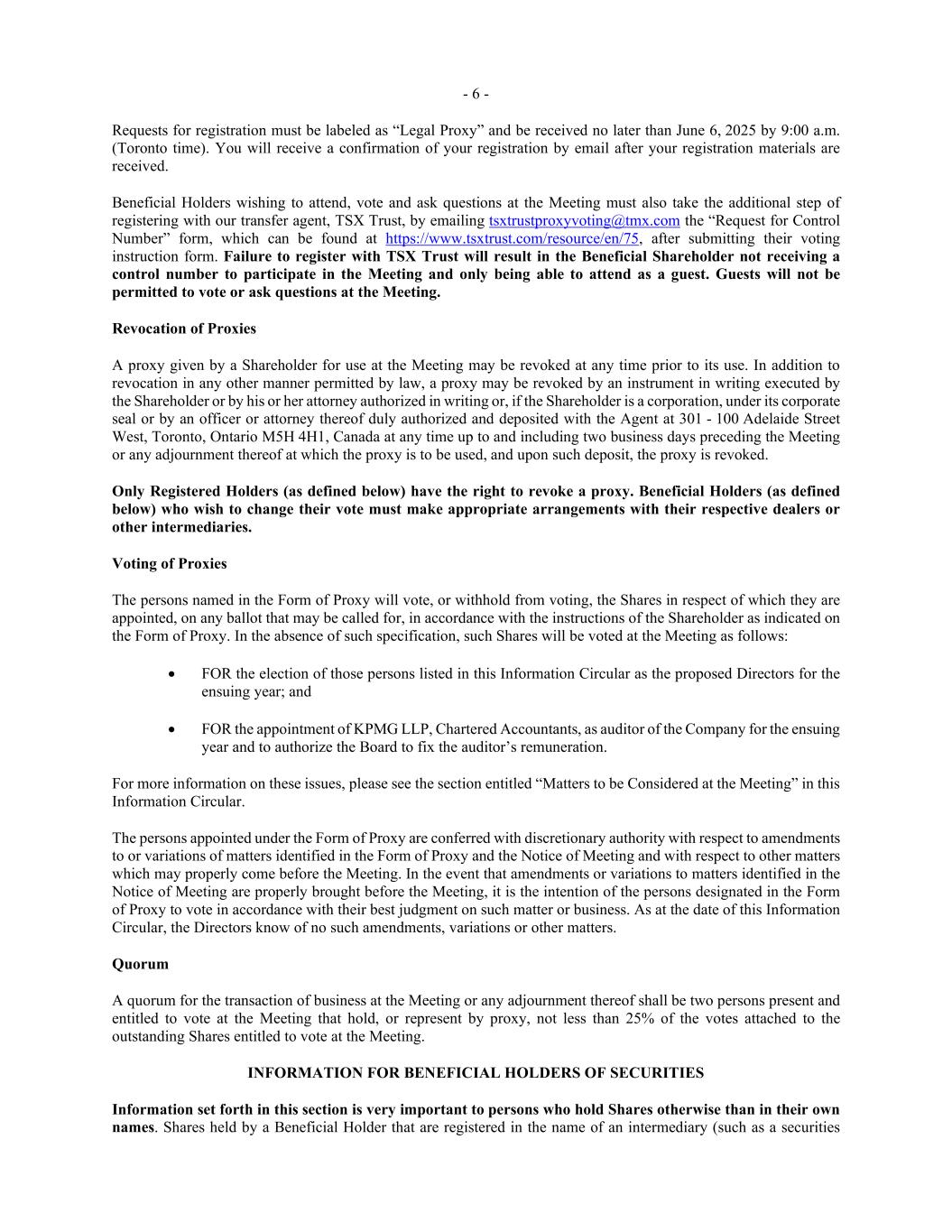 - 6 - Requests for registration must be labeled as “Legal Proxy” and be received no later than June 6, 2025 by 9:00 a.m. (Toronto time). You will receive a confirmation of your registration by email after your registration materials are received. Beneficial Holders wishing to attend, vote and ask questions at the Meeting must also take the additional step of registering with our transfer agent, TSX Trust, by emailing tsxtrustproxyvoting@tmx.com the “Request for Control Number” form, which can be found at https://www.tsxtrust.com/resource/en/75, after submitting their voting instruction form. Failure to register with TSX Trust will result in the Beneficial Shareholder not receiving a control number to participate in the Meeting and only being able to attend as a guest. Guests will not be permitted to vote or ask questions at the Meeting. Revocation of Proxies A proxy given by a Shareholder for use at the Meeting may be revoked at any time prior to its use. In addition to revocation in any other manner permitted by law, a proxy may be revoked by an instrument in writing executed by the Shareholder or by his or her attorney authorized in writing or, if the Shareholder is a corporation, under its corporate seal or by an officer or attorney thereof duly authorized and deposited with the Agent at 301 - 100 Adelaide Street West, Toronto, Ontario M5H 4H1, Canada at any time up to and including two business days preceding the Meeting or any adjournment thereof at which the proxy is to be used, and upon such deposit, the proxy is revoked. Only Registered Holders (as defined below) have the right to revoke a proxy. Beneficial Holders (as defined below) who wish to change their vote must make appropriate arrangements with their respective dealers or other intermediaries. Voting of Proxies The persons named in the Form of Proxy will vote, or withhold from voting, the Shares in respect of which they are appointed, on any ballot that may be called for, in accordance with the instructions of the Shareholder as indicated on the Form of Proxy. In the absence of such specification, such Shares will be voted at the Meeting as follows: • FOR the election of those persons listed in this Information Circular as the proposed Directors for the ensuing year; and • FOR the appointment of KPMG LLP, Chartered Accountants, as auditor of the Company for the ensuing year and to authorize the Board to fix the auditor’s remuneration. For more information on these issues, please see the section entitled “Matters to be Considered at the Meeting” in this Information Circular. The persons appointed under the Form of Proxy are conferred with discretionary authority with respect to amendments to or variations of matters identified in the Form of Proxy and the Notice of Meeting and with respect to other matters which may properly come before the Meeting. In the event that amendments or variations to matters identified in the Notice of Meeting are properly brought before the Meeting, it is the intention of the persons designated in the Form of Proxy to vote in accordance with their best judgment on such matter or business. As at the date of this Information Circular, the Directors know of no such amendments, variations or other matters. Quorum A quorum for the transaction of business at the Meeting or any adjournment thereof shall be two persons present and entitled to vote at the Meeting that hold, or represent by proxy, not less than 25% of the votes attached to the outstanding Shares entitled to vote at the Meeting. INFORMATION FOR BENEFICIAL HOLDERS OF SECURITIES Information set forth in this section is very important to persons who hold Shares otherwise than in their own names. Shares held by a Beneficial Holder that are registered in the name of an intermediary (such as a securities