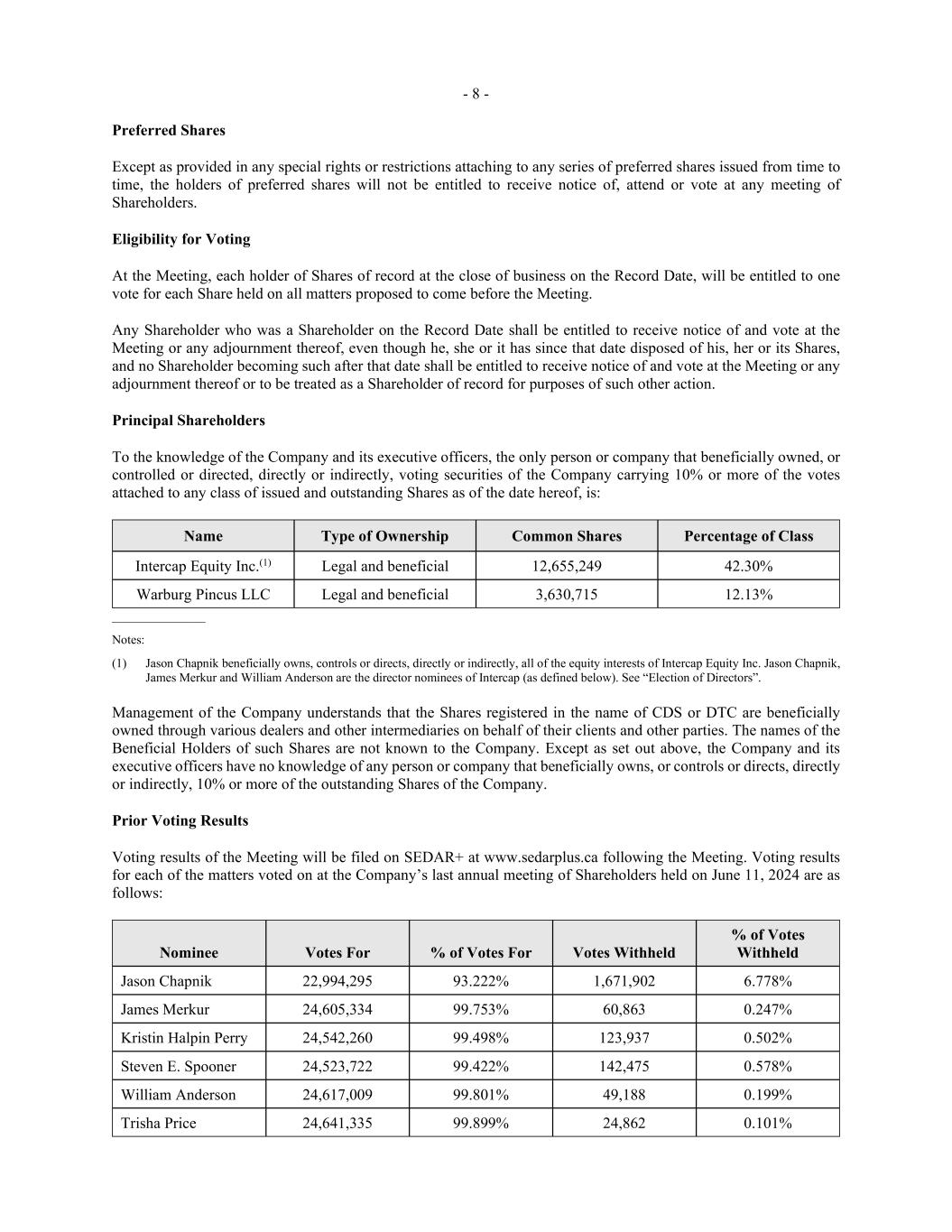 - 8 - Preferred Shares Except as provided in any special rights or restrictions attaching to any series of preferred shares issued from time to time, the holders of preferred shares will not be entitled to receive notice of, attend or vote at any meeting of Shareholders. Eligibility for Voting At the Meeting, each holder of Shares of record at the close of business on the Record Date, will be entitled to one vote for each Share held on all matters proposed to come before the Meeting. Any Shareholder who was a Shareholder on the Record Date shall be entitled to receive notice of and vote at the Meeting or any adjournment thereof, even though he, she or it has since that date disposed of his, her or its Shares, and no Shareholder becoming such after that date shall be entitled to receive notice of and vote at the Meeting or any adjournment thereof or to be treated as a Shareholder of record for purposes of such other action. Principal Shareholders To the knowledge of the Company and its executive officers, the only person or company that beneficially owned, or controlled or directed, directly or indirectly, voting securities of the Company carrying 10% or more of the votes attached to any class of issued and outstanding Shares as of the date hereof, is: Name Type of Ownership Common Shares Percentage of Class Intercap Equity Inc.(1) Legal and beneficial 12,655,249 42.30% Warburg Pincus LLC Legal and beneficial 3,630,715 12.13% _______________ Notes: (1) Jason Chapnik beneficially owns, controls or directs, directly or indirectly, all of the equity interests of Intercap Equity Inc. Jason Chapnik, James Merkur and William Anderson are the director nominees of Intercap (as defined below). See “Election of Directors”. Management of the Company understands that the Shares registered in the name of CDS or DTC are beneficially owned through various dealers and other intermediaries on behalf of their clients and other parties. The names of the Beneficial Holders of such Shares are not known to the Company. Except as set out above, the Company and its executive officers have no knowledge of any person or company that beneficially owns, or controls or directs, directly or indirectly, 10% or more of the outstanding Shares of the Company. Prior Voting Results Voting results of the Meeting will be filed on SEDAR+ at www.sedarplus.ca following the Meeting. Voting results for each of the matters voted on at the Company’s last annual meeting of Shareholders held on June 11, 2024 are as follows: Nominee Votes For % of Votes For Votes Withheld % of Votes Withheld Jason Chapnik 22,994,295 93.222% 1,671,902 6.778% James Merkur 24,605,334 99.753% 60,863 0.247% Kristin Halpin Perry 24,542,260 99.498% 123,937 0.502% Steven E. Spooner 24,523,722 99.422% 142,475 0.578% William Anderson 24,617,009 99.801% 49,188 0.199% Trisha Price 24,641,335 99.899% 24,862 0.101%