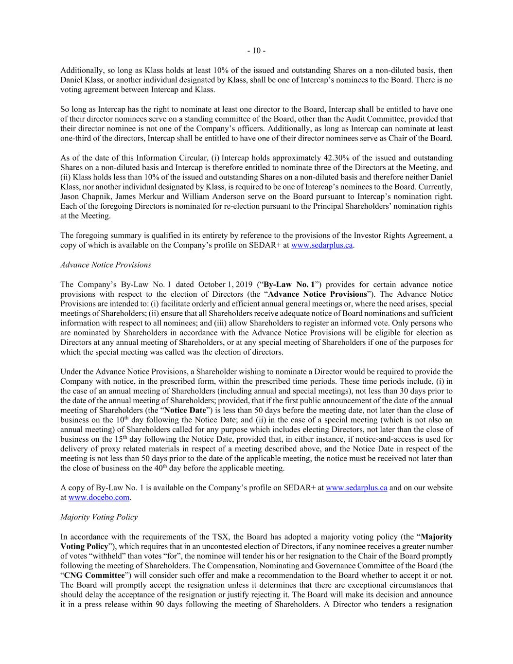 - 10 - Additionally, so long as Klass holds at least 10% of the issued and outstanding Shares on a non-diluted basis, then Daniel Klass, or another individual designated by Klass, shall be one of Intercap’s nominees to the Board. There is no voting agreement between Intercap and Klass. So long as Intercap has the right to nominate at least one director to the Board, Intercap shall be entitled to have one of their director nominees serve on a standing committee of the Board, other than the Audit Committee, provided that their director nominee is not one of the Company’s officers. Additionally, as long as Intercap can nominate at least one-third of the directors, Intercap shall be entitled to have one of their director nominees serve as Chair of the Board. As of the date of this Information Circular, (i) Intercap holds approximately 42.30% of the issued and outstanding Shares on a non-diluted basis and Intercap is therefore entitled to nominate three of the Directors at the Meeting, and (ii) Klass holds less than 10% of the issued and outstanding Shares on a non-diluted basis and therefore neither Daniel Klass, nor another individual designated by Klass, is required to be one of Intercap’s nominees to the Board. Currently, Jason Chapnik, James Merkur and William Anderson serve on the Board pursuant to Intercap’s nomination right. Each of the foregoing Directors is nominated for re-election pursuant to the Principal Shareholders’ nomination rights at the Meeting. The foregoing summary is qualified in its entirety by reference to the provisions of the Investor Rights Agreement, a copy of which is available on the Company’s profile on SEDAR+ at www.sedarplus.ca. Advance Notice Provisions The Company’s By-Law No. 1 dated October 1, 2019 (“By-Law No. 1”) provides for certain advance notice provisions with respect to the election of Directors (the “Advance Notice Provisions”). The Advance Notice Provisions are intended to: (i) facilitate orderly and efficient annual general meetings or, where the need arises, special meetings of Shareholders; (ii) ensure that all Shareholders receive adequate notice of Board nominations and sufficient information with respect to all nominees; and (iii) allow Shareholders to register an informed vote. Only persons who are nominated by Shareholders in accordance with the Advance Notice Provisions will be eligible for election as Directors at any annual meeting of Shareholders, or at any special meeting of Shareholders if one of the purposes for which the special meeting was called was the election of directors. Under the Advance Notice Provisions, a Shareholder wishing to nominate a Director would be required to provide the Company with notice, in the prescribed form, within the prescribed time periods. These time periods include, (i) in the case of an annual meeting of Shareholders (including annual and special meetings), not less than 30 days prior to the date of the annual meeting of Shareholders; provided, that if the first public announcement of the date of the annual meeting of Shareholders (the “Notice Date”) is less than 50 days before the meeting date, not later than the close of business on the 10th day following the Notice Date; and (ii) in the case of a special meeting (which is not also an annual meeting) of Shareholders called for any purpose which includes electing Directors, not later than the close of business on the 15th day following the Notice Date, provided that, in either instance, if notice-and-access is used for delivery of proxy related materials in respect of a meeting described above, and the Notice Date in respect of the meeting is not less than 50 days prior to the date of the applicable meeting, the notice must be received not later than the close of business on the 40th day before the applicable meeting. A copy of By-Law No. 1 is available on the Company’s profile on SEDAR+ at www.sedarplus.ca and on our website at www.docebo.com. Majority Voting Policy In accordance with the requirements of the TSX, the Board has adopted a majority voting policy (the “Majority Voting Policy”), which requires that in an uncontested election of Directors, if any nominee receives a greater number of votes “withheld” than votes “for”, the nominee will tender his or her resignation to the Chair of the Board promptly following the meeting of Shareholders. The Compensation, Nominating and Governance Committee of the Board (the “CNG Committee”) will consider such offer and make a recommendation to the Board whether to accept it or not. The Board will promptly accept the resignation unless it determines that there are exceptional circumstances that should delay the acceptance of the resignation or justify rejecting it. The Board will make its decision and announce it in a press release within 90 days following the meeting of Shareholders. A Director who tenders a resignation