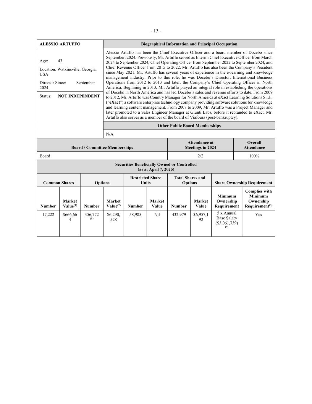 - 13 - ALESSIO ARTUFFO Biographical Information and Principal Occupation Alessio Artuffo has been the Chief Executive Officer and a board member of Docebo since September, 2024. Previously, Mr. Artuffo served as Interim Chief Executive Officer from March 2024 to September 2024, Chief Operating Officer from September 2022 to September 2024, and Chief Revenue Officer from 2015 to 2022. Mr. Artuffo has also been the Company’s President since May 2021. Mr. Artuffo has several years of experience in the e-learning and knowledge management industry. Prior to this role, he was Docebo’s Director, International Business Operations from 2012 to 2013 and later, the Company’s Chief Operating Officer in North America. Beginning in 2013, Mr. Artuffo played an integral role in establishing the operations of Docebo in North America and has led Docebo’s sales and revenue efforts to date. From 2009 to 2012, Mr. Artuffo was Country Manager for North America at eXact Learning Solutions S.r.l., (“eXact”) a software enterprise technology company providing software solutions for knowledge and learning content management. From 2007 to 2009, Mr. Artuffo was a Project Manager and later promoted to a Sales Engineer Manager at Giunti Labs, before it rebranded to eXact. Mr. Artuffo also serves as a member of the board of Viafoura (post-bankruptcy). Age: 43 Location: Watkinsville, Georgia, USA Director Since: September 2024 Status: NOT INDEPENDENT Other Public Board Memberships N/A Board / Committee Memberships Attendance at Meetings in 2024 Overall Attendance Board 2/2 100% Securities Beneficially Owned or Controlled (as at April 7, 2025) Common Shares Options Restricted Share Units Total Shares and Options Share Ownership Requirement Number Market Value(1) Number Market Value(7) Number Market Value Number Market Value Minimum Ownership Requirement Complies with Minimum Ownership Requirement(3) 17,222 $666,66 4 356,772 (8) $6,290, 528 58,985 Nil 432,979 $6,957,1 92 5 x Annual Base Salary ($3,061,739) (9) Yes
