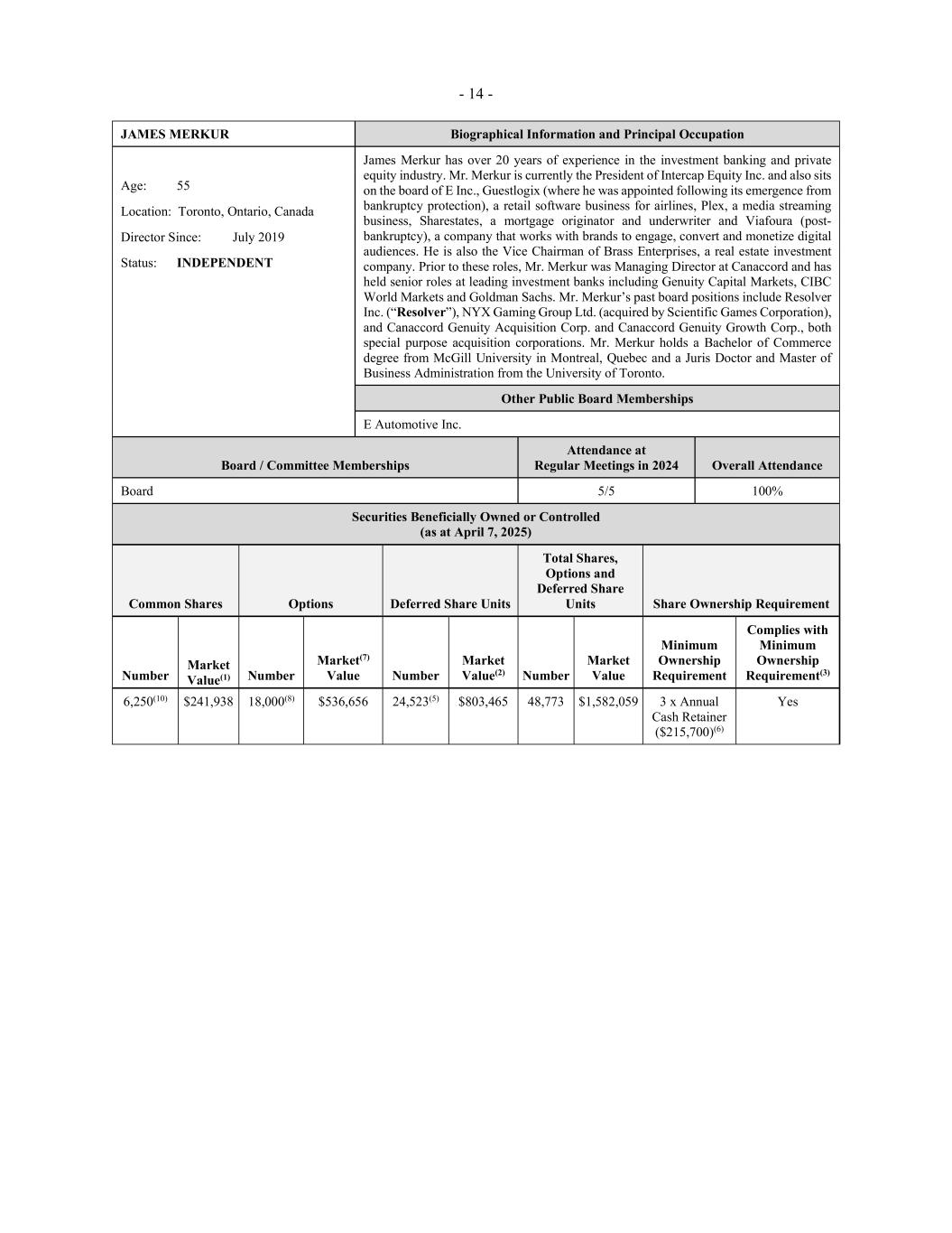 - 14 - JAMES MERKUR Biographical Information and Principal Occupation James Merkur has over 20 years of experience in the investment banking and private equity industry. Mr. Merkur is currently the President of Intercap Equity Inc. and also sits on the board of E Inc., Guestlogix (where he was appointed following its emergence from bankruptcy protection), a retail software business for airlines, Plex, a media streaming business, Sharestates, a mortgage originator and underwriter and Viafoura (post- bankruptcy), a company that works with brands to engage, convert and monetize digital audiences. He is also the Vice Chairman of Brass Enterprises, a real estate investment company. Prior to these roles, Mr. Merkur was Managing Director at Canaccord and has held senior roles at leading investment banks including Genuity Capital Markets, CIBC World Markets and Goldman Sachs. Mr. Merkur’s past board positions include Resolver Inc. (“Resolver”), NYX Gaming Group Ltd. (acquired by Scientific Games Corporation), and Canaccord Genuity Acquisition Corp. and Canaccord Genuity Growth Corp., both special purpose acquisition corporations. Mr. Merkur holds a Bachelor of Commerce degree from McGill University in Montreal, Quebec and a Juris Doctor and Master of Business Administration from the University of Toronto. Age: 55 Location: Toronto, Ontario, Canada Director Since: July 2019 Status: INDEPENDENT Other Public Board Memberships E Automotive Inc. Board / Committee Memberships Attendance at Regular Meetings in 2024 Overall Attendance Board 5/5 100% Securities Beneficially Owned or Controlled (as at April 7, 2025) Common Shares Options Deferred Share Units Total Shares, Options and Deferred Share Units Share Ownership Requirement Number Market Value(1) Number Market(7) Value Number Market Value(2) Number Market Value Minimum Ownership Requirement Complies with Minimum Ownership Requirement(3) 6,250(10) $241,938 18,000(8) $536,656 24,523(5) $803,465 48,773 $1,582,059 3 x Annual Cash Retainer ($215,700)(6) Yes