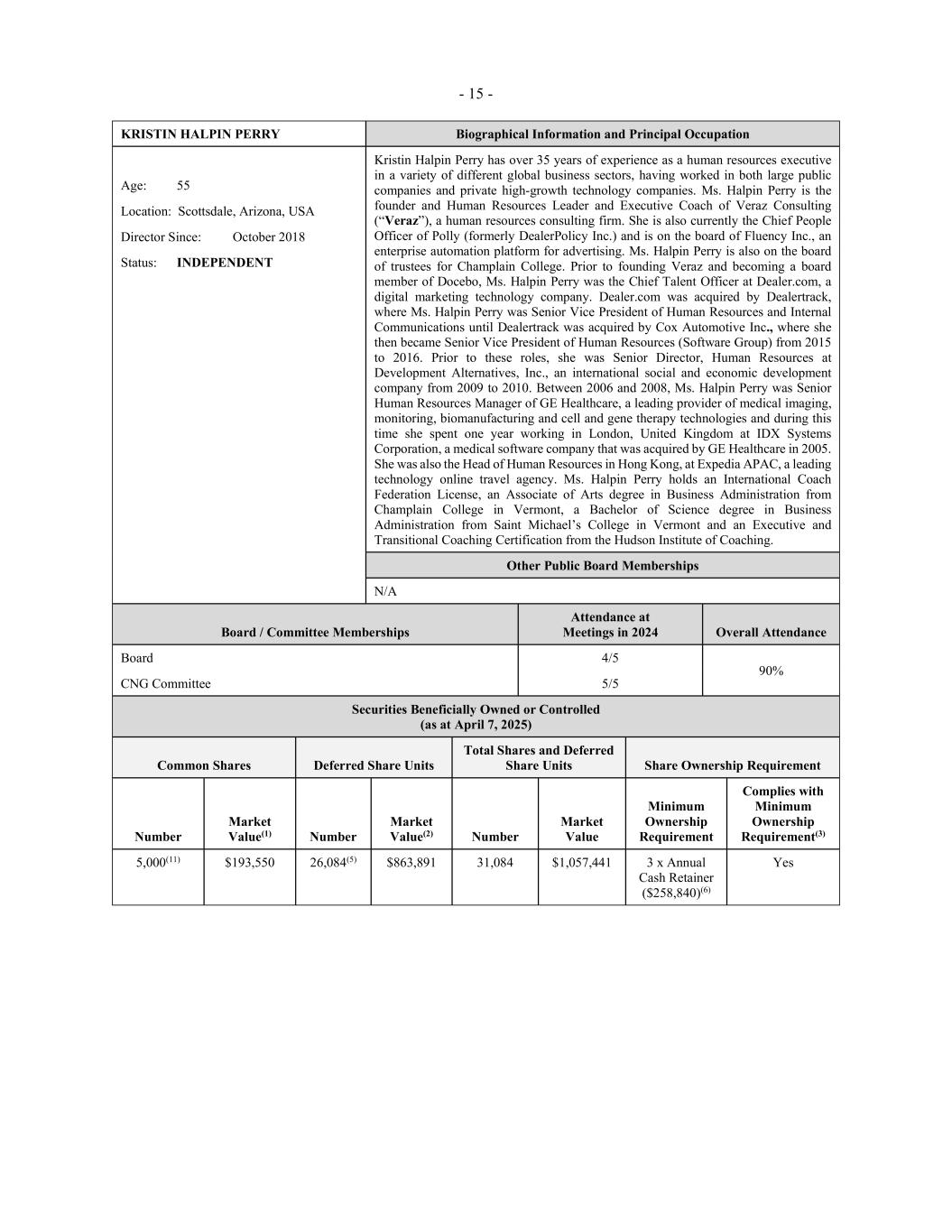 - 15 - KRISTIN HALPIN PERRY Biographical Information and Principal Occupation Kristin Halpin Perry has over 35 years of experience as a human resources executive in a variety of different global business sectors, having worked in both large public companies and private high-growth technology companies. Ms. Halpin Perry is the founder and Human Resources Leader and Executive Coach of Veraz Consulting (“Veraz”), a human resources consulting firm. She is also currently the Chief People Officer of Polly (formerly DealerPolicy Inc.) and is on the board of Fluency Inc., an enterprise automation platform for advertising. Ms. Halpin Perry is also on the board of trustees for Champlain College. Prior to founding Veraz and becoming a board member of Docebo, Ms. Halpin Perry was the Chief Talent Officer at Dealer.com, a digital marketing technology company. Dealer.com was acquired by Dealertrack, where Ms. Halpin Perry was Senior Vice President of Human Resources and Internal Communications until Dealertrack was acquired by Cox Automotive Inc., where she then became Senior Vice President of Human Resources (Software Group) from 2015 to 2016. Prior to these roles, she was Senior Director, Human Resources at Development Alternatives, Inc., an international social and economic development company from 2009 to 2010. Between 2006 and 2008, Ms. Halpin Perry was Senior Human Resources Manager of GE Healthcare, a leading provider of medical imaging, monitoring, biomanufacturing and cell and gene therapy technologies and during this time she spent one year working in London, United Kingdom at IDX Systems Corporation, a medical software company that was acquired by GE Healthcare in 2005. She was also the Head of Human Resources in Hong Kong, at Expedia APAC, a leading technology online travel agency. Ms. Halpin Perry holds an International Coach Federation License, an Associate of Arts degree in Business Administration from Champlain College in Vermont, a Bachelor of Science degree in Business Administration from Saint Michael’s College in Vermont and an Executive and Transitional Coaching Certification from the Hudson Institute of Coaching. Age: 55 Location: Scottsdale, Arizona, USA Director Since: October 2018 Status: INDEPENDENT Other Public Board Memberships N/A Board / Committee Memberships Attendance at Meetings in 2024 Overall Attendance Board 4/5 90% CNG Committee 5/5 Securities Beneficially Owned or Controlled (as at April 7, 2025) Common Shares Deferred Share Units Total Shares and Deferred Share Units Share Ownership Requirement Number Market Value(1) Number Market Value(2) Number Market Value Minimum Ownership Requirement Complies with Minimum Ownership Requirement(3) 5,000(11) $193,550 26,084(5) $863,891 31,084 $1,057,441 3 x Annual Cash Retainer ($258,840)(6) Yes
