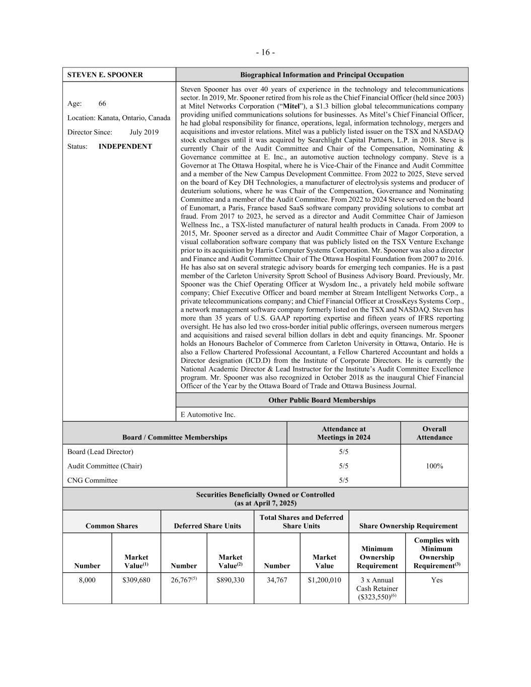 - 16 - STEVEN E. SPOONER Biographical Information and Principal Occupation Steven Spooner has over 40 years of experience in the technology and telecommunications sector. In 2019, Mr. Spooner retired from his role as the Chief Financial Officer (held since 2003) at Mitel Networks Corporation (“Mitel”), a $1.3 billion global telecommunications company providing unified communications solutions for businesses. As Mitel’s Chief Financial Officer, he had global responsibility for finance, operations, legal, information technology, mergers and acquisitions and investor relations. Mitel was a publicly listed issuer on the TSX and NASDAQ stock exchanges until it was acquired by Searchlight Capital Partners, L.P. in 2018. Steve is currently Chair of the Audit Committee and Chair of the Compensation, Nominating & Governance committee at E. Inc., an automotive auction technology company. Steve is a Governor at The Ottawa Hospital, where he is Vice-Chair of the Finance and Audit Committee and a member of the New Campus Development Committee. From 2022 to 2025, Steve served on the board of Key DH Technologies, a manufacturer of electrolysis systems and producer of deuterium solutions, where he was Chair of the Compensation, Governance and Nominating Committee and a member of the Audit Committee. From 2022 to 2024 Steve served on the board of Eunomart, a Paris, France based SaaS software company providing solutions to combat art fraud. From 2017 to 2023, he served as a director and Audit Committee Chair of Jamieson Wellness Inc., a TSX-listed manufacturer of natural health products in Canada. From 2009 to 2015, Mr. Spooner served as a director and Audit Committee Chair of Magor Corporation, a visual collaboration software company that was publicly listed on the TSX Venture Exchange prior to its acquisition by Harris Computer Systems Corporation. Mr. Spooner was also a director and Finance and Audit Committee Chair of The Ottawa Hospital Foundation from 2007 to 2016. He has also sat on several strategic advisory boards for emerging tech companies. He is a past member of the Carleton University Sprott School of Business Advisory Board. Previously, Mr. Spooner was the Chief Operating Officer at Wysdom Inc., a privately held mobile software company; Chief Executive Officer and board member at Stream Intelligent Networks Corp., a private telecommunications company; and Chief Financial Officer at CrossKeys Systems Corp., a network management software company formerly listed on the TSX and NASDAQ. Steven has more than 35 years of U.S. GAAP reporting expertise and fifteen years of IFRS reporting oversight. He has also led two cross-border initial public offerings, overseen numerous mergers and acquisitions and raised several billion dollars in debt and equity financings. Mr. Spooner holds an Honours Bachelor of Commerce from Carleton University in Ottawa, Ontario. He is also a Fellow Chartered Professional Accountant, a Fellow Chartered Accountant and holds a Director designation (ICD.D) from the Institute of Corporate Directors. He is currently the National Academic Director & Lead Instructor for the Institute’s Audit Committee Excellence program. Mr. Spooner was also recognized in October 2018 as the inaugural Chief Financial Officer of the Year by the Ottawa Board of Trade and Ottawa Business Journal. Age: 66 Location: Kanata, Ontario, Canada Director Since: July 2019 Status: INDEPENDENT Other Public Board Memberships E Automotive Inc. Board / Committee Memberships Attendance at Meetings in 2024 Overall Attendance Board (Lead Director) 5/5 100% Audit Committee (Chair) 5/5 CNG Committee 5/5 Securities Beneficially Owned or Controlled (as at April 7, 2025) Common Shares Deferred Share Units Total Shares and Deferred Share Units Share Ownership Requirement Number Market Value(1) Number Market Value(2) Number Market Value Minimum Ownership Requirement Complies with Minimum Ownership Requirement(3) 8,000 $309,680 26,767(5) $890,330 34,767 $1,200,010 3 x Annual Cash Retainer ($323,550)(6) Yes