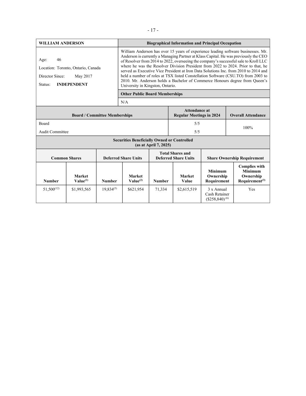 - 17 - WILLIAM ANDERSON Biographical Information and Principal Occupation William Anderson has over 15 years of experience leading software businesses. Mr. Anderson is currently a Managing Partner at Klass Capital. He was previously the CEO of Resolver from 2014 to 2022, overseeing the company’s successful sale to Kroll LLC where he was the Resolver Division President from 2022 to 2024. Prior to that, he served as Executive Vice President at Iron Data Solutions Inc. from 2010 to 2014 and held a number of roles at TSX listed Constellation Software (CSU.TO) from 2003 to 2010. Mr. Anderson holds a Bachelor of Commerce Honours degree from Queen’s University in Kingston, Ontario. Age: 46 Location: Toronto, Ontario, Canada Director Since: May 2017 Status: INDEPENDENT Other Public Board Memberships N/A Board / Committee Memberships Attendance at Regular Meetings in 2024 Overall Attendance Board 5/5 100% Audit Committee 5/5 Securities Beneficially Owned or Controlled (as at April 7, 2025) Common Shares Deferred Share Units Total Shares and Deferred Share Units Share Ownership Requirement Number Market Value(1) Number Market Value(2) Number Market Value Minimum Ownership Requirement Complies with Minimum Ownership Requirement(3) 51,500(12) $1,993,565 19,834(5) $621,954 71,334 $2,615,519 3 x Annual Cash Retainer ($258,840) (6) Yes