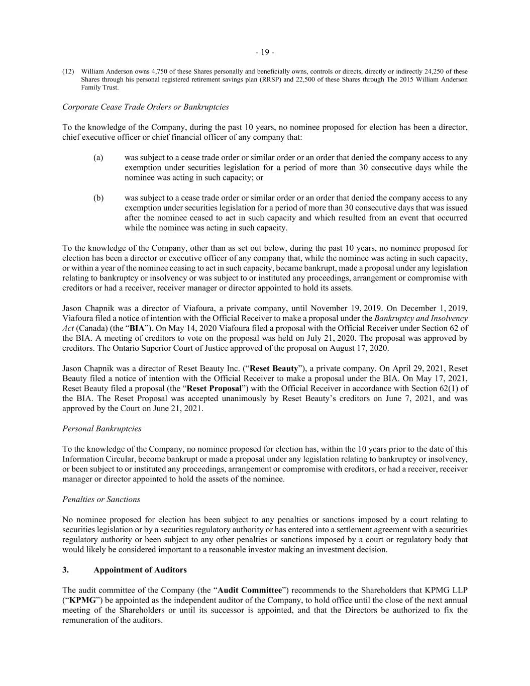 - 19 - (12) William Anderson owns 4,750 of these Shares personally and beneficially owns, controls or directs, directly or indirectly 24,250 of these Shares through his personal registered retirement savings plan (RRSP) and 22,500 of these Shares through The 2015 William Anderson Family Trust. Corporate Cease Trade Orders or Bankruptcies To the knowledge of the Company, during the past 10 years, no nominee proposed for election has been a director, chief executive officer or chief financial officer of any company that: (a) was subject to a cease trade order or similar order or an order that denied the company access to any exemption under securities legislation for a period of more than 30 consecutive days while the nominee was acting in such capacity; or (b) was subject to a cease trade order or similar order or an order that denied the company access to any exemption under securities legislation for a period of more than 30 consecutive days that was issued after the nominee ceased to act in such capacity and which resulted from an event that occurred while the nominee was acting in such capacity. To the knowledge of the Company, other than as set out below, during the past 10 years, no nominee proposed for election has been a director or executive officer of any company that, while the nominee was acting in such capacity, or within a year of the nominee ceasing to act in such capacity, became bankrupt, made a proposal under any legislation relating to bankruptcy or insolvency or was subject to or instituted any proceedings, arrangement or compromise with creditors or had a receiver, receiver manager or director appointed to hold its assets. Jason Chapnik was a director of Viafoura, a private company, until November 19, 2019. On December 1, 2019, Viafoura filed a notice of intention with the Official Receiver to make a proposal under the Bankruptcy and Insolvency Act (Canada) (the “BIA”). On May 14, 2020 Viafoura filed a proposal with the Official Receiver under Section 62 of the BIA. A meeting of creditors to vote on the proposal was held on July 21, 2020. The proposal was approved by creditors. The Ontario Superior Court of Justice approved of the proposal on August 17, 2020. Jason Chapnik was a director of Reset Beauty Inc. (“Reset Beauty”), a private company. On April 29, 2021, Reset Beauty filed a notice of intention with the Official Receiver to make a proposal under the BIA. On May 17, 2021, Reset Beauty filed a proposal (the “Reset Proposal”) with the Official Receiver in accordance with Section 62(1) of the BIA. The Reset Proposal was accepted unanimously by Reset Beauty’s creditors on June 7, 2021, and was approved by the Court on June 21, 2021. Personal Bankruptcies To the knowledge of the Company, no nominee proposed for election has, within the 10 years prior to the date of this Information Circular, become bankrupt or made a proposal under any legislation relating to bankruptcy or insolvency, or been subject to or instituted any proceedings, arrangement or compromise with creditors, or had a receiver, receiver manager or director appointed to hold the assets of the nominee. Penalties or Sanctions No nominee proposed for election has been subject to any penalties or sanctions imposed by a court relating to securities legislation or by a securities regulatory authority or has entered into a settlement agreement with a securities regulatory authority or been subject to any other penalties or sanctions imposed by a court or regulatory body that would likely be considered important to a reasonable investor making an investment decision. 3. Appointment of Auditors The audit committee of the Company (the “Audit Committee”) recommends to the Shareholders that KPMG LLP (“KPMG”) be appointed as the independent auditor of the Company, to hold office until the close of the next annual meeting of the Shareholders or until its successor is appointed, and that the Directors be authorized to fix the remuneration of the auditors.