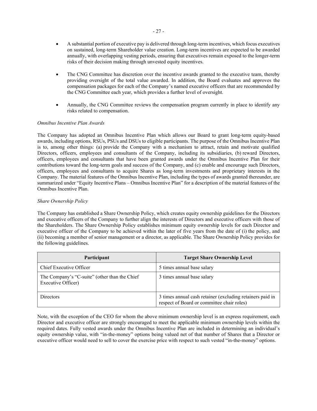 - 27 - • A substantial portion of executive pay is delivered through long-term incentives, which focus executives on sustained, long-term Shareholder value creation. Long-term incentives are expected to be awarded annually, with overlapping vesting periods, ensuring that executives remain exposed to the longer-term risks of their decision making through unvested equity incentives. • The CNG Committee has discretion over the incentive awards granted to the executive team, thereby providing oversight of the total value awarded. In addition, the Board evaluates and approves the compensation packages for each of the Company’s named executive officers that are recommended by the CNG Committee each year, which provides a further level of oversight. • Annually, the CNG Committee reviews the compensation program currently in place to identify any risks related to compensation. Omnibus Incentive Plan Awards The Company has adopted an Omnibus Incentive Plan which allows our Board to grant long-term equity-based awards, including options, RSUs, PSUs and DSUs to eligible participants. The purpose of the Omnibus Incentive Plan is to, among other things: (a) provide the Company with a mechanism to attract, retain and motivate qualified Directors, officers, employees and consultants of the Company, including its subsidiaries, (b) reward Directors, officers, employees and consultants that have been granted awards under the Omnibus Incentive Plan for their contributions toward the long-term goals and success of the Company, and (c) enable and encourage such Directors, officers, employees and consultants to acquire Shares as long-term investments and proprietary interests in the Company. The material features of the Omnibus Incentive Plan, including the types of awards granted thereunder, are summarized under “Equity Incentive Plans – Omnibus Incentive Plan” for a description of the material features of the Omnibus Incentive Plan. Share Ownership Policy The Company has established a Share Ownership Policy, which creates equity ownership guidelines for the Directors and executive officers of the Company to further align the interests of Directors and executive officers with those of the Shareholders. The Share Ownership Policy establishes minimum equity ownership levels for each Director and executive officer of the Company to be achieved within the later of five years from the date of (i) the policy, and (ii) becoming a member of senior management or a director, as applicable. The Share Ownership Policy provides for the following guidelines. Participant Target Share Ownership Level Chief Executive Officer 5 times annual base salary The Company’s “C-suite” (other than the Chief Executive Officer) 3 times annual base salary Directors 3 times annual cash retainer (excluding retainers paid in respect of Board or committee chair roles) Note, with the exception of the CEO for whom the above minimum ownership level is an express requirement, each Director and executive officer are strongly encouraged to meet the applicable minimum ownership levels within the required dates. Fully vested awards under the Omnibus Incentive Plan are included in determining an individual’s equity ownership value, with “in-the-money” options being valued net of that number of Shares that a Director or executive officer would need to sell to cover the exercise price with respect to such vested “in-the-money” options.