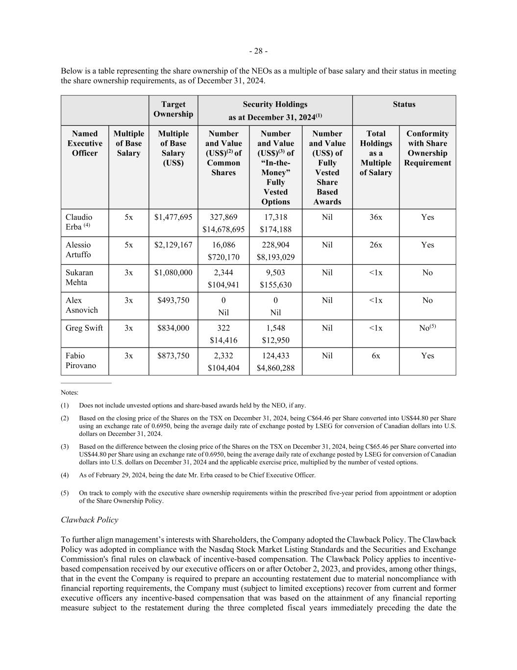 - 28 - Below is a table representing the share ownership of the NEOs as a multiple of base salary and their status in meeting the share ownership requirements, as of December 31, 2024. Target Ownership Security Holdings as at December 31, 2024(1) Status Named Executive Officer Multiple of Base Salary Multiple of Base Salary (US$) Number and Value (US$)(2) of Common Shares Number and Value (US$)(3) of “In-the- Money” Fully Vested Options Number and Value (US$) of Fully Vested Share Based Awards Total Holdings as a Multiple of Salary Conformity with Share Ownership Requirement Claudio Erba (4) 5x $1,477,695 327,869 $14,678,695 17,318 $174,188 Nil 36x Yes Alessio Artuffo 5x $2,129,167 16,086 $720,170 228,904 $8,193,029 Nil 26x Yes Sukaran Mehta 3x $1,080,000 2,344 $104,941 9,503 $155,630 Nil <1x No Alex Asnovich 3x $493,750 0 Nil 0 Nil Nil <1x No Greg Swift 3x $834,000 322 $14,416 1,548 $12,950 Nil <1x No(5) Fabio Pirovano 3x $873,750 2,332 $104,404 124,433 $4,860,288 Nil 6x Yes _______________ Notes: (1) Does not include unvested options and share-based awards held by the NEO, if any. (2) Based on the closing price of the Shares on the TSX on December 31, 2024, being C$64.46 per Share converted into US$44.80 per Share using an exchange rate of 0.6950, being the average daily rate of exchange posted by LSEG for conversion of Canadian dollars into U.S. dollars on December 31, 2024. (3) Based on the difference between the closing price of the Shares on the TSX on December 31, 2024, being C$65.46 per Share converted into US$44.80 per Share using an exchange rate of 0.6950, being the average daily rate of exchange posted by LSEG for conversion of Canadian dollars into U.S. dollars on December 31, 2024 and the applicable exercise price, multiplied by the number of vested options. (4) As of February 29, 2024, being the date Mr. Erba ceased to be Chief Executive Officer. (5) On track to comply with the executive share ownership requirements within the prescribed five-year period from appointment or adoption of the Share Ownership Policy. Clawback Policy To further align management’s interests with Shareholders, the Company adopted the Clawback Policy. The Clawback Policy was adopted in compliance with the Nasdaq Stock Market Listing Standards and the Securities and Exchange Commission's final rules on clawback of incentive-based compensation. The Clawback Policy applies to incentive- based compensation received by our executive officers on or after October 2, 2023, and provides, among other things, that in the event the Company is required to prepare an accounting restatement due to material noncompliance with financial reporting requirements, the Company must (subject to limited exceptions) recover from current and former executive officers any incentive-based compensation that was based on the attainment of any financial reporting measure subject to the restatement during the three completed fiscal years immediately preceding the date the