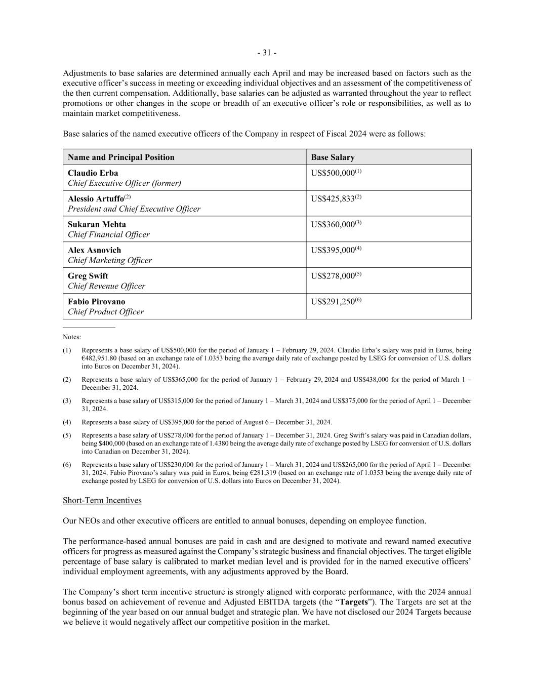 - 31 - Adjustments to base salaries are determined annually each April and may be increased based on factors such as the executive officer’s success in meeting or exceeding individual objectives and an assessment of the competitiveness of the then current compensation. Additionally, base salaries can be adjusted as warranted throughout the year to reflect promotions or other changes in the scope or breadth of an executive officer’s role or responsibilities, as well as to maintain market competitiveness. Base salaries of the named executive officers of the Company in respect of Fiscal 2024 were as follows: Name and Principal Position Base Salary Claudio Erba Chief Executive Officer (former) US$500,000(1) Alessio Artuffo(2) President and Chief Executive Officer US$425,833(2) Sukaran Mehta Chief Financial Officer US$360,000(3) Alex Asnovich Chief Marketing Officer US$395,000(4) Greg Swift Chief Revenue Officer US$278,000(5) Fabio Pirovano Chief Product Officer US$291,250(6) _______________ Notes: (1) Represents a base salary of US$500,000 for the period of January 1 – February 29, 2024. Claudio Erba’s salary was paid in Euros, being €482,951.80 (based on an exchange rate of 1.0353 being the average daily rate of exchange posted by LSEG for conversion of U.S. dollars into Euros on December 31, 2024). (2) Represents a base salary of US$365,000 for the period of January 1 – February 29, 2024 and US$438,000 for the period of March 1 – December 31, 2024. (3) Represents a base salary of US$315,000 for the period of January 1 – March 31, 2024 and US$375,000 for the period of April 1 – December 31, 2024. (4) Represents a base salary of US$395,000 for the period of August 6 – December 31, 2024. (5) Represents a base salary of US$278,000 for the period of January 1 – December 31, 2024. Greg Swift’s salary was paid in Canadian dollars, being $400,000 (based on an exchange rate of 1.4380 being the average daily rate of exchange posted by LSEG for conversion of U.S. dollars into Canadian on December 31, 2024). (6) Represents a base salary of US$230,000 for the period of January 1 – March 31, 2024 and US$265,000 for the period of April 1 – December 31, 2024. Fabio Pirovano’s salary was paid in Euros, being €281,319 (based on an exchange rate of 1.0353 being the average daily rate of exchange posted by LSEG for conversion of U.S. dollars into Euros on December 31, 2024). Short-Term Incentives Our NEOs and other executive officers are entitled to annual bonuses, depending on employee function. The performance-based annual bonuses are paid in cash and are designed to motivate and reward named executive officers for progress as measured against the Company’s strategic business and financial objectives. The target eligible percentage of base salary is calibrated to market median level and is provided for in the named executive officers’ individual employment agreements, with any adjustments approved by the Board. The Company’s short term incentive structure is strongly aligned with corporate performance, with the 2024 annual bonus based on achievement of revenue and Adjusted EBITDA targets (the “Targets”). The Targets are set at the beginning of the year based on our annual budget and strategic plan. We have not disclosed our 2024 Targets because we believe it would negatively affect our competitive position in the market.